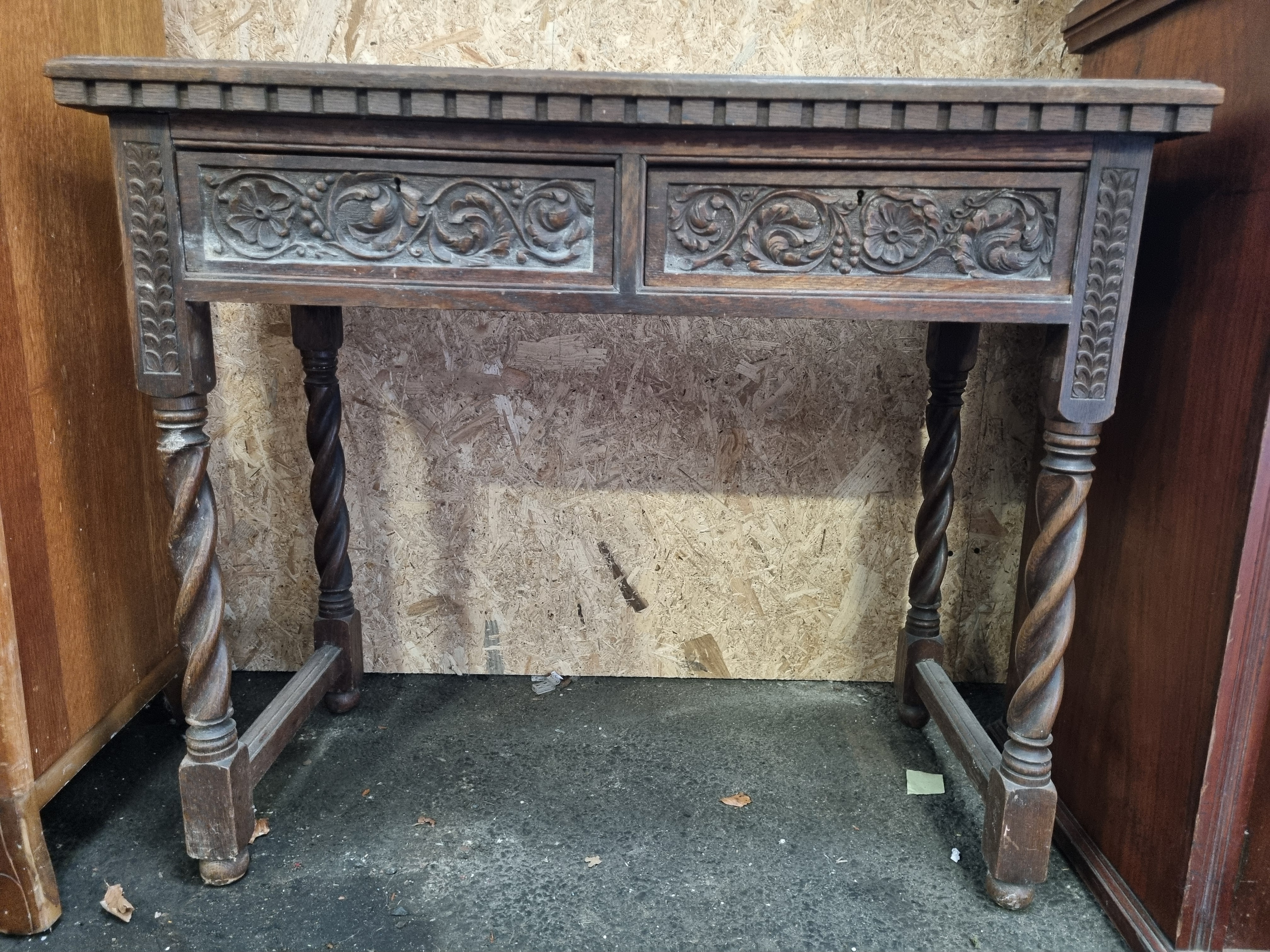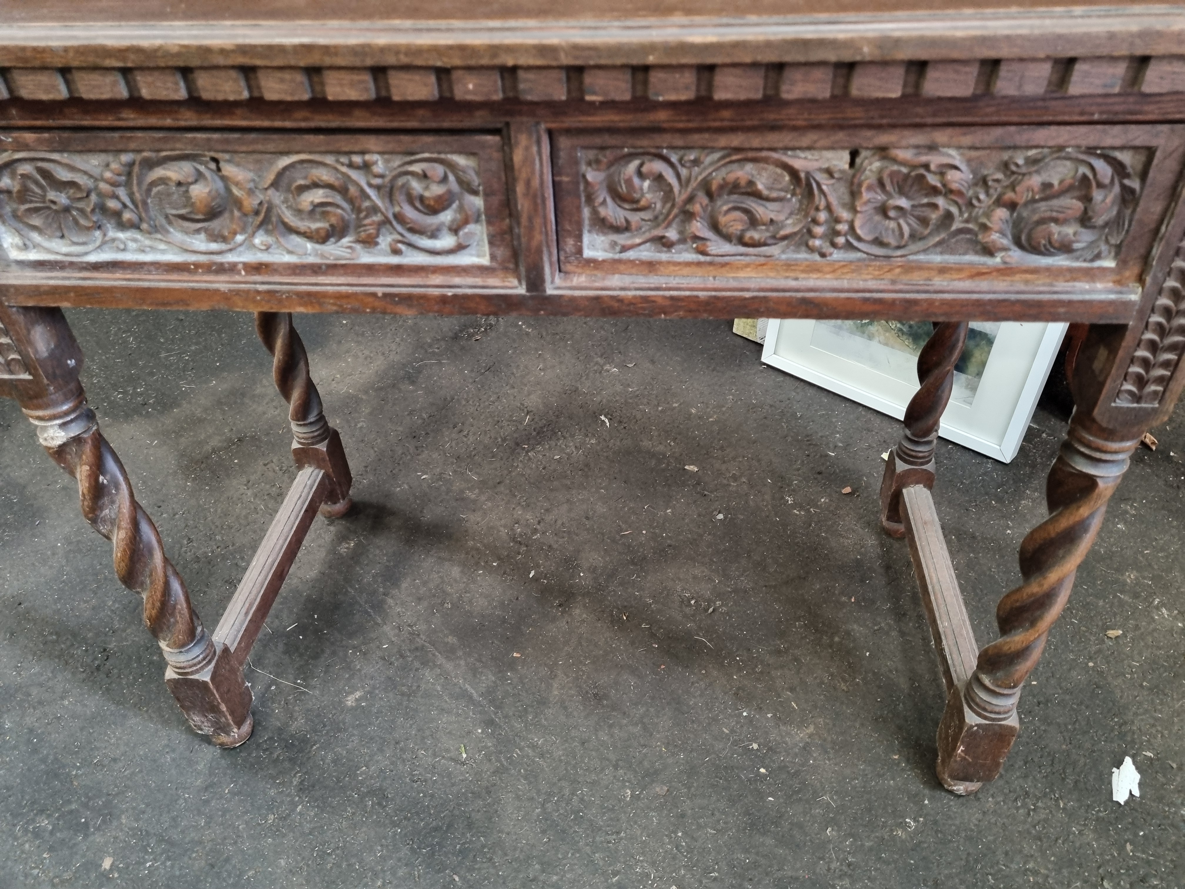 The table is in a used, as-found condition consistent with its age. Surface wear is evident, including scuffs, scratches, and minor knocks to the top edge, legs, and block feet. Both drawers are missing their original hardware, leaving small circular holes in the carved fronts. There is a noticeable accumulation of dust and surface dirt within the recessed areas of the carvings and the barley-twist legs. The piece appears to be structurally sound.