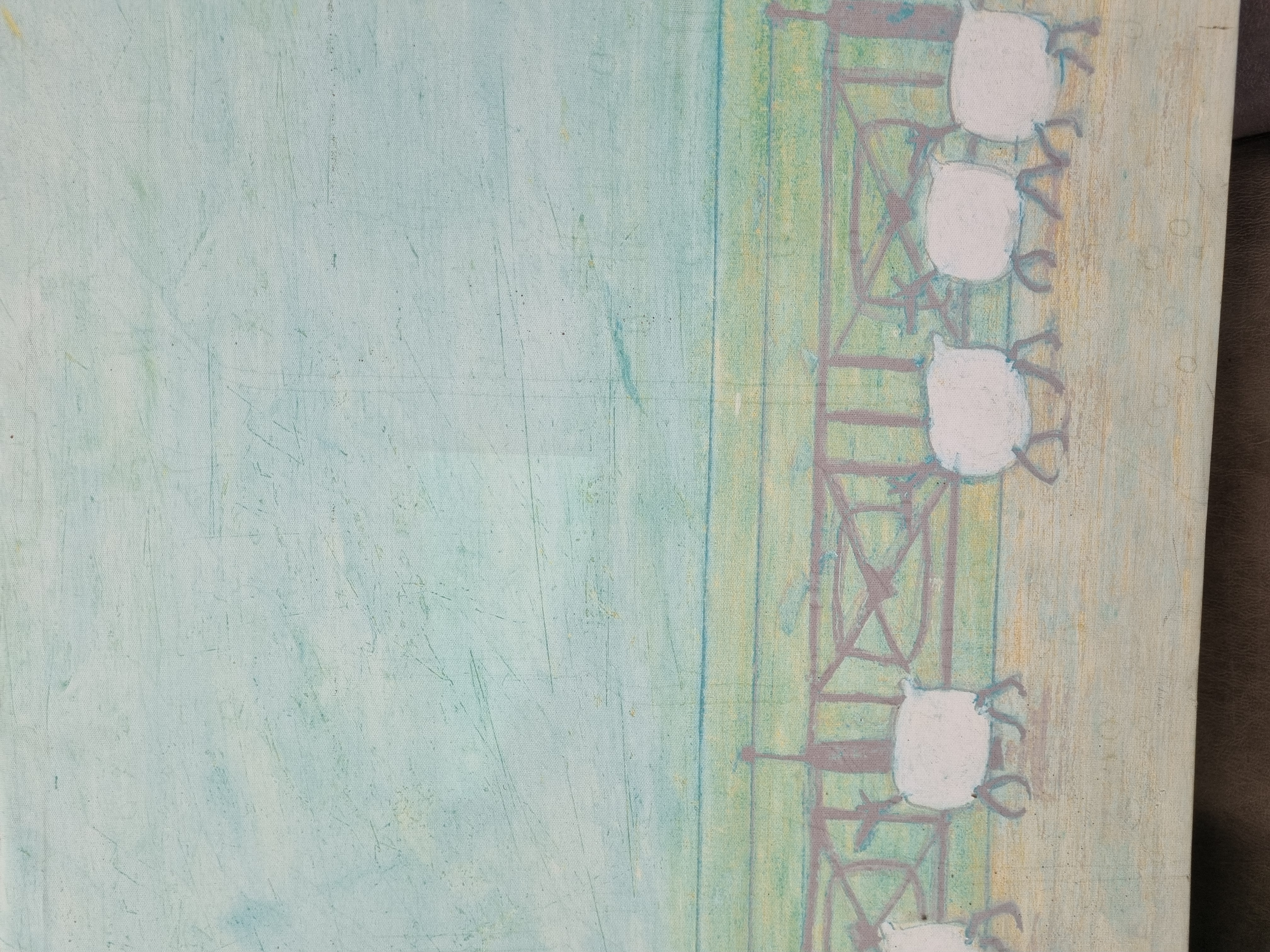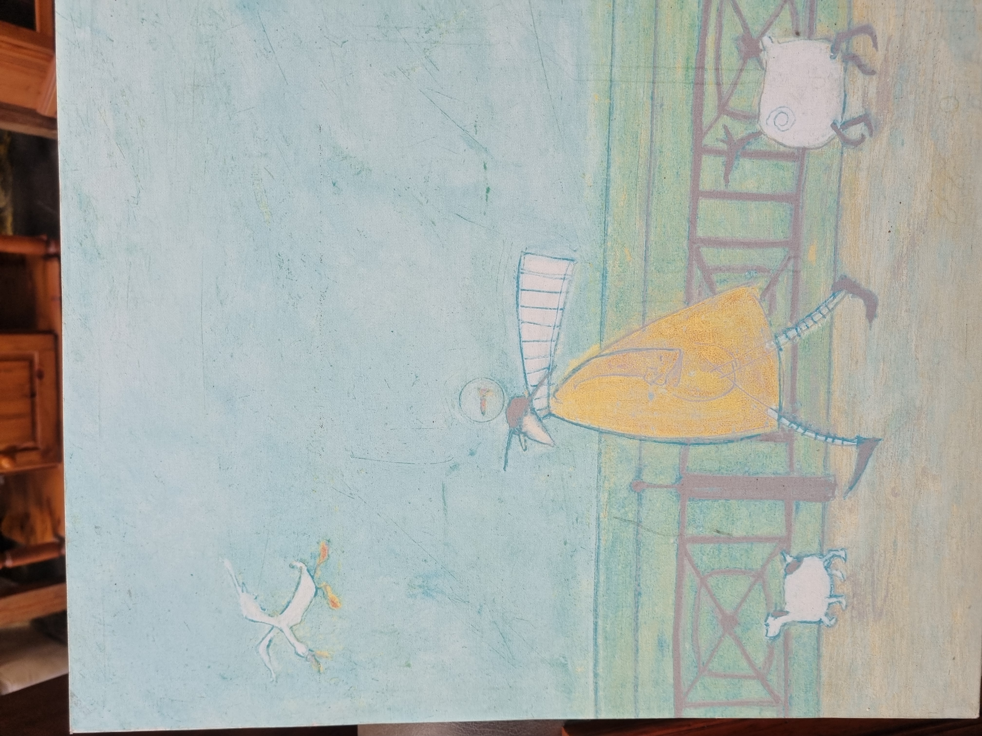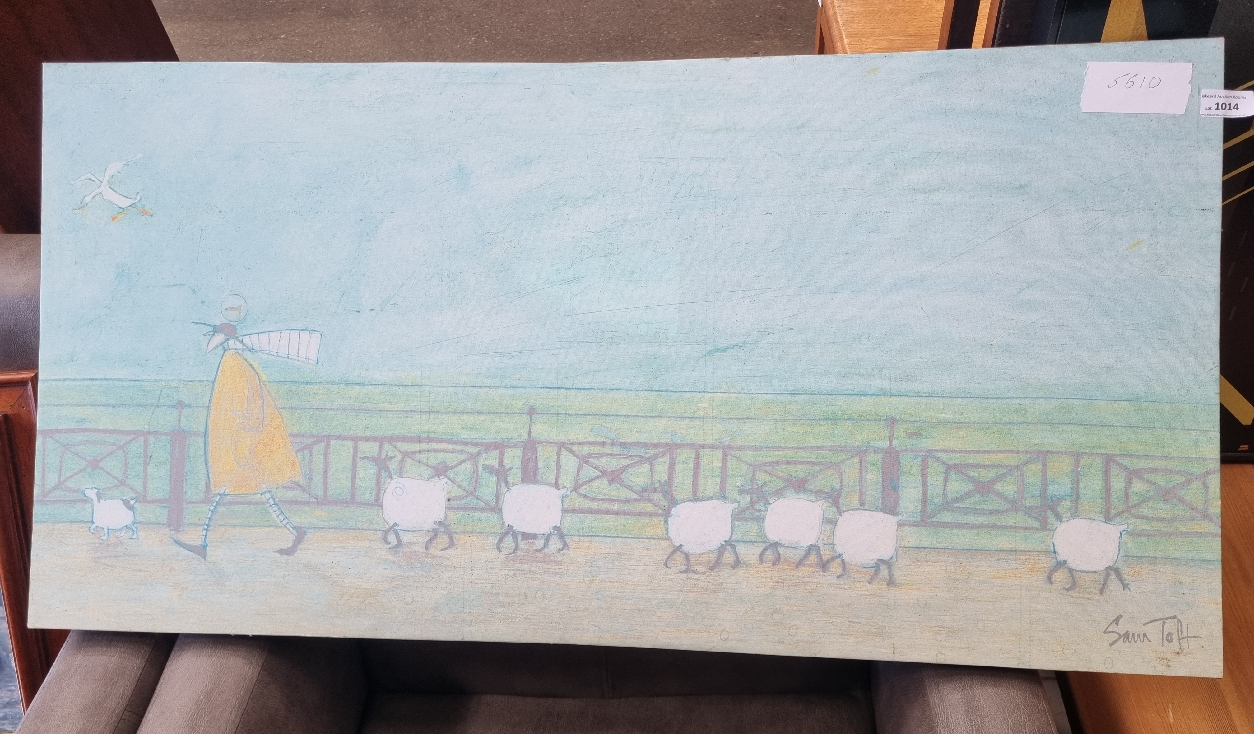 A contemporary mixed media painting on canvas by the artist Sam Toft. The figurative scene depicts the character Mr. Mustard in a long yellow coat and striped hosiery walking along a promenade. He is followed by a group of round, white sheep-like animals behind a decorative railing, with a stylised bird in flight in the upper left. The composition is rendered in a muted palette of pale blue, green, and yellow, using thin applications of paint and visible charcoal or pencil line work. The work is presented on an unframed, gallery-wrapped canvas. Signed Sam Toft in the lower right corner.
