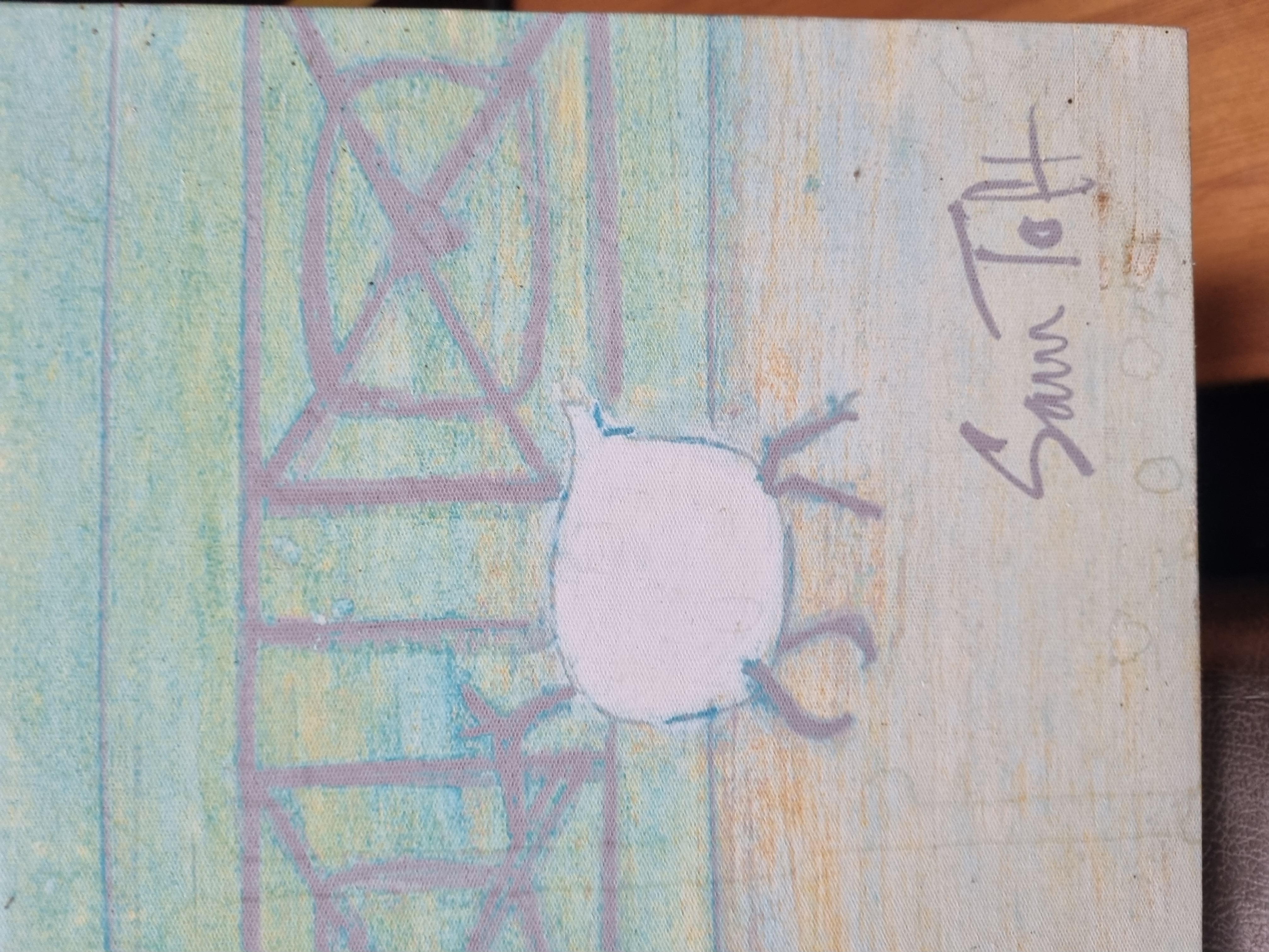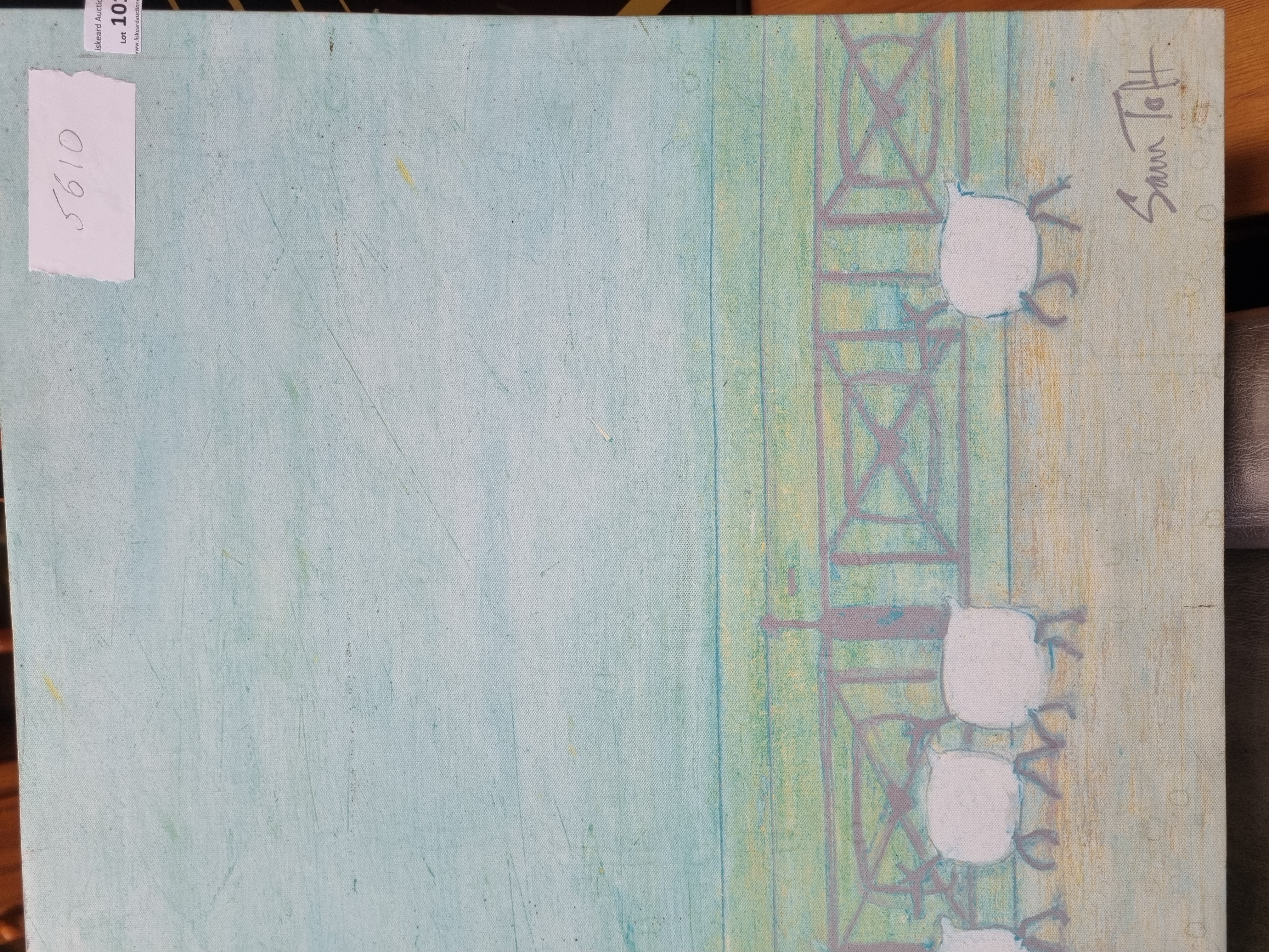 The painting is in generally good condition. There is light surface scuffing visible in the upper background area, which may be characteristic of the artist\'s mixed media technique. Two auction labels are attached to the upper right corner.
