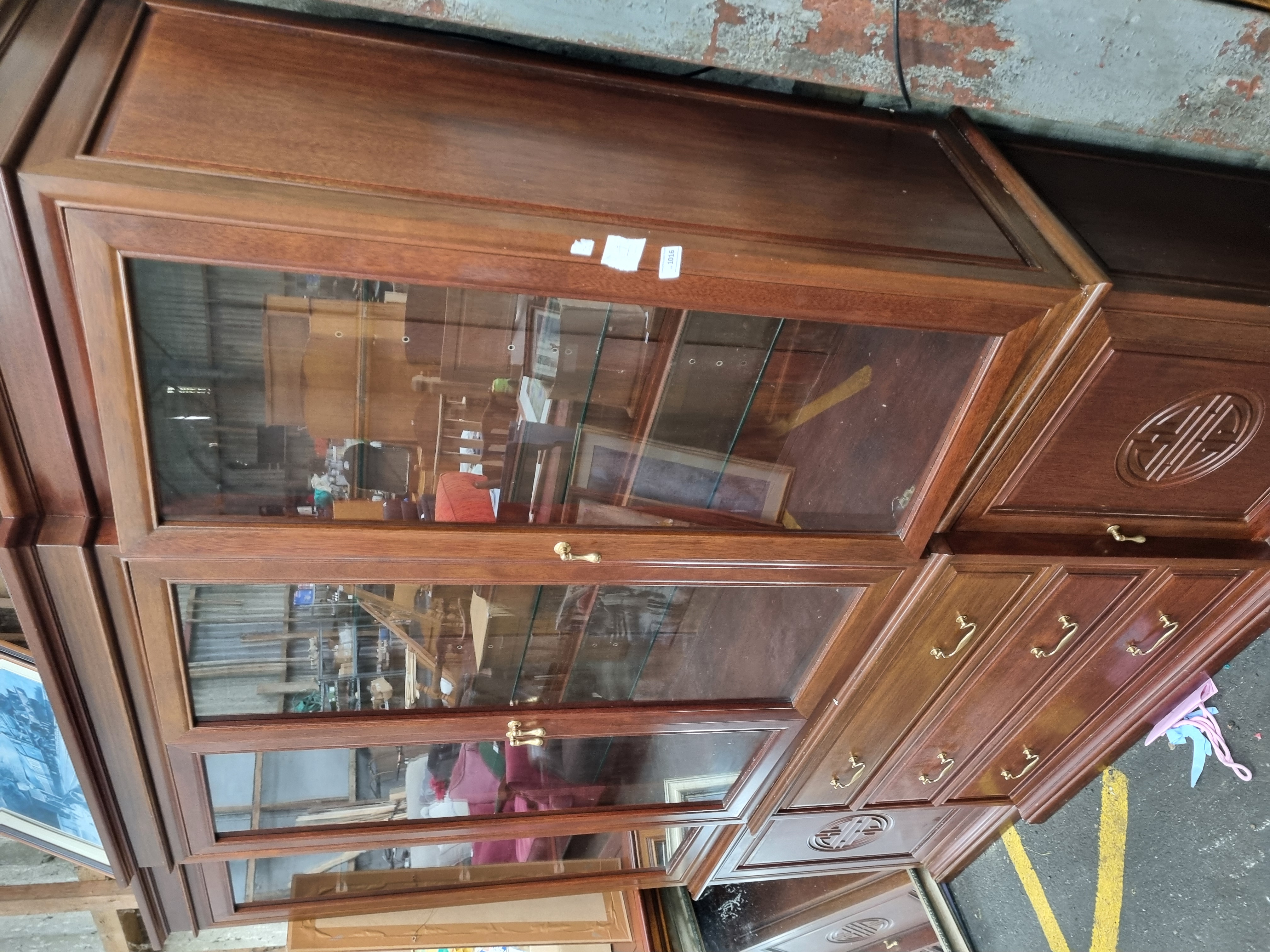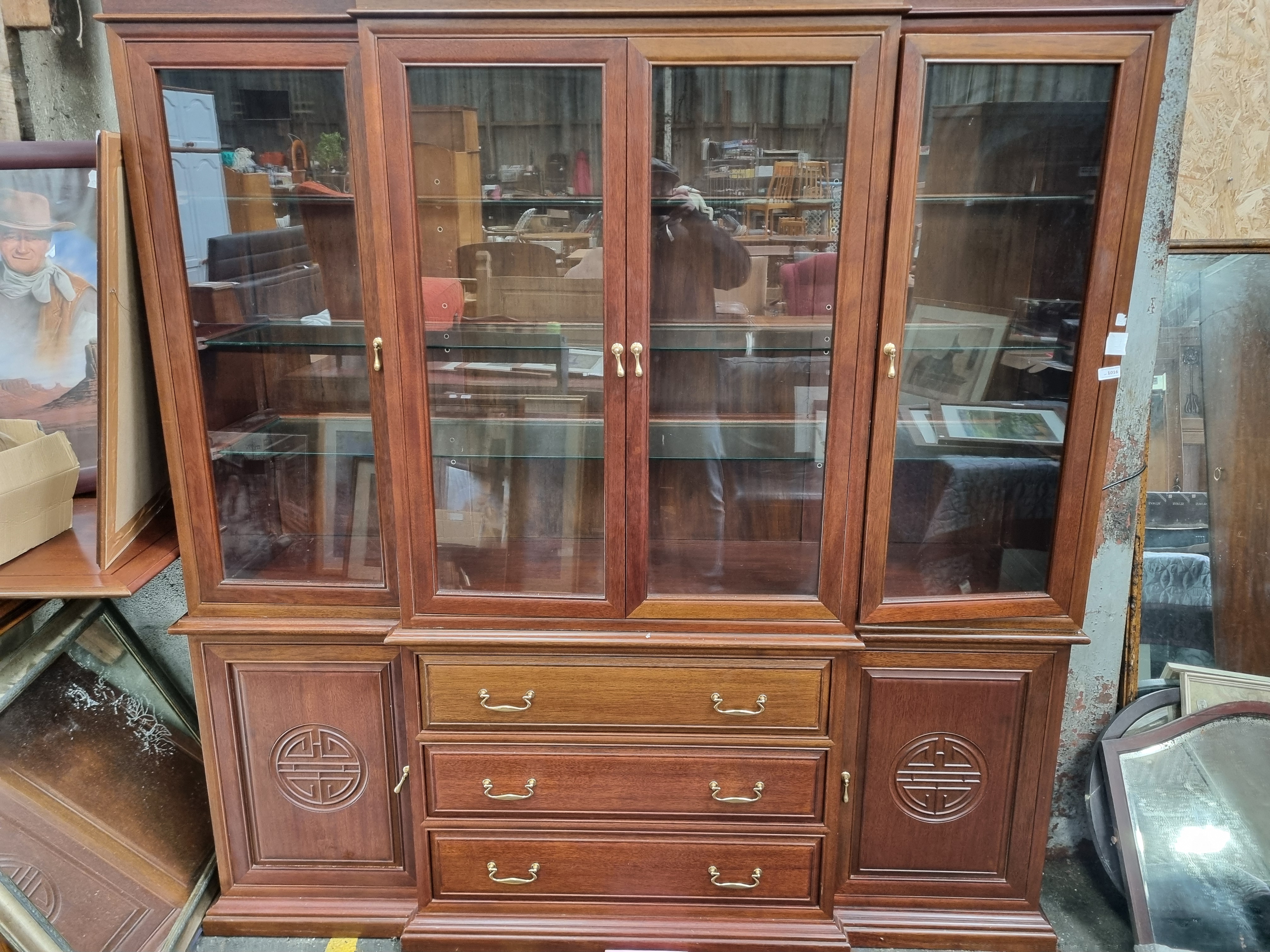 A large two-piece display cabinet in the Chinese taste, constructed from a hardwood with a rich reddish-brown finish. The upper section is fitted with four glazed doors, each housing adjustable glass shelves within. The lower base section contains three central drawers and two side cupboards. Each of the lower cupboard doors is decorated with a large, centrally carved circular Shou longevity symbol in relief. The drawers are fitted with brass swan-neck handles, while the doors feature small brass lever-style pull handles. The construction comprises a glazed upper unit resting on a cupboard base. A small white rectangular sticker with the black printed characters 1016 is located on the right-hand side of the upper section. No manufacturer marks or cabinet maker stamps are visible.