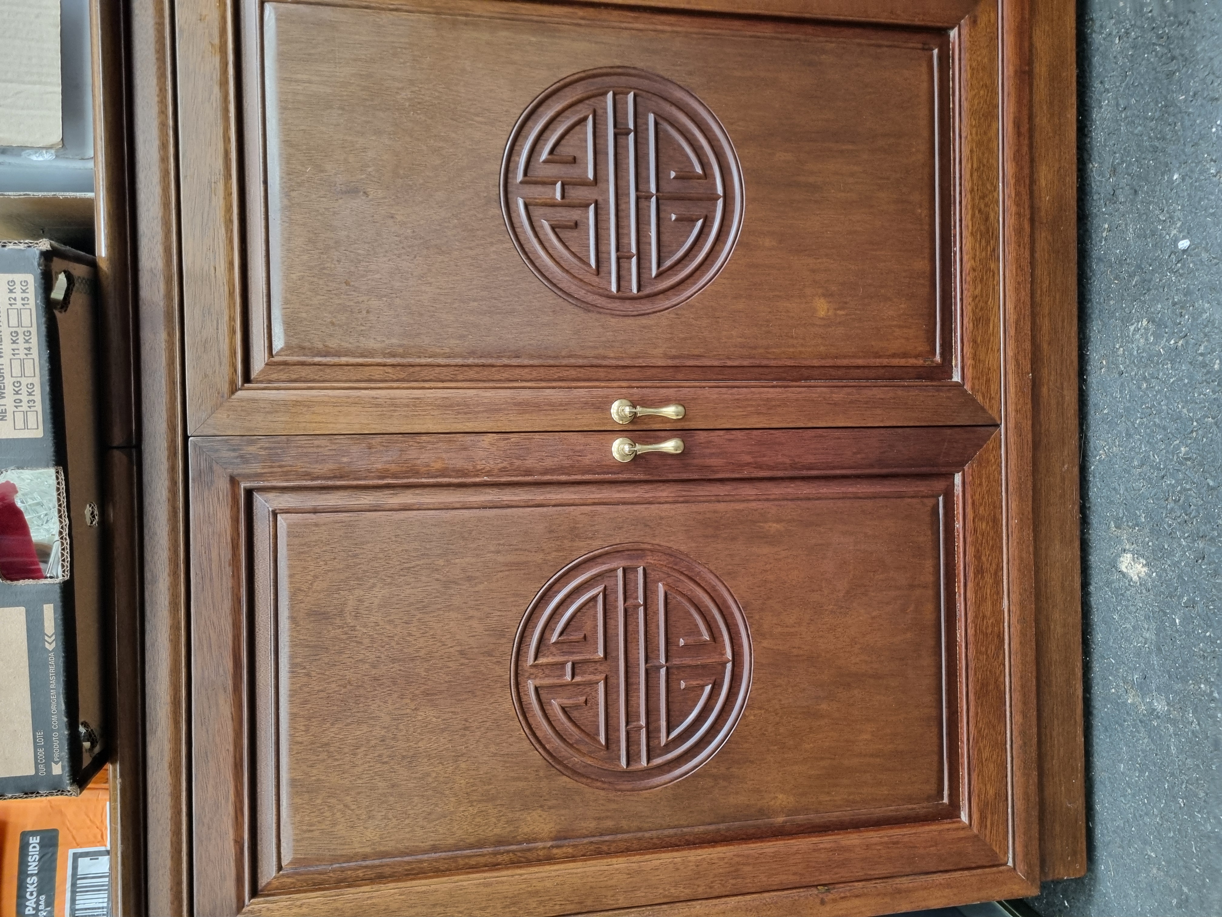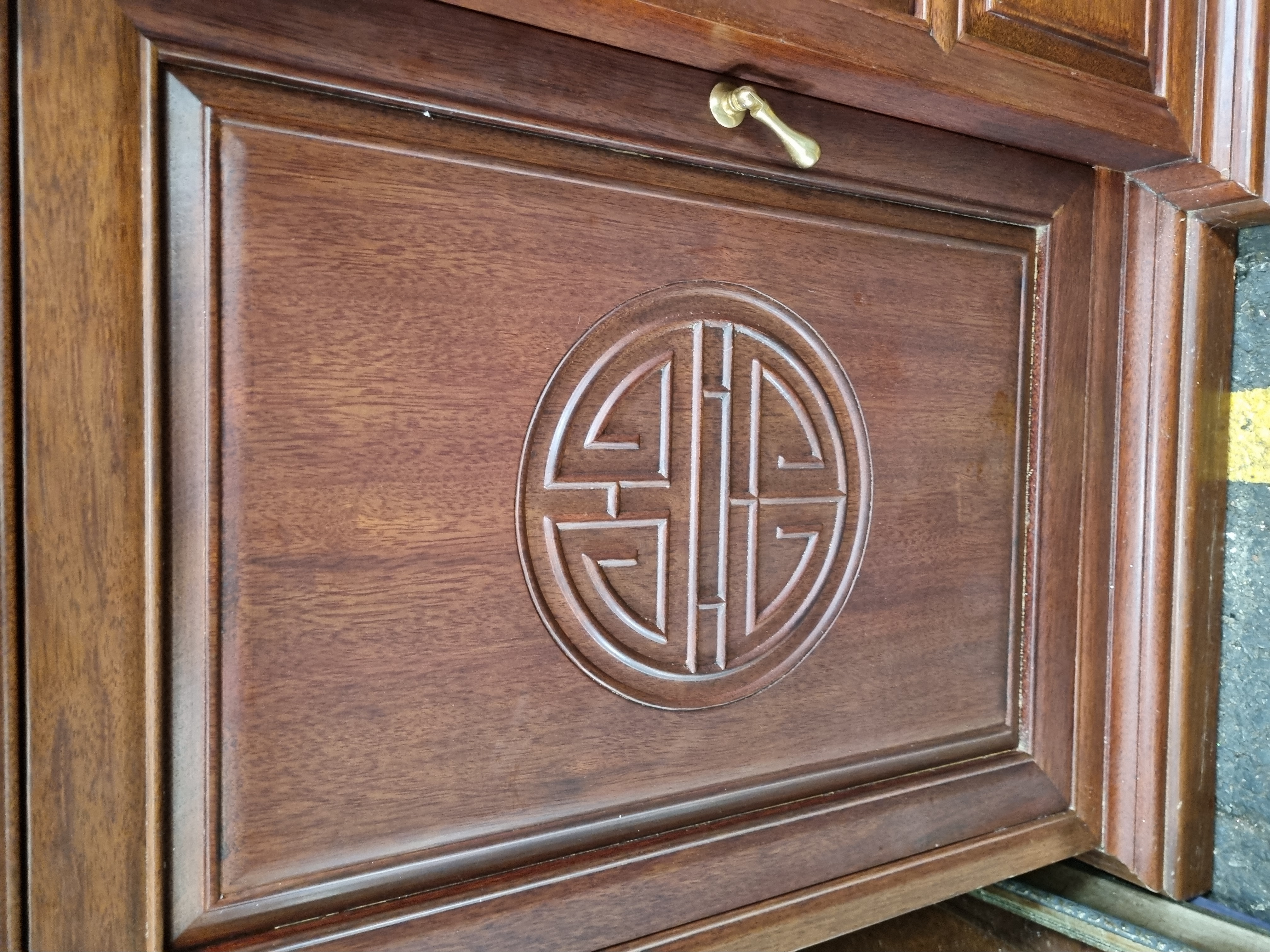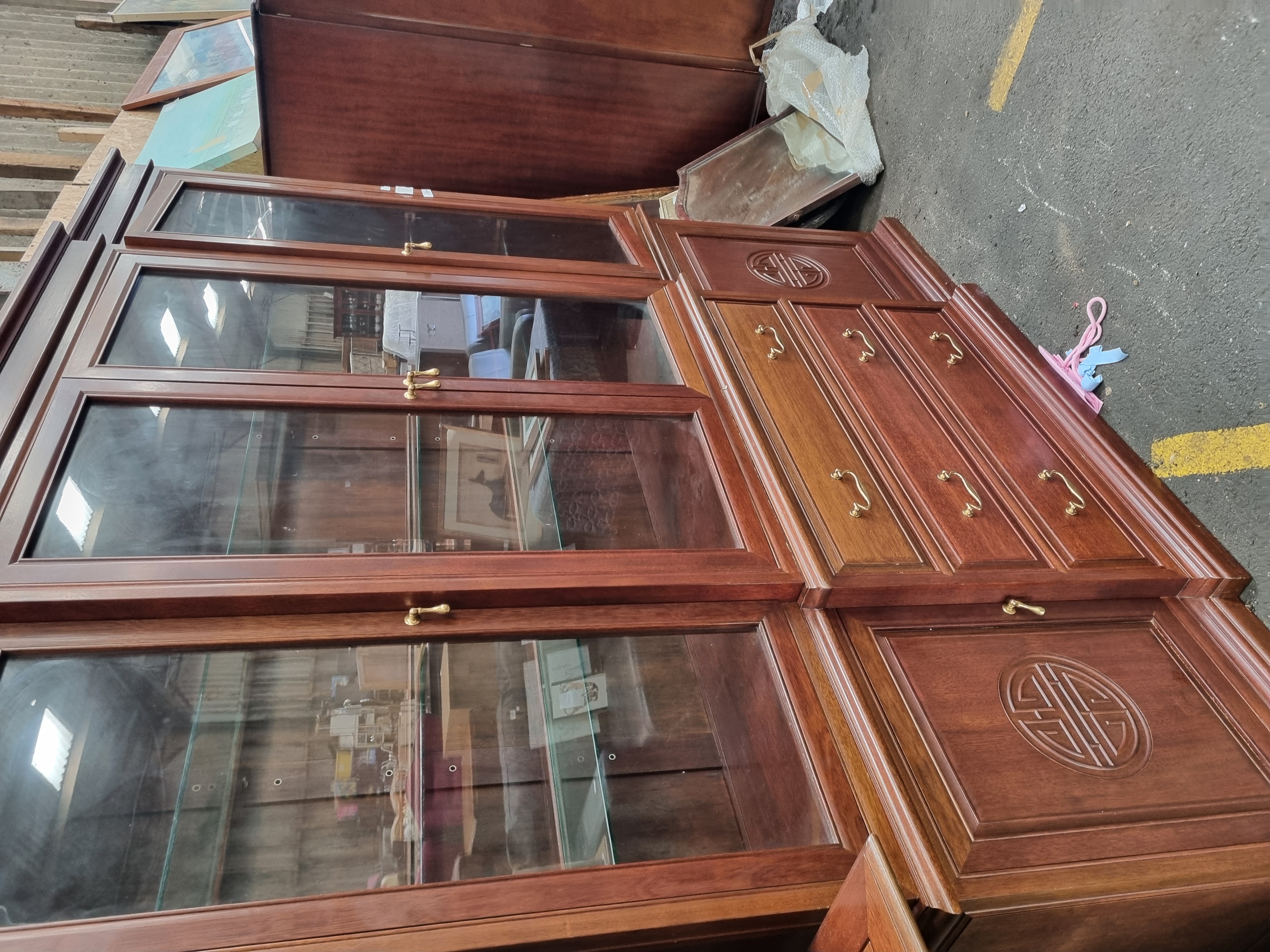 Lot 1016: A large late 20th-century Chinese style hardwood two-piece display cabinet with Shou carvings