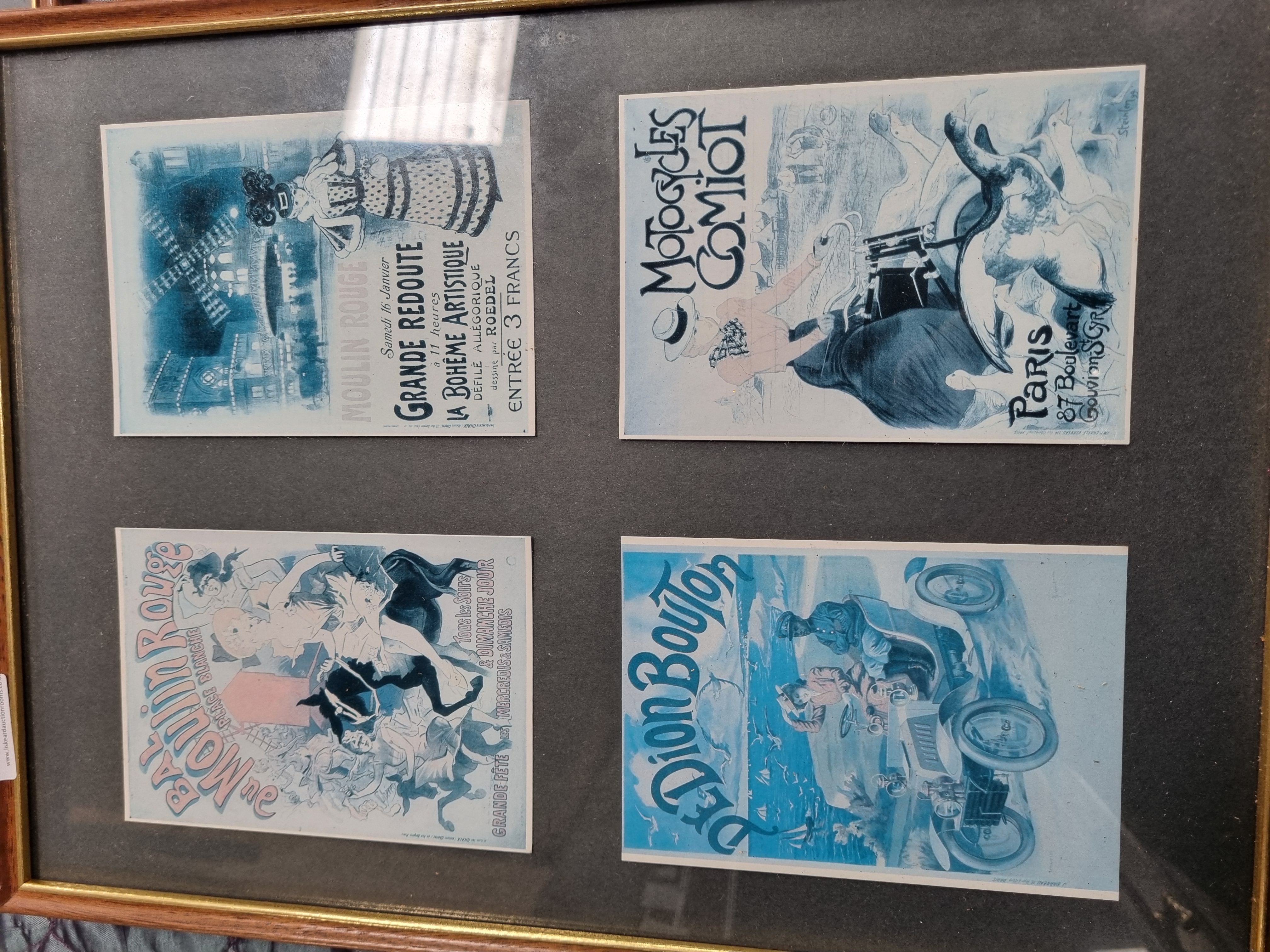 A collection of three framed sets containing miniature reproductions of vintage postcards and posters. Each frame contains four individual prints professionally mounted against a dark grey card background. The first frame displays Belle Époque French advertising art, including works by Auguste Roedel for the Moulin Rouge Grande Redoute, Théophile Steinlen for Motocycles Comiot, and Jules Chéret for the Bal du Moulin Rouge, alongside a De Dion-Bouton automobile advertisement. The second frame focuses on French Alpine tourism for the Paris-Lyon-Méditerranée railway, featuring winter sports, skiing, and landscapes in Chamonix-Mont-Blanc and the Montenvers Mer de Glace rack railway. The third frame depicts Portuguese architectural elements and decorative arts, including blue and white azulejo tile panels showing rural scenes and fountains, a Manueline-style window frame, and a traditional doorway set in green glazed tiles. The prints are modern commercial reproductions of late 19th and early 20th-century designs. Each set is housed in a matching stained wooden frame with a gilt inner slip and protected by glass.
