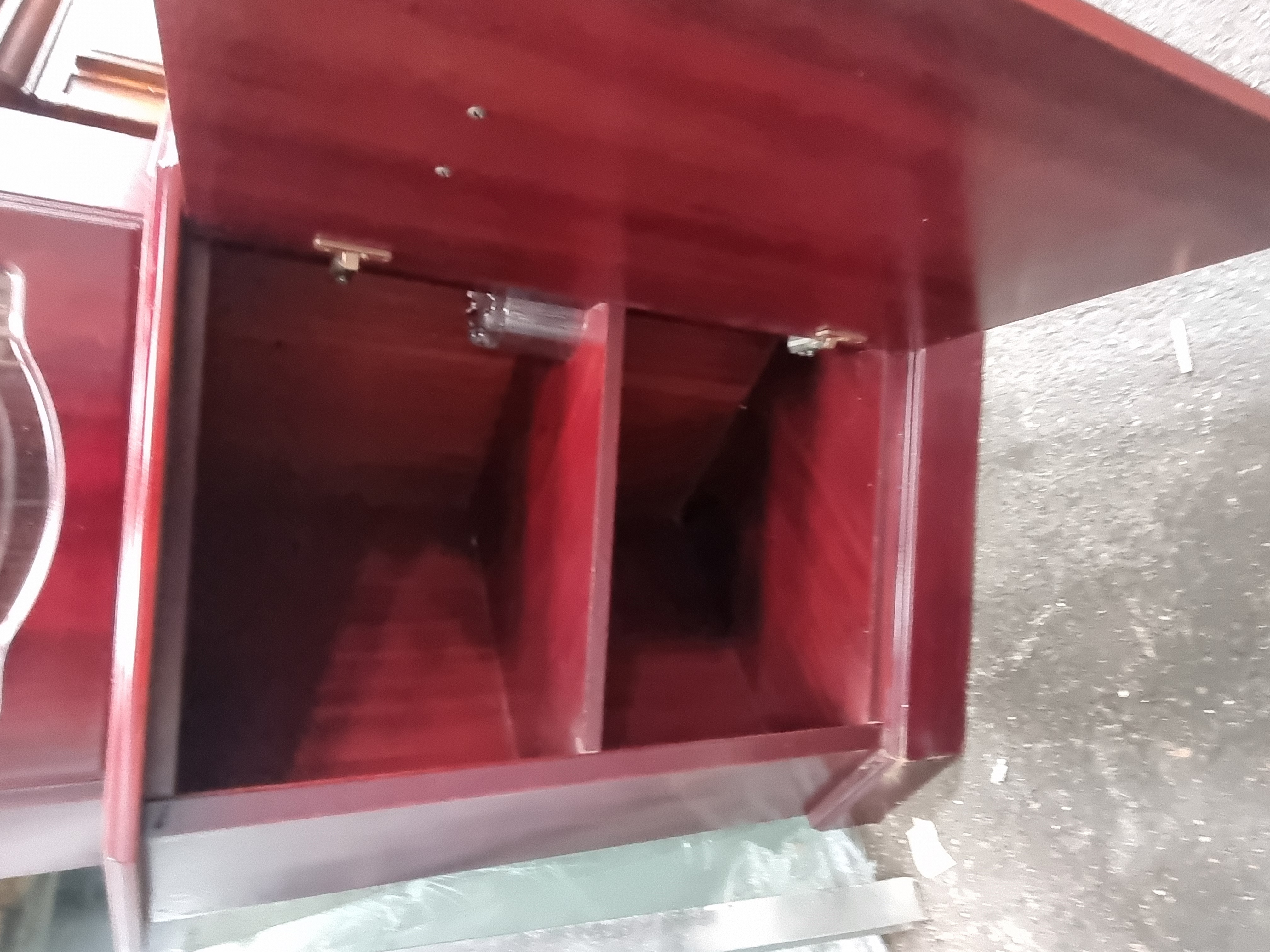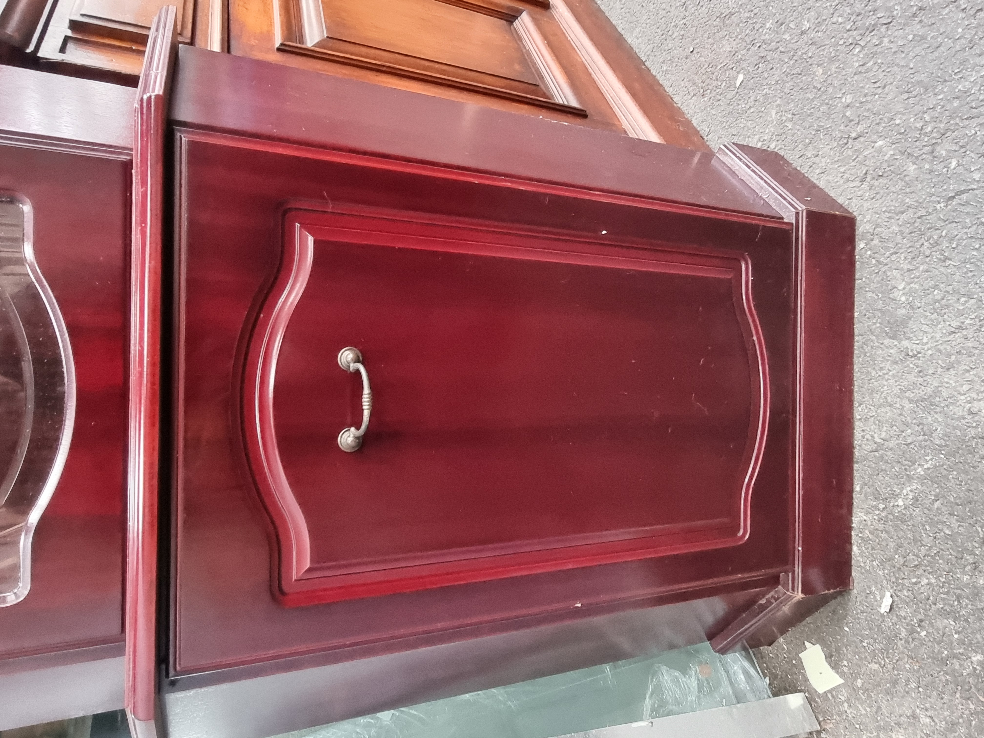 The cabinet is in good used condition with minor surface abrasions and light scratches to the finish consistent with age and use. The glass panels and shelves appear to be free of significant chips or cracks. Hardware is present and functional.