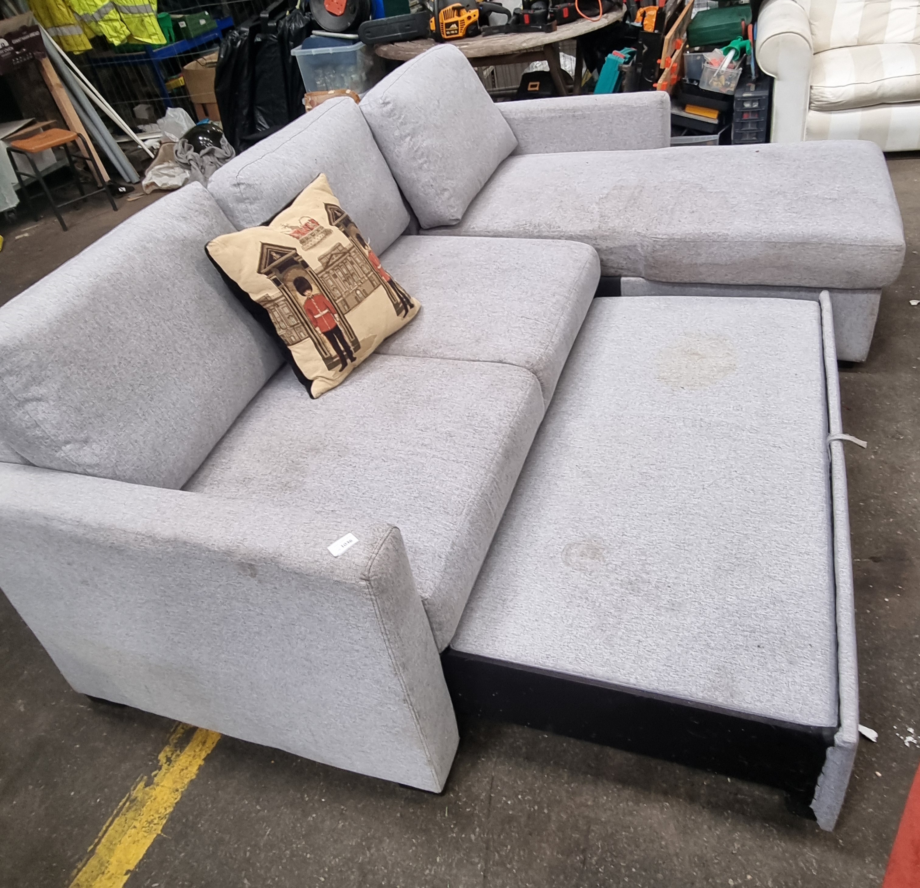 The item is in used condition and requires cleaning. A significant large stain is present on the pull-out bed section, with further smaller marks located on the chaise seat. Leading edges of the armrests show light soiling and signs of wear. The pull-out mechanism appears to be in working order but has not been professionally tested.
