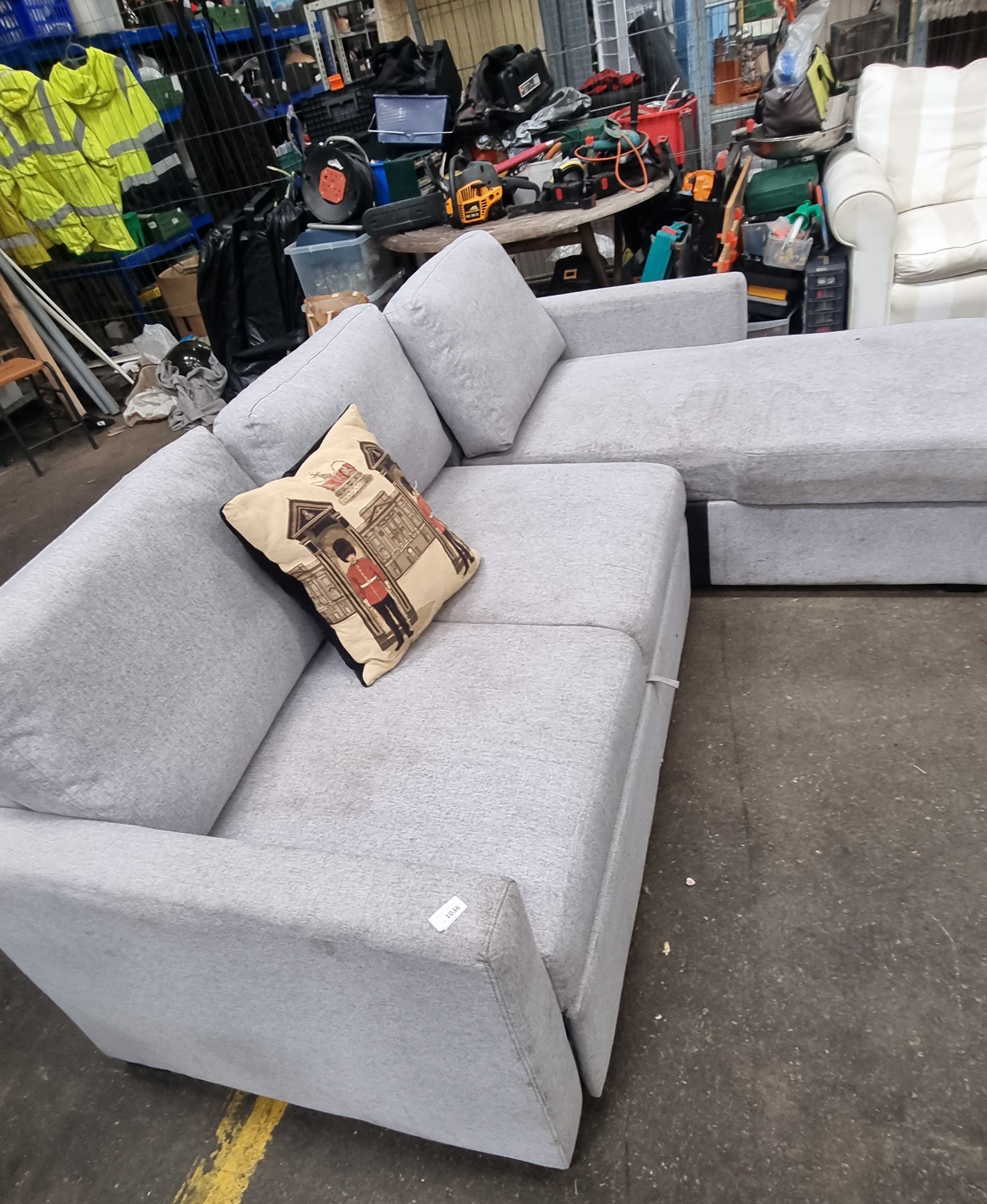 A contemporary corner sofa bed upholstered in a grey woven fabric. The configuration includes a right-hand chaise when facing and three loose back cushions. The unit incorporates a pull-out mechanism that extends from the main seat to create a sleeping surface. Included with the sofa is one decorative scatter cushion depicting a London scene with a Yeoman Warder. The piece lacks visible manufacturer branding or labels, though a temporary auction lot sticker numbered 1036 is present on the left armrest.