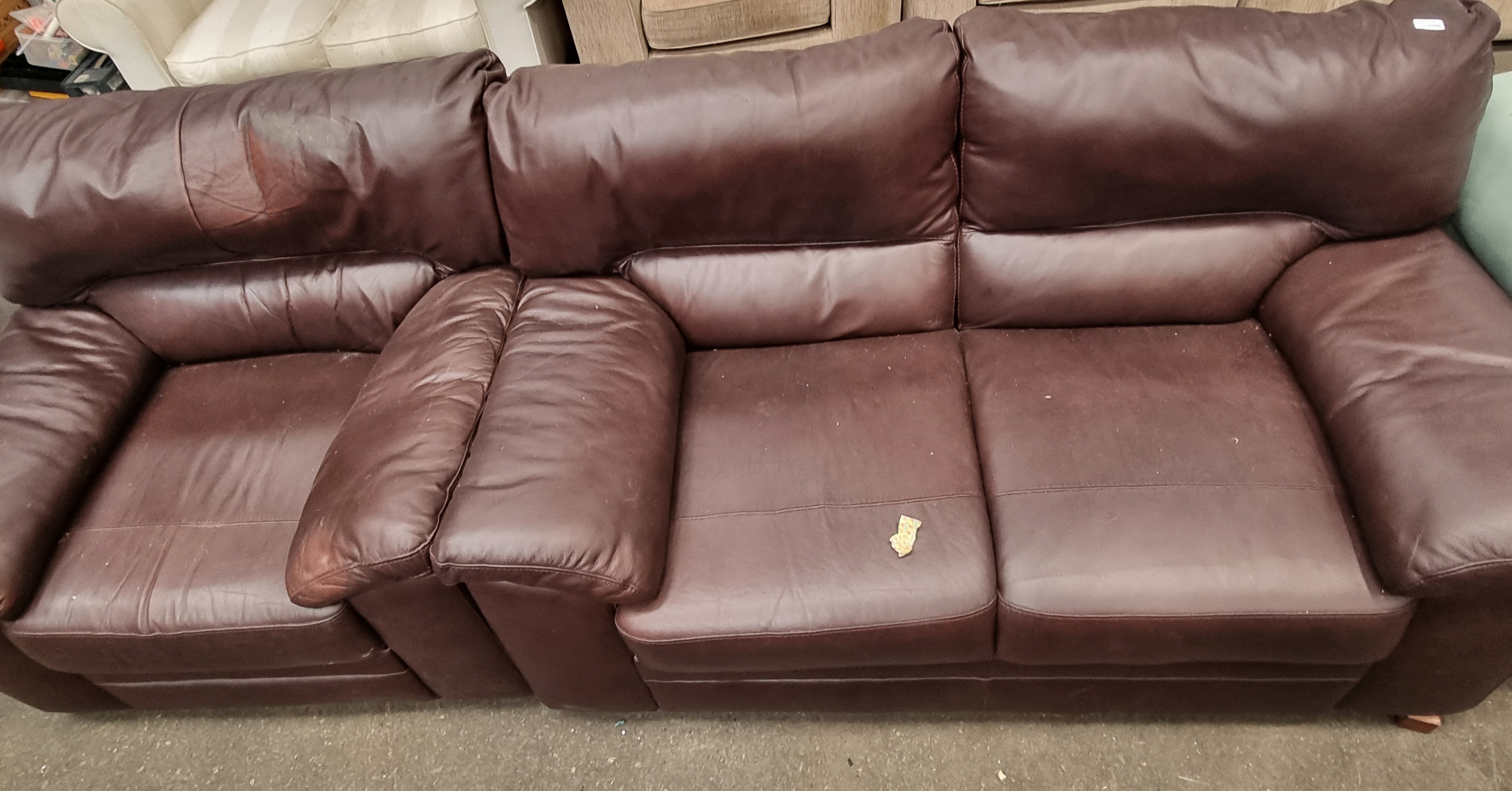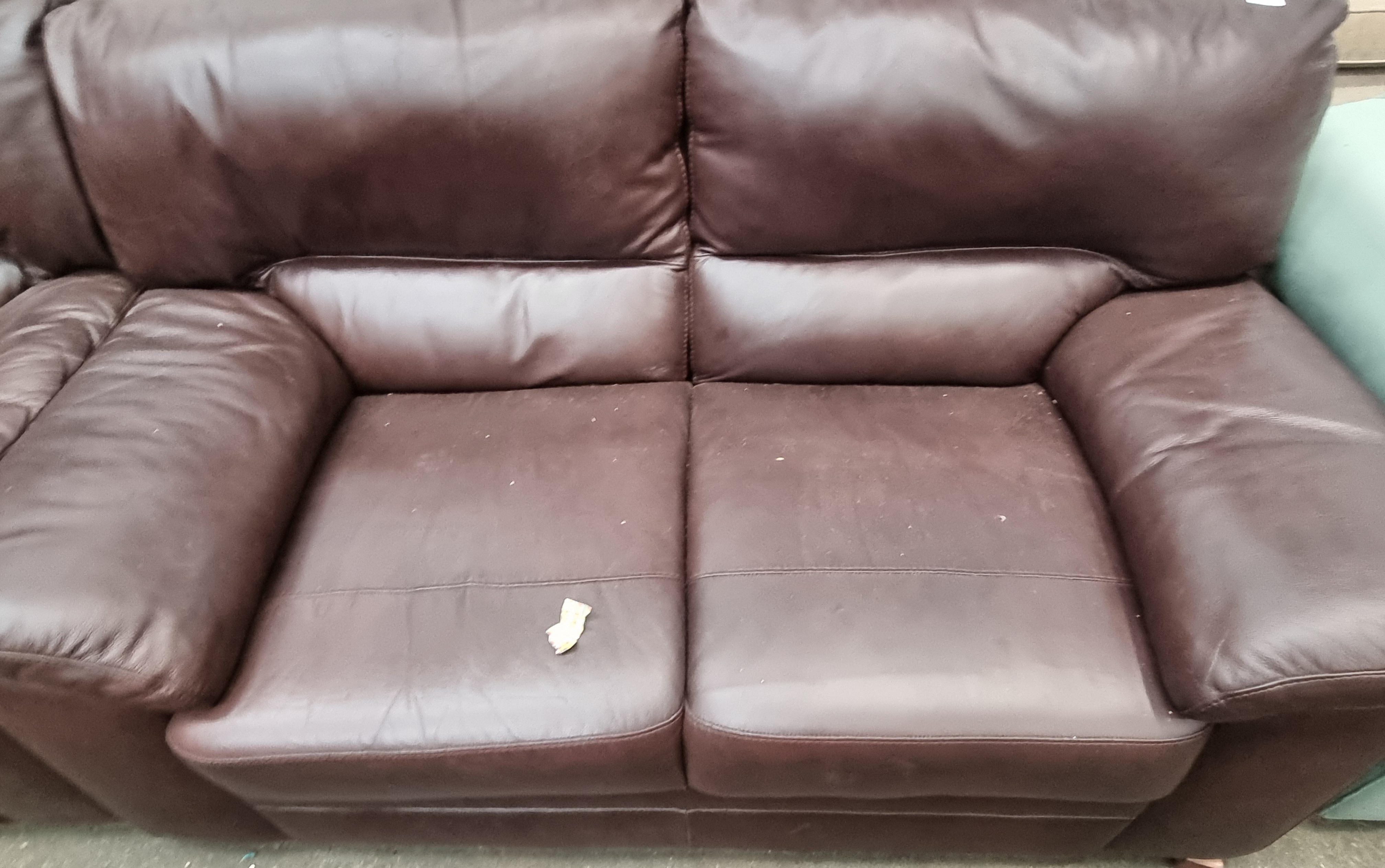 The suite is in heavily used condition with significant signs of wear throughout. There is a large area of surface wear, thinning, and discolouration to the top of the backrest on the armchair. General scuffing and creasing are present throughout the leather upholstery, notably on the armrests and seat cushions. Debris is visible in the crevices. The suite requires professional cleaning and potential restoration to the leather surfaces.