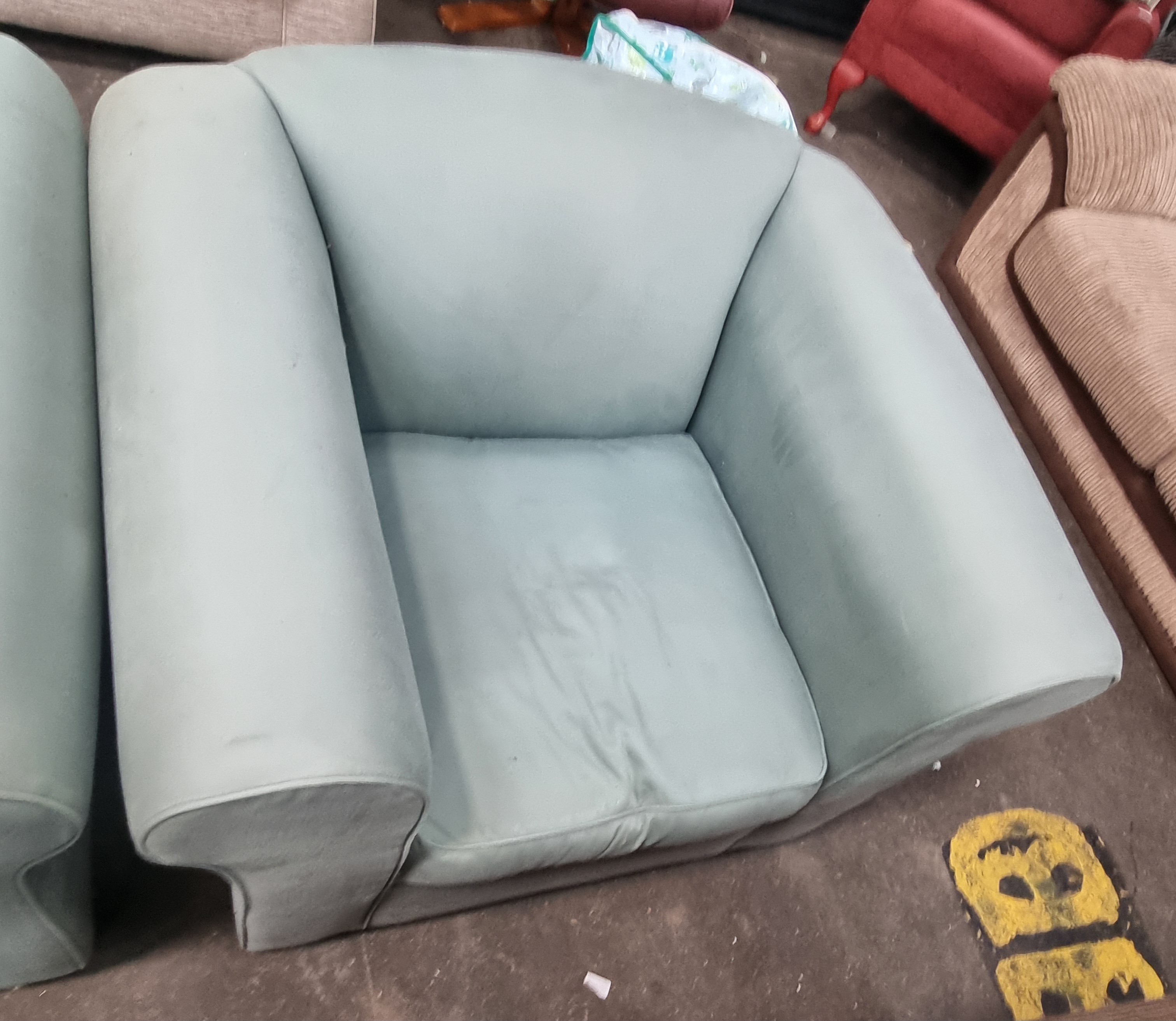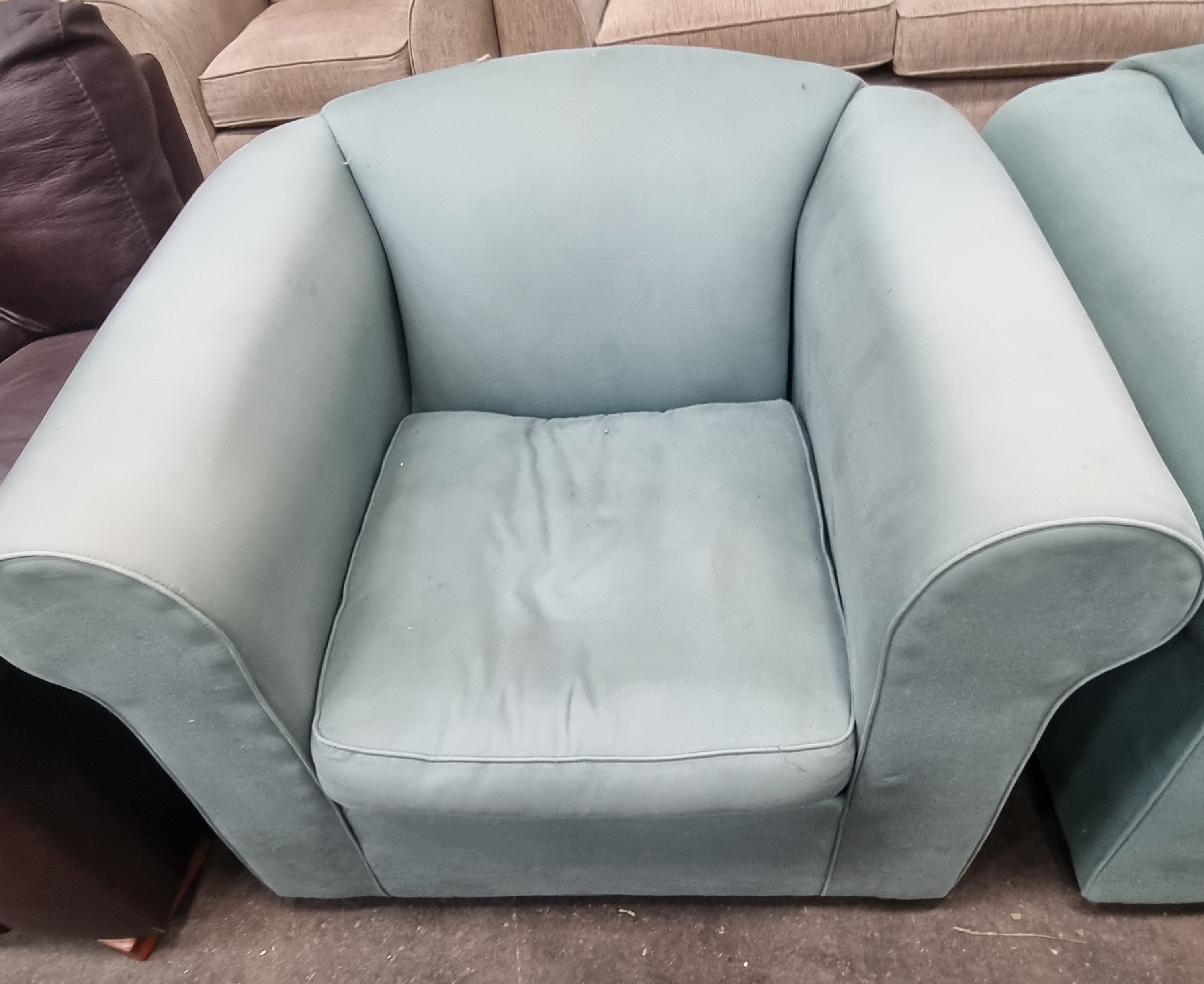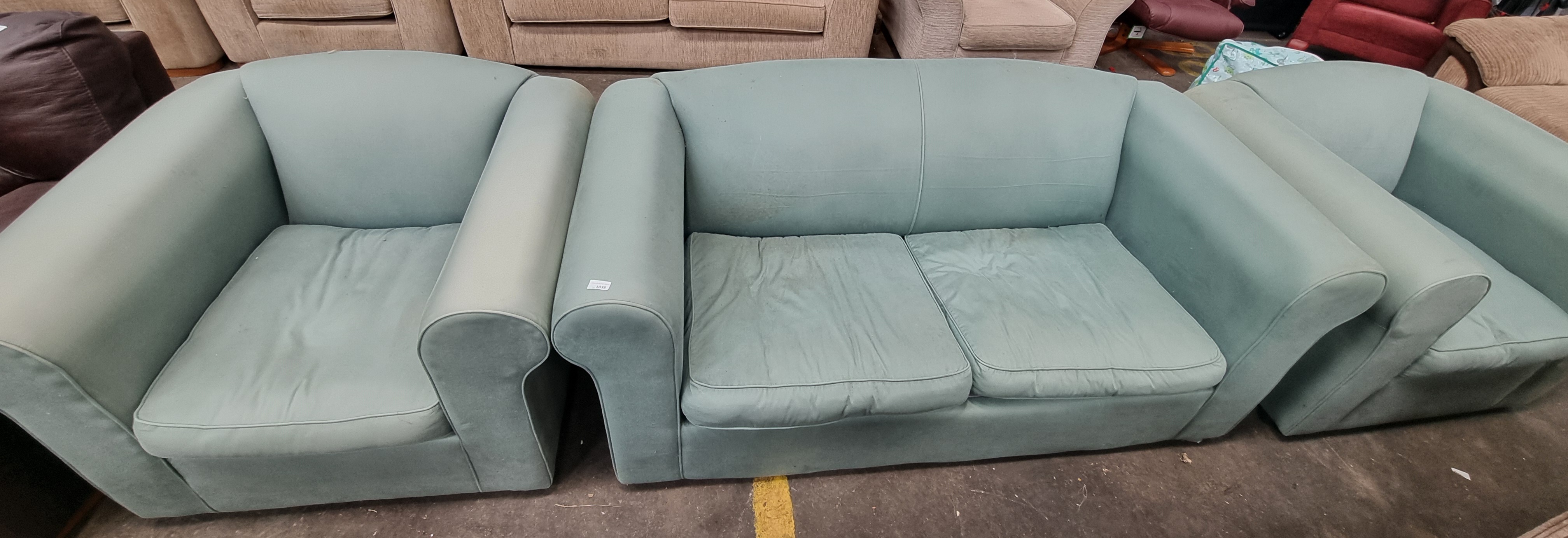 A three-piece lounge suite comprising one two-seater sofa and two matching armchairs. The suite is designed in a contemporary style with rounded, oversized arms and a curved back. The internal frame is fully upholstered in a duck egg blue velvet or chenille-style fabric with piped edges to the cushions and arms. Each piece features loose seat cushions and integrated fixed backrests. No manufacturer marks or labels are visible.