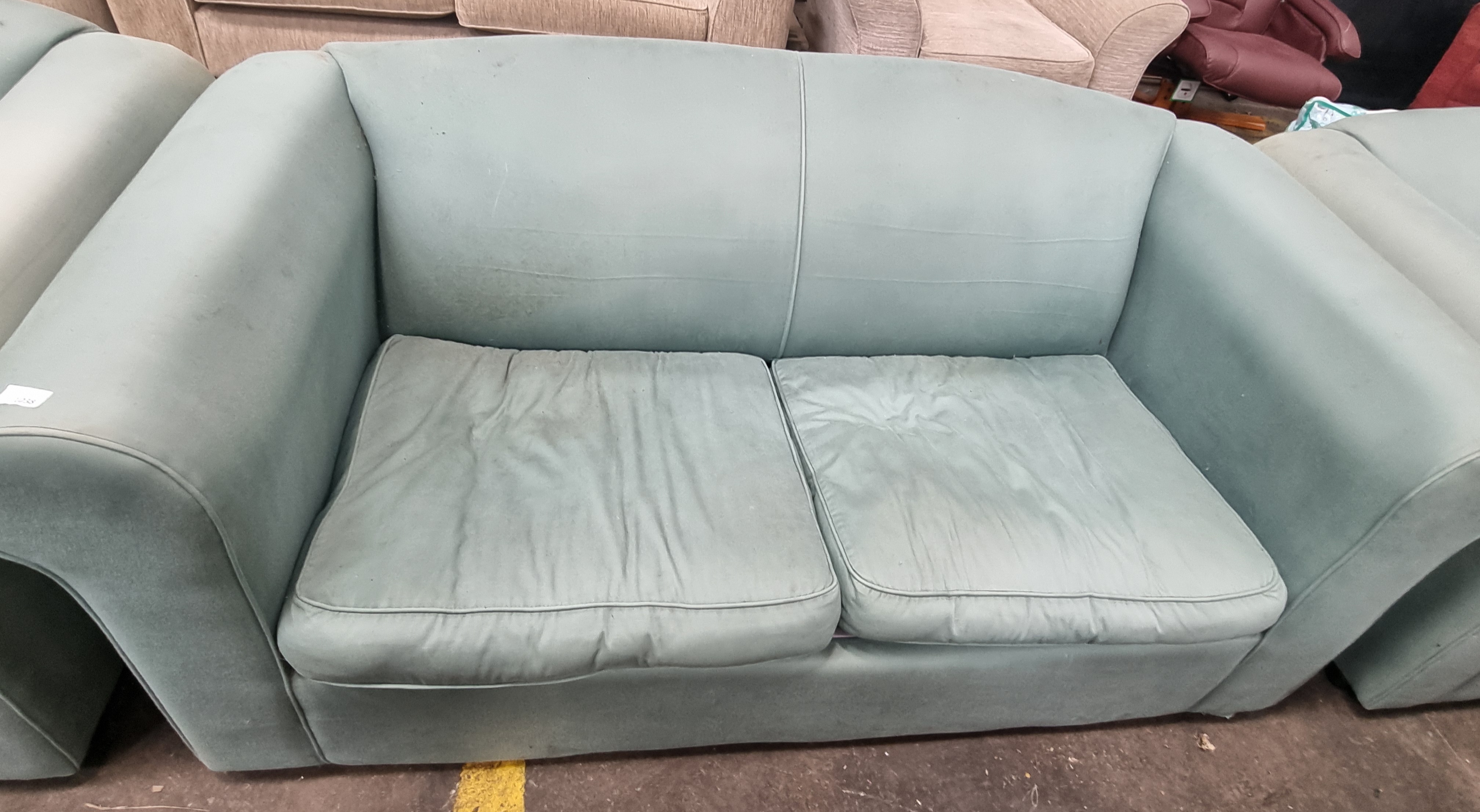 The suite is in well-used condition. There is visible staining and surface soiling across the upholstery, particularly on the arms and seat cushions. The fabric shows significant creasing and some discolouration, and the cushions appear to have lost some of their original firmness. Professional cleaning is recommended.