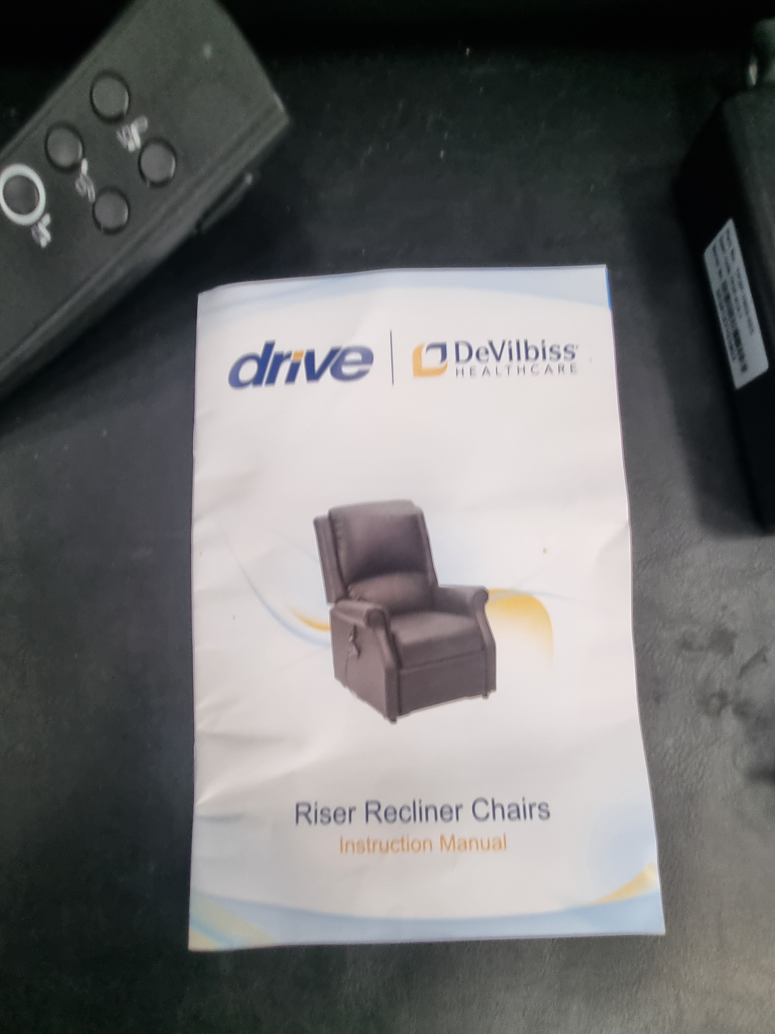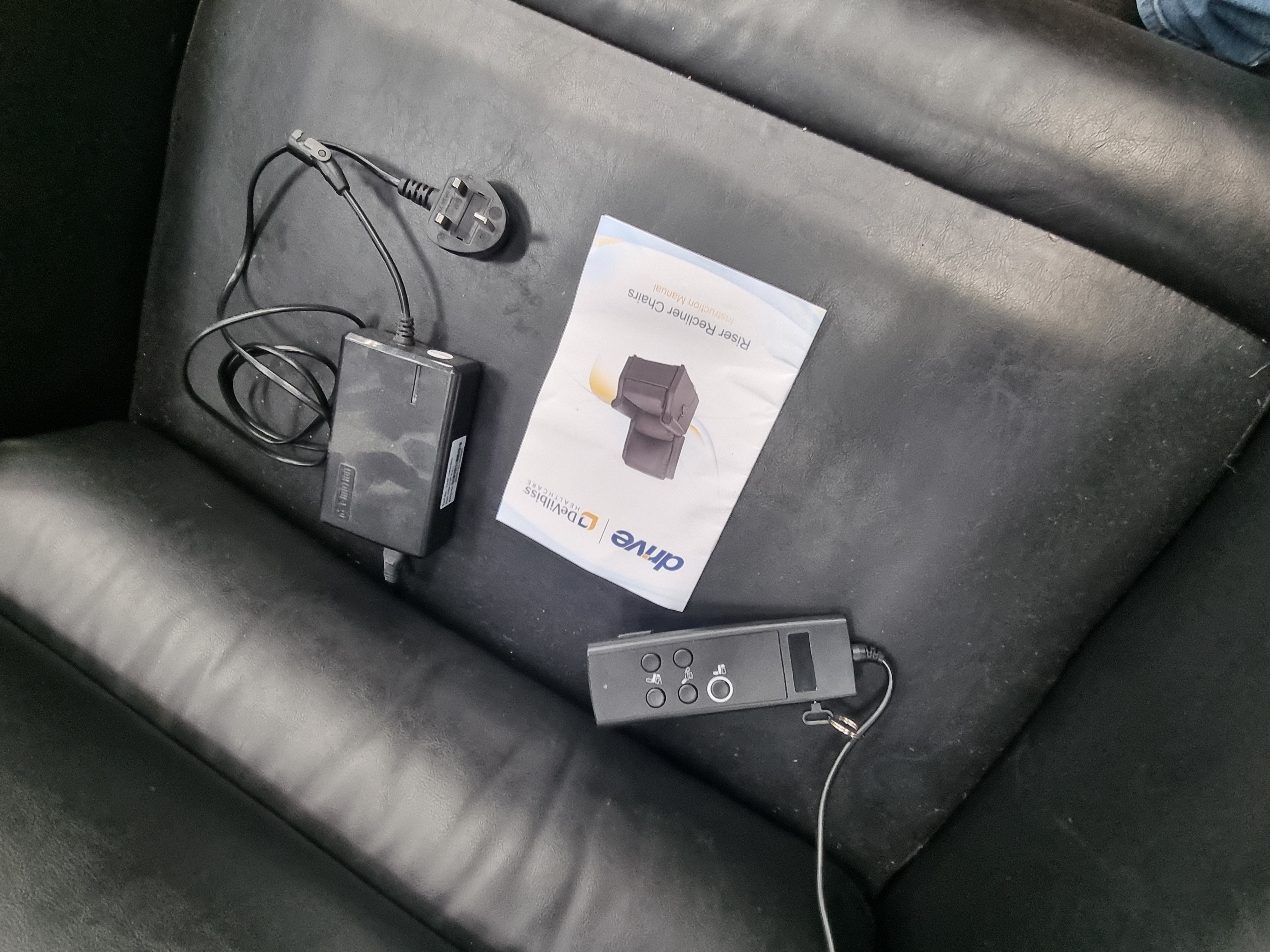 A contemporary electric riser recliner armchair manufactured by Drive DeVilbiss Healthcare. The chair is upholstered in black leather-effect padded material and features a triple-pillow waterfall style backrest, a padded seat, and flared armrests. The lot includes a wired six-button remote control handset, a power transformer, a UK three-pin power cable, and the manufacturer instruction manual.