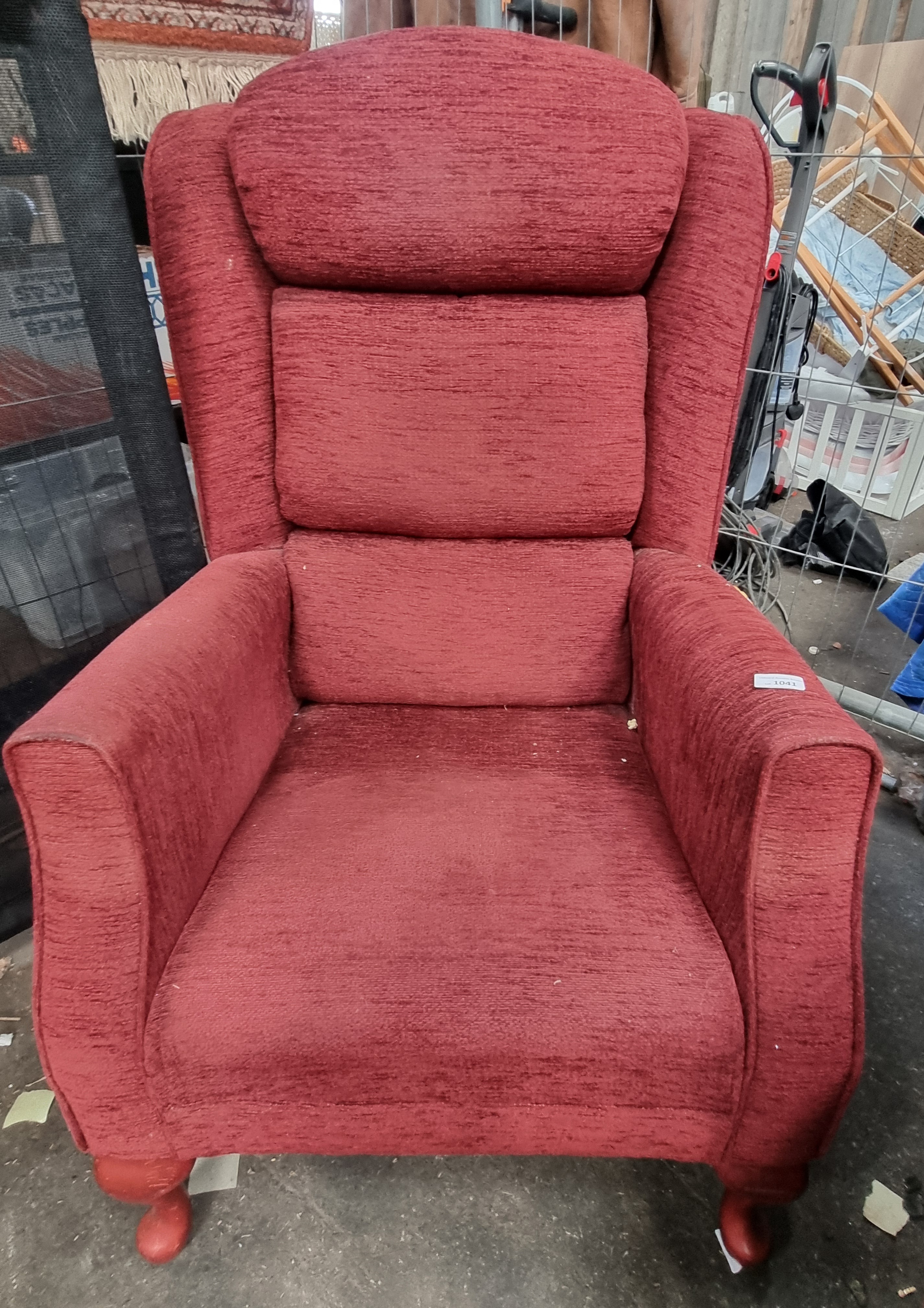 A contemporary high-back wing armchair featuring a three-tiered padded backrest. The chair is upholstered throughout in a deep red textured chenille-style woven fabric. It is raised on four short cabriole legs which have been finished in a matching dark red stain. The design includes integrated armrests and ergonomic padding. A small white rectangular sticker with the characters 1041 is present on the right armrest, likely representing a previous lot number. No manufacturer marks, brands, or labels are visible on the exterior of the piece.