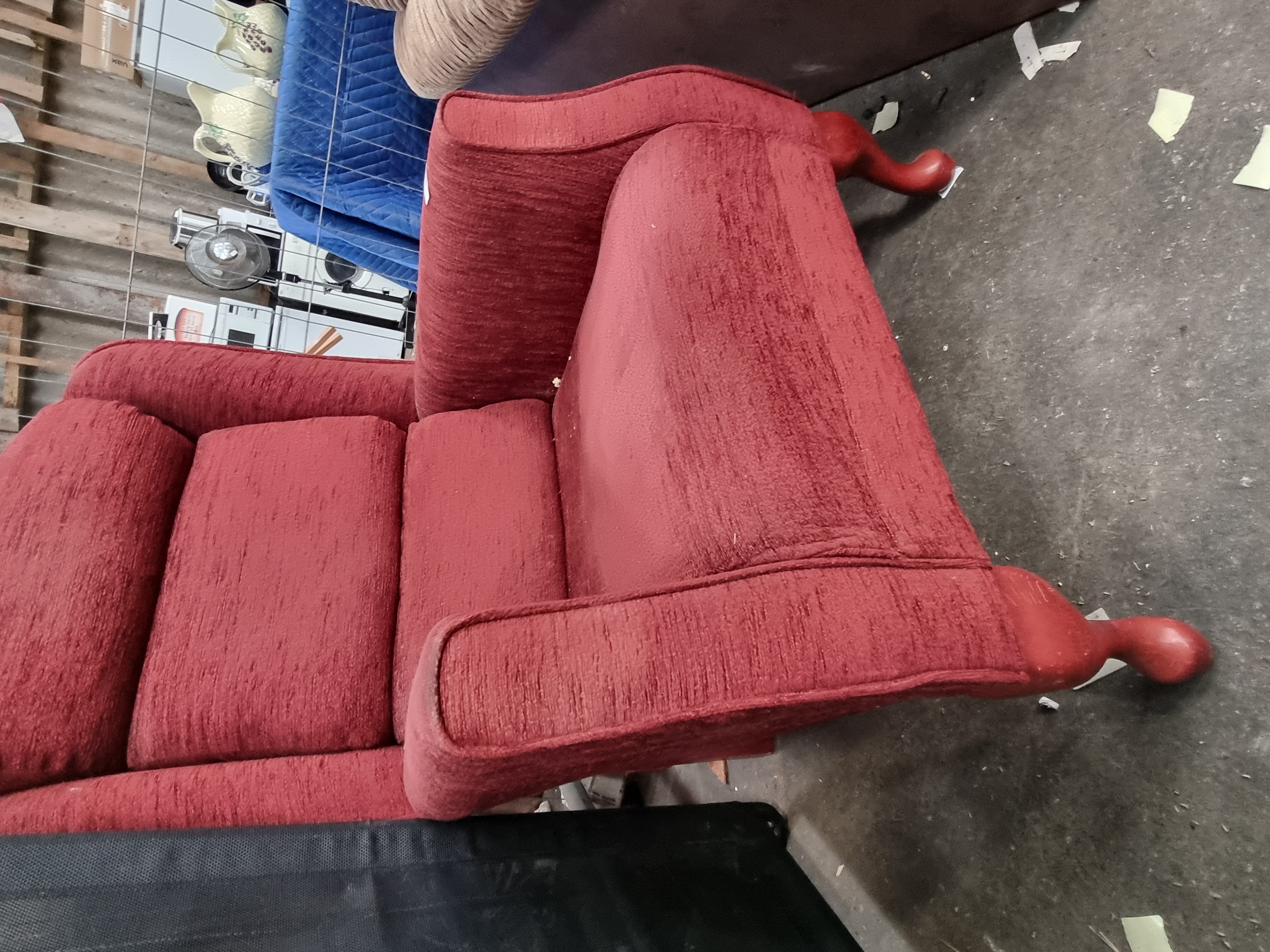 Fair to good used condition. There is visible scuffing and paint loss to the cabriole feet consistent with age and use. The upholstery is generally intact but shows light wear to the armrest edges and minor surface debris. The internal frame and under-seat dust cover have not been inspected.