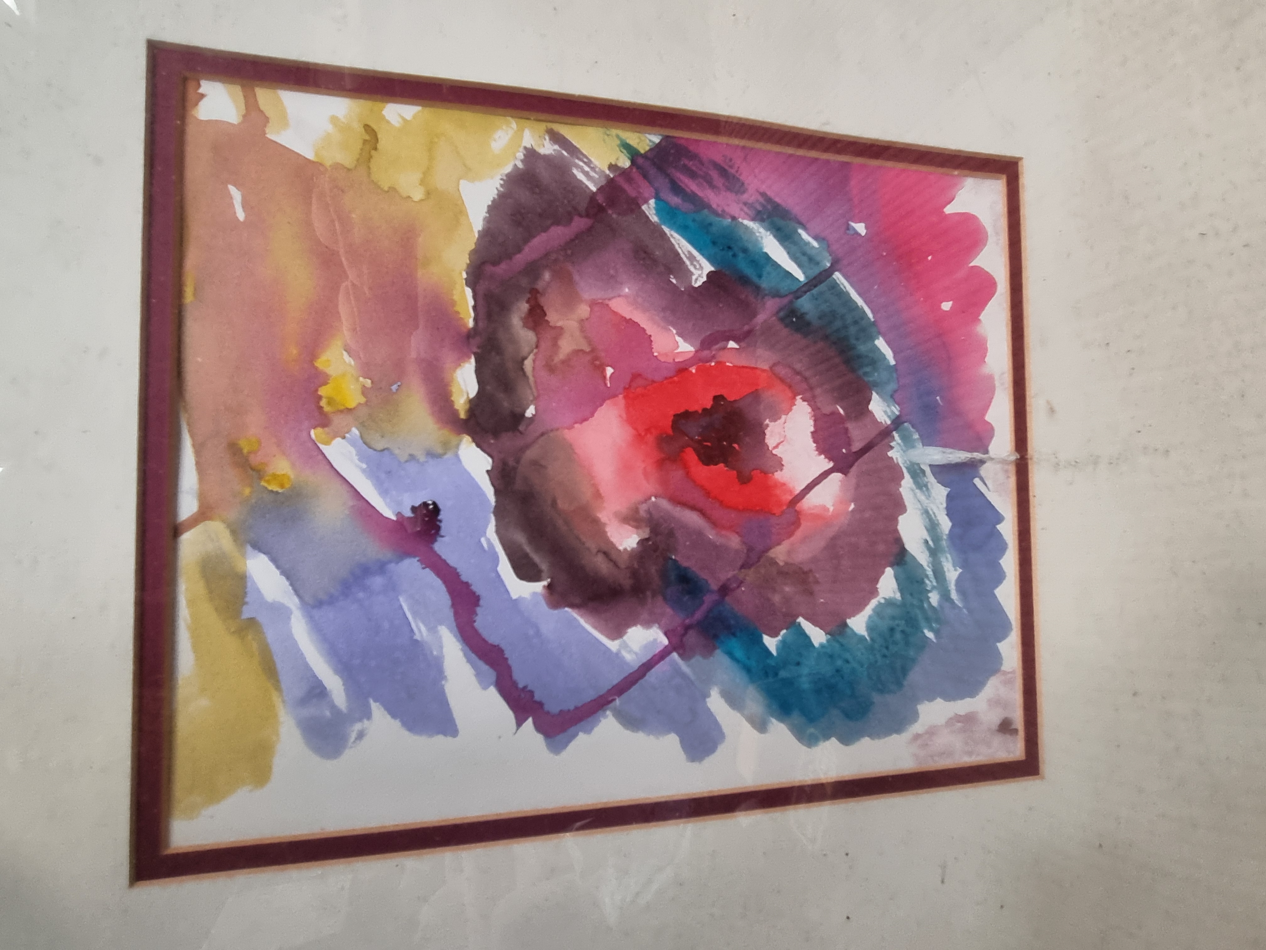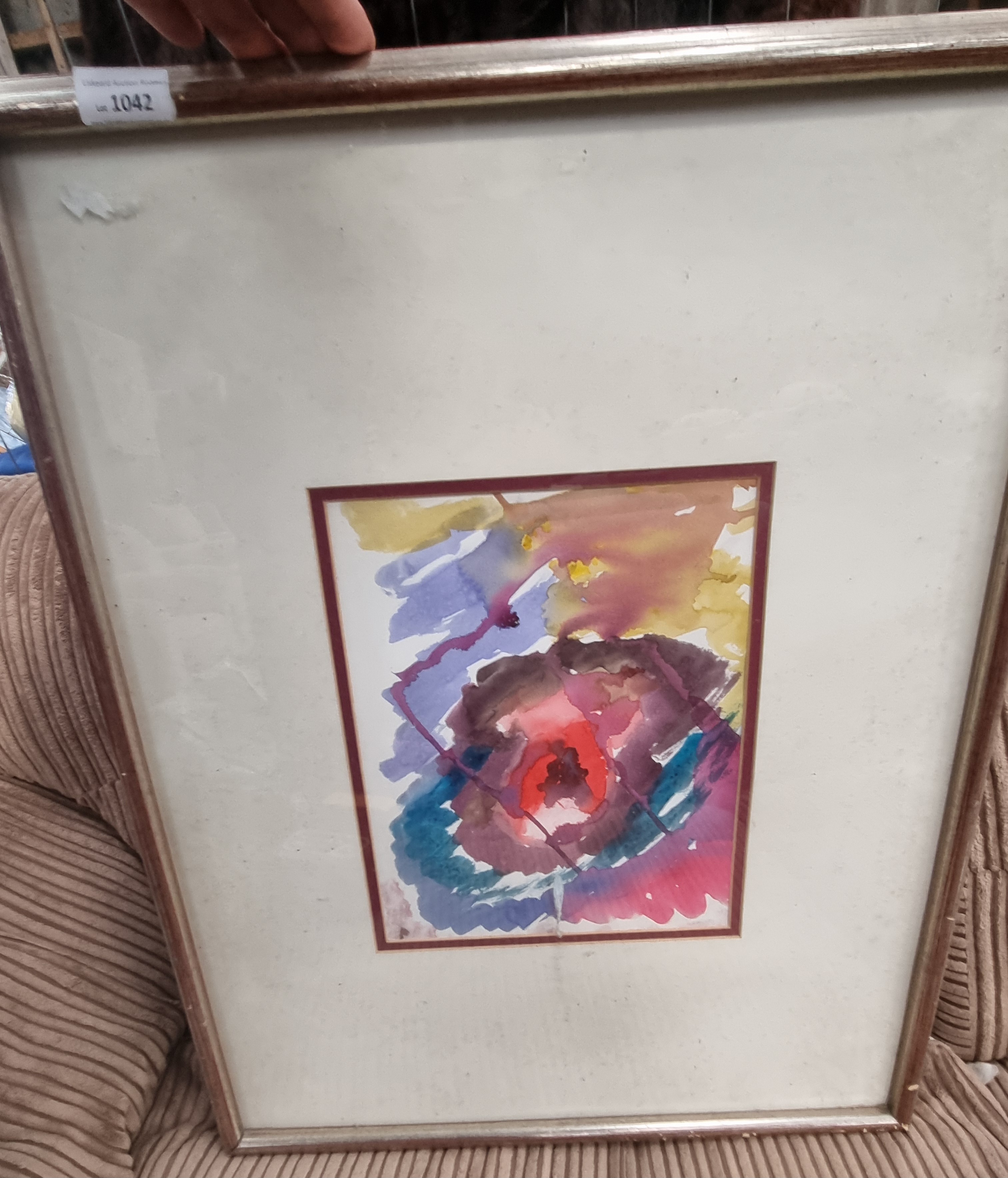 A modern abstract composition executed in watercolour and bodycolour on paper. The work features fluid, energetic washes of vibrant red, purple, turquoise, and ochre, centred around a concentrated core of pigment suggesting a floral or celestial form. The style is characteristic of late 20th-century abstract expressionism. No signature or date is visible on the front of the work. The painting is housed in an expansive off-white mount with a maroon inner border, set within a simple wooden frame with a metallic inner edge. The frame bears a lot tag from Liskeard Auction Rooms (Lot 1042).