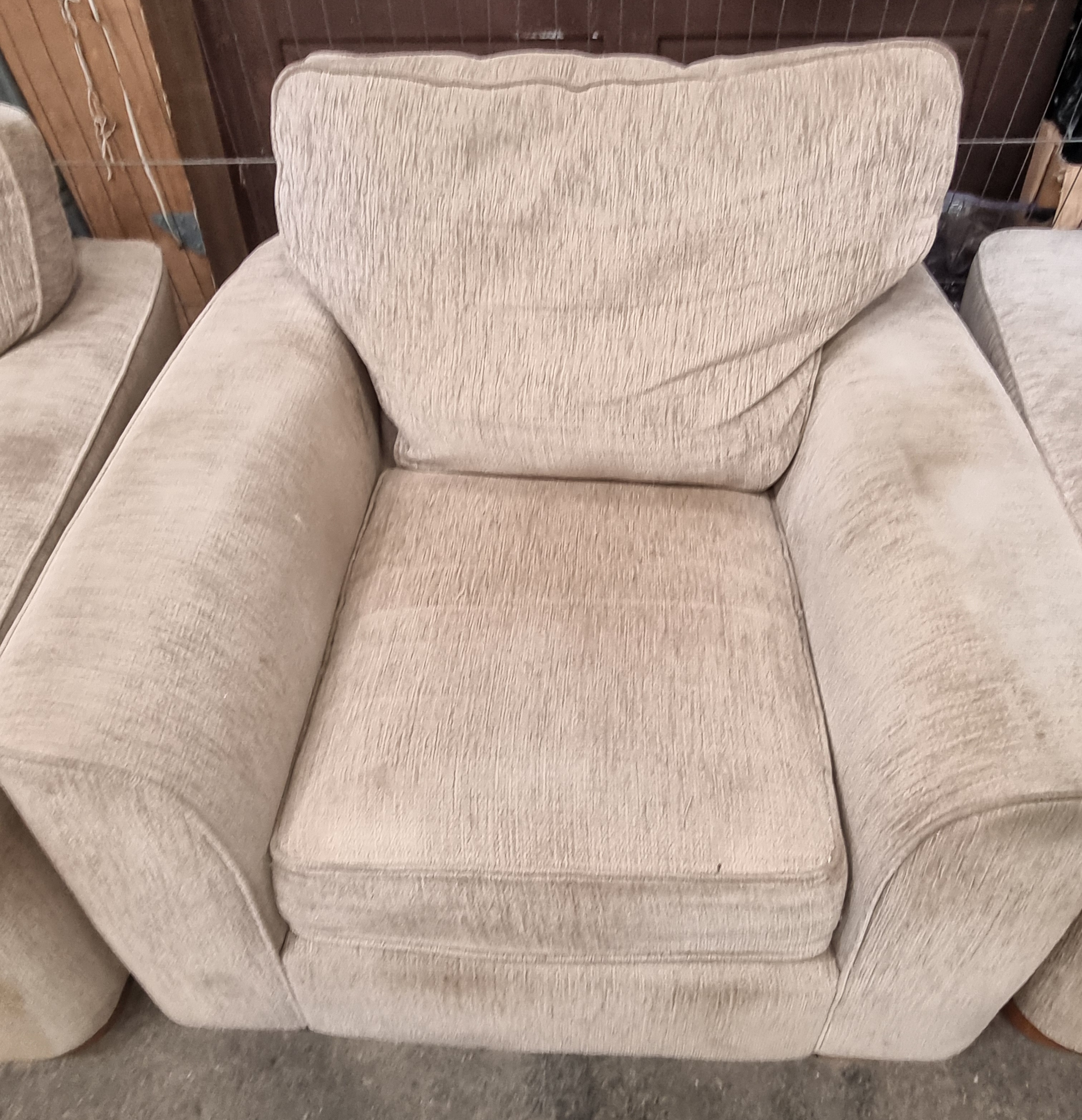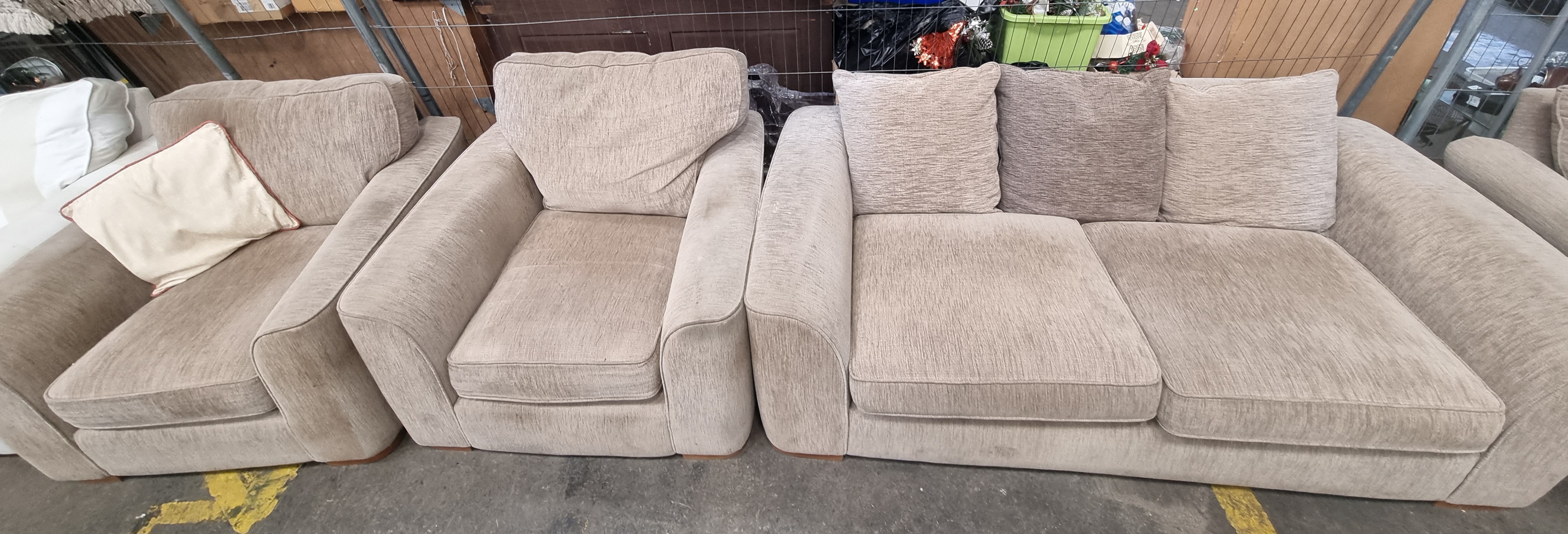 The suite is in used condition and exhibits significant signs of wear. There is noticeable soiling and dark staining to the front lower panels, the front of the seat cushions, and the armrests across all pieces. The cushions show signs of compression and loss of shape consistent with regular use. Professional cleaning is recommended to address the upholstery staining.