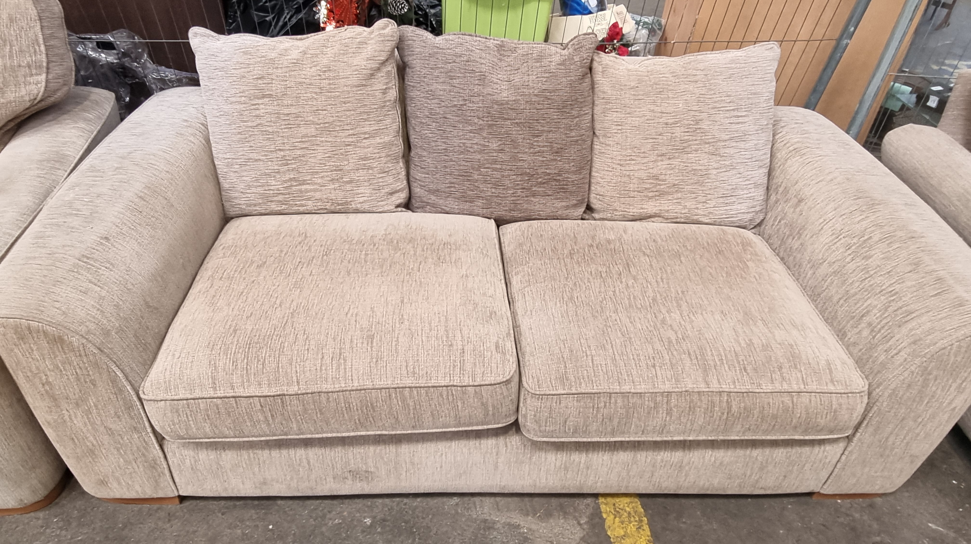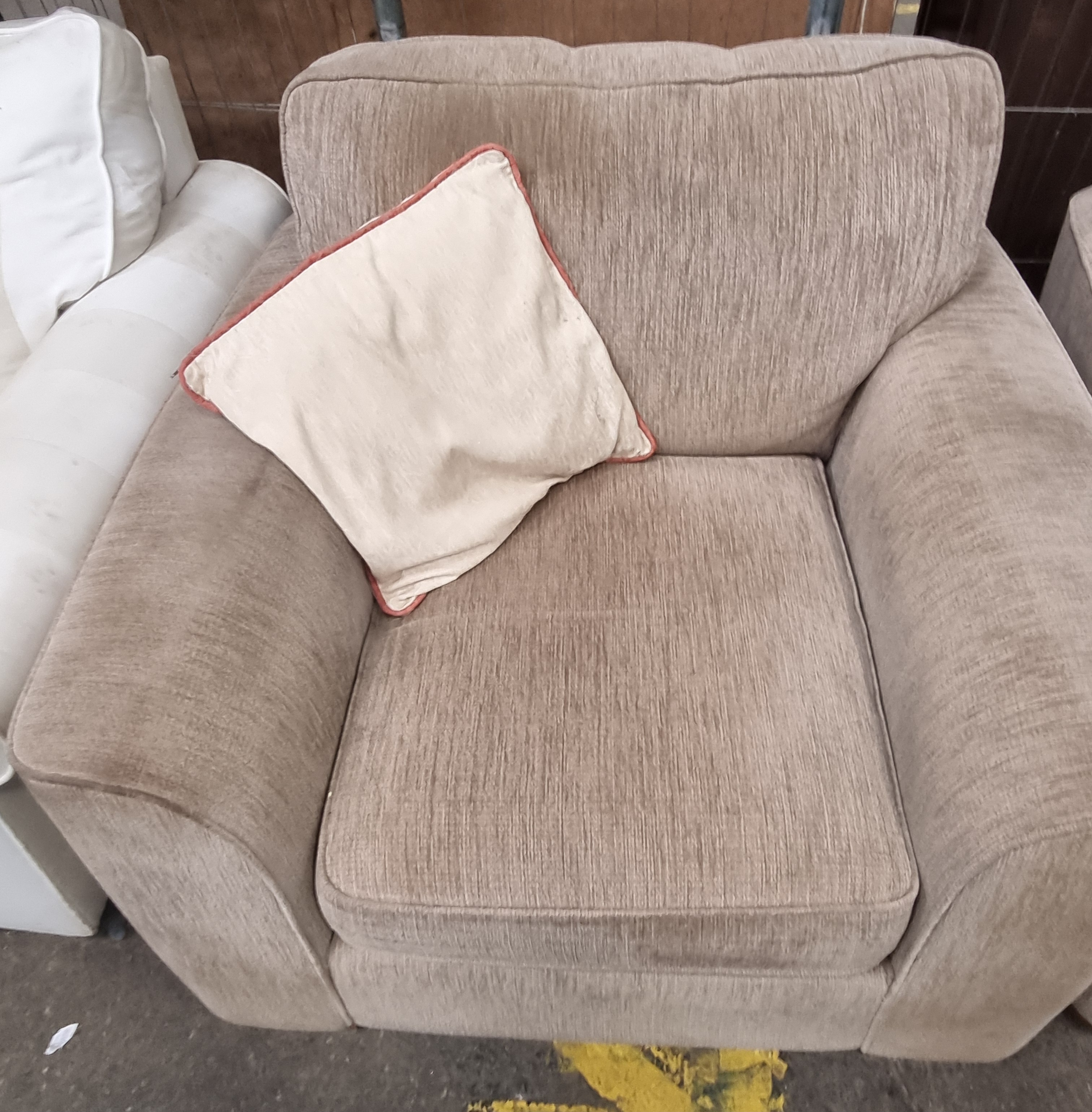 A contemporary three-piece lounge suite upholstered in a beige-toned textured fabric featuring a subtle vertical rib weave. The suite consists of a two-seater sofa and two matching armchairs. The sofa is designed with two loose, box-bordered seat cushions and three loose back cushions, one of which is finished in a contrasting darker shade. Each armchair features a single loose, box-bordered seat cushion and a matching loose back cushion. The lot includes one additional cream throw pillow with a contrasting reddish-orange piped edge. All pieces are elevated on low-profile, rectangular wooden feet. No maker’s marks, manufacturer labels, or brand identifications were observed during inspection.