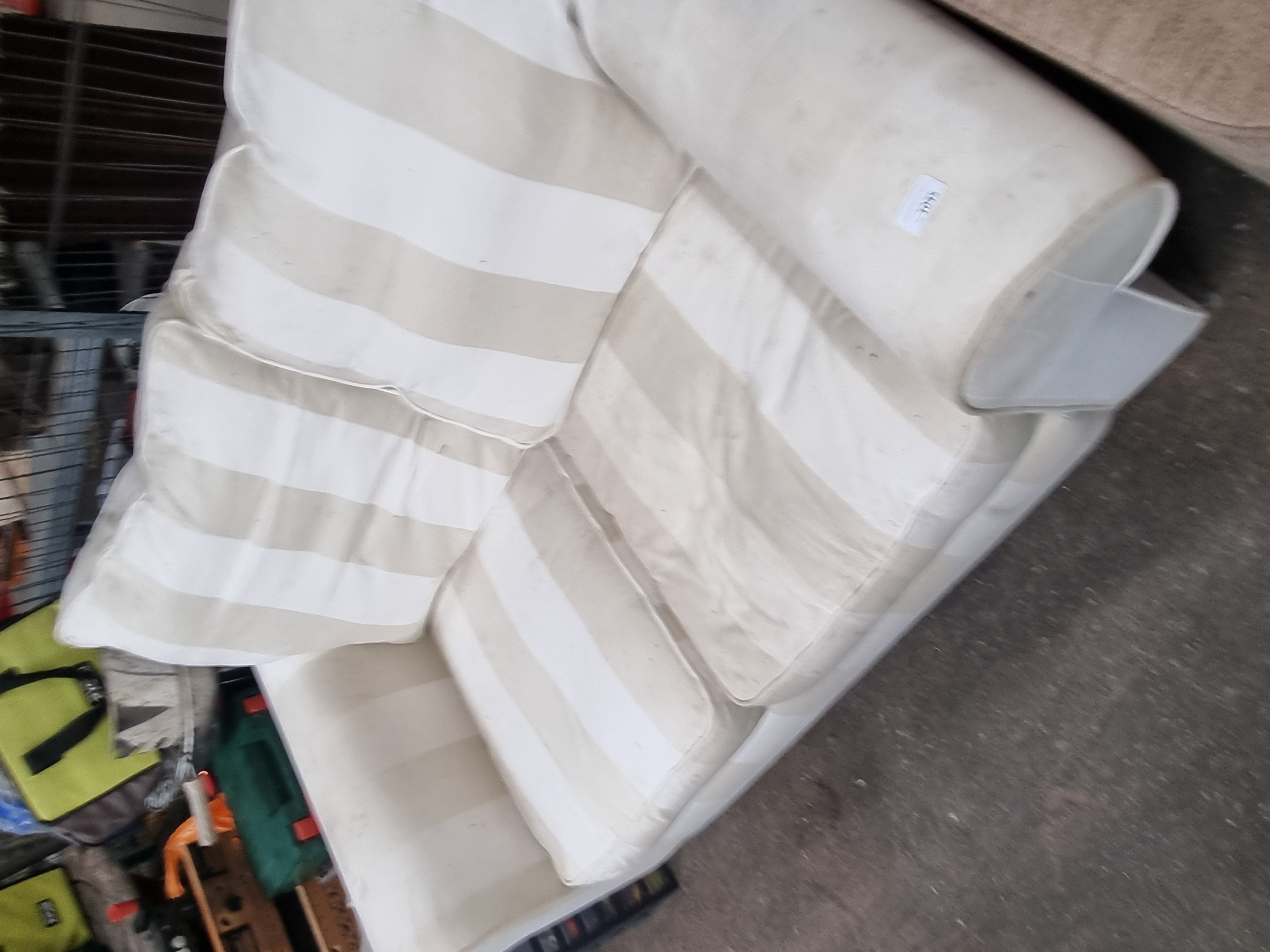 In poor condition. The piece exhibits significant and widespread surface soiling, staining, and dark marks across all cushions and upholstered surfaces. It appears to have been stored in an industrial or dusty environment and will require extensive professional deep cleaning. Sold as seen.