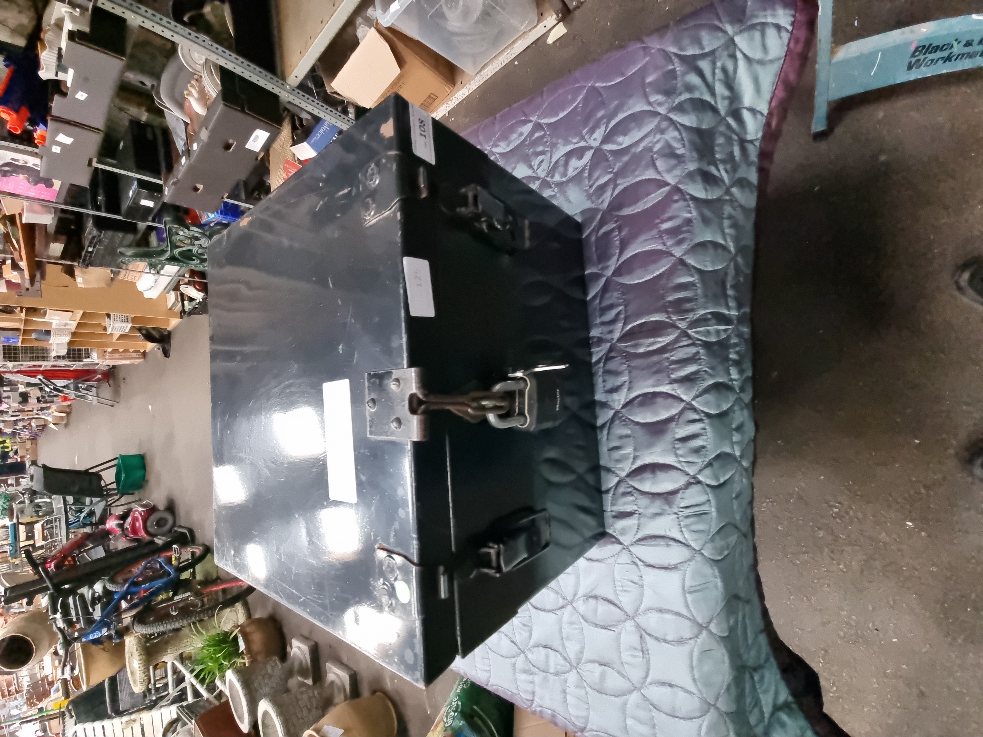 Lot 108: A heavy-duty black painted steel strongbox with commercial padlock