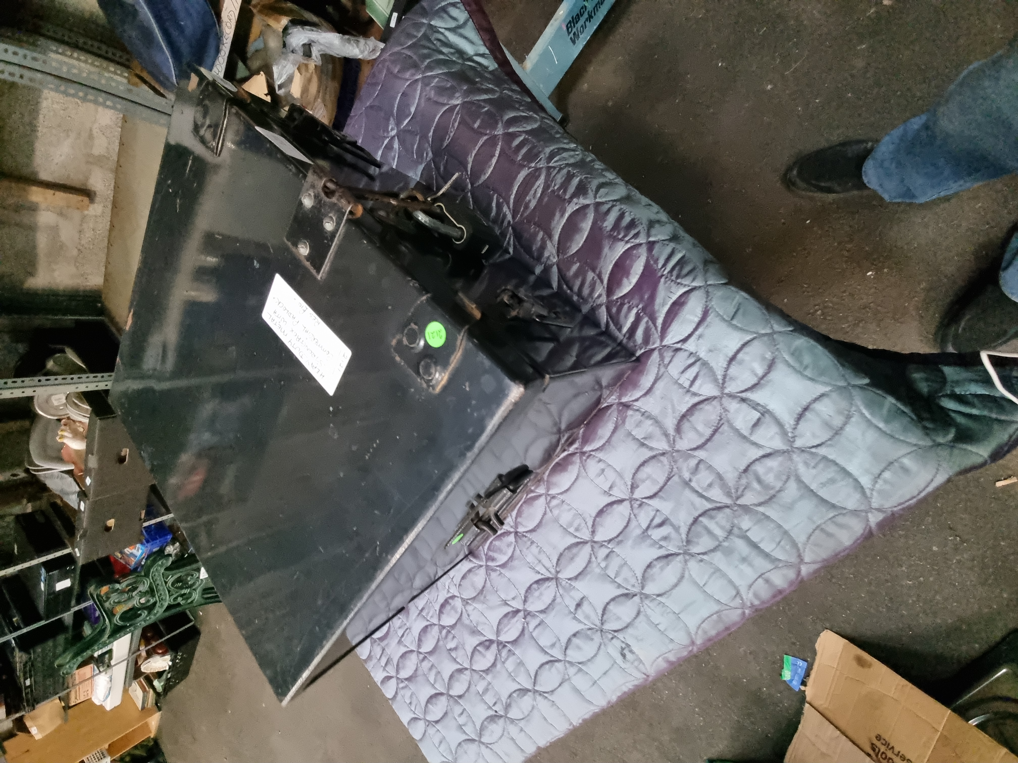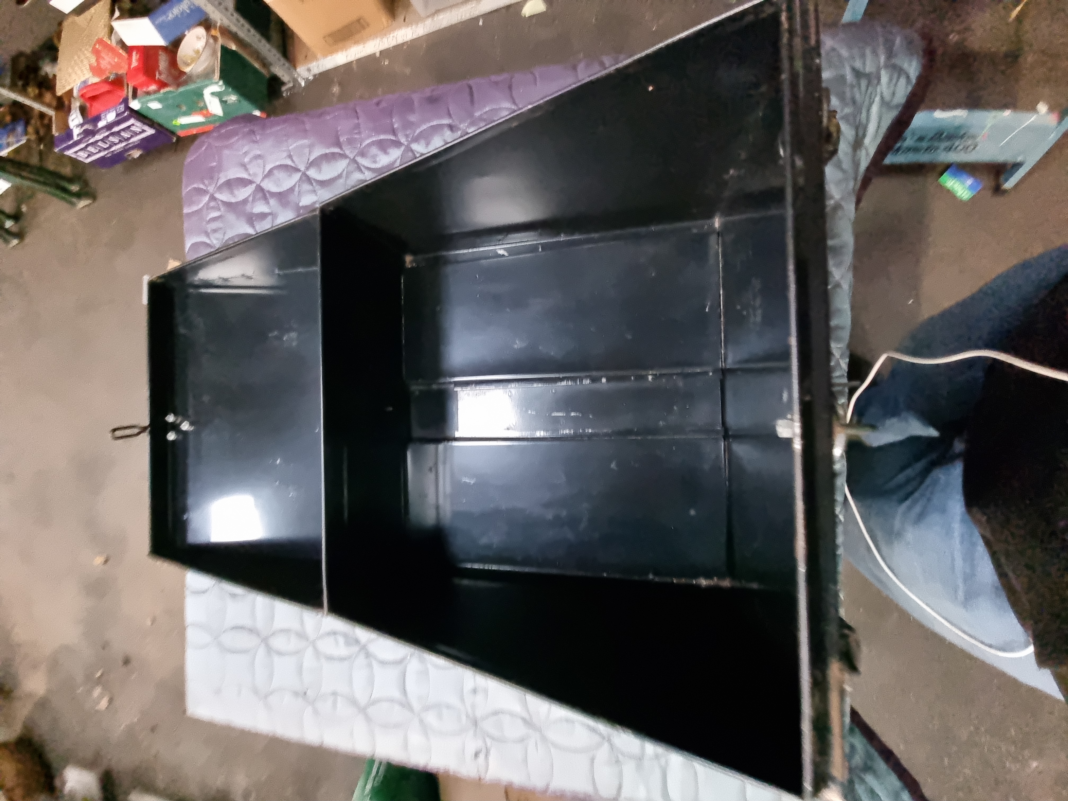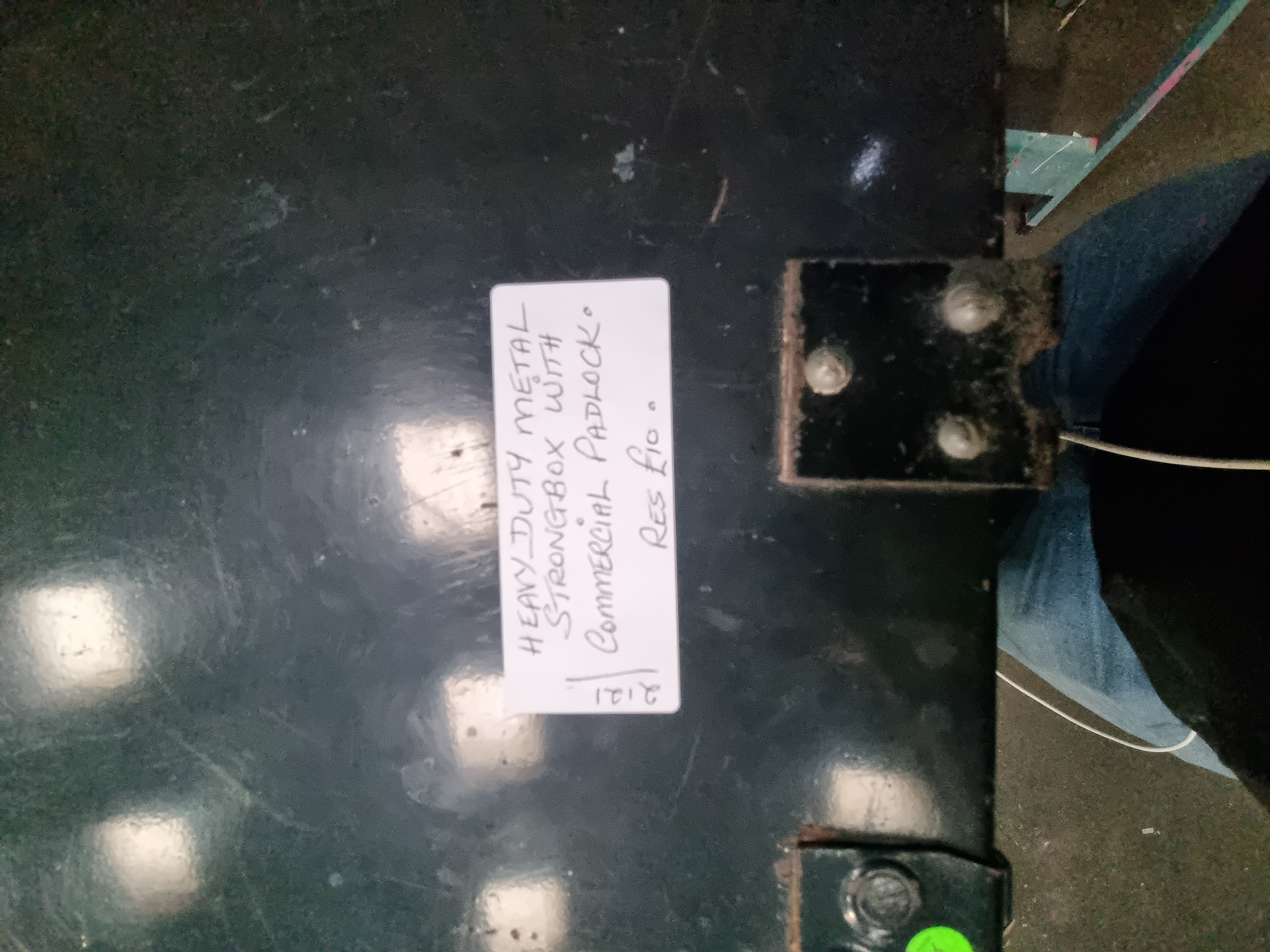 A substantial utilitarian storage chest of rectangular form, constructed from fabricated sheet steel with riveted and welded components. The exterior is finished in a black paint. The hinged lid is secured by three front-mounted hasps, with the central hasp fitted with a heavy-duty commercial-grade padlock featuring a shrouded shackle. The interior is divided into two sections, comprising a large main compartment and a smaller side partition. Several adhesive auction labels are present on the exterior, including one handwritten label identifying the item as a heavy duty metal strongbox with a reserve of ten pounds. No manufacturer’s marks are visible on the box. The padlock bears characters on the face which are not clearly legible in the provided images.