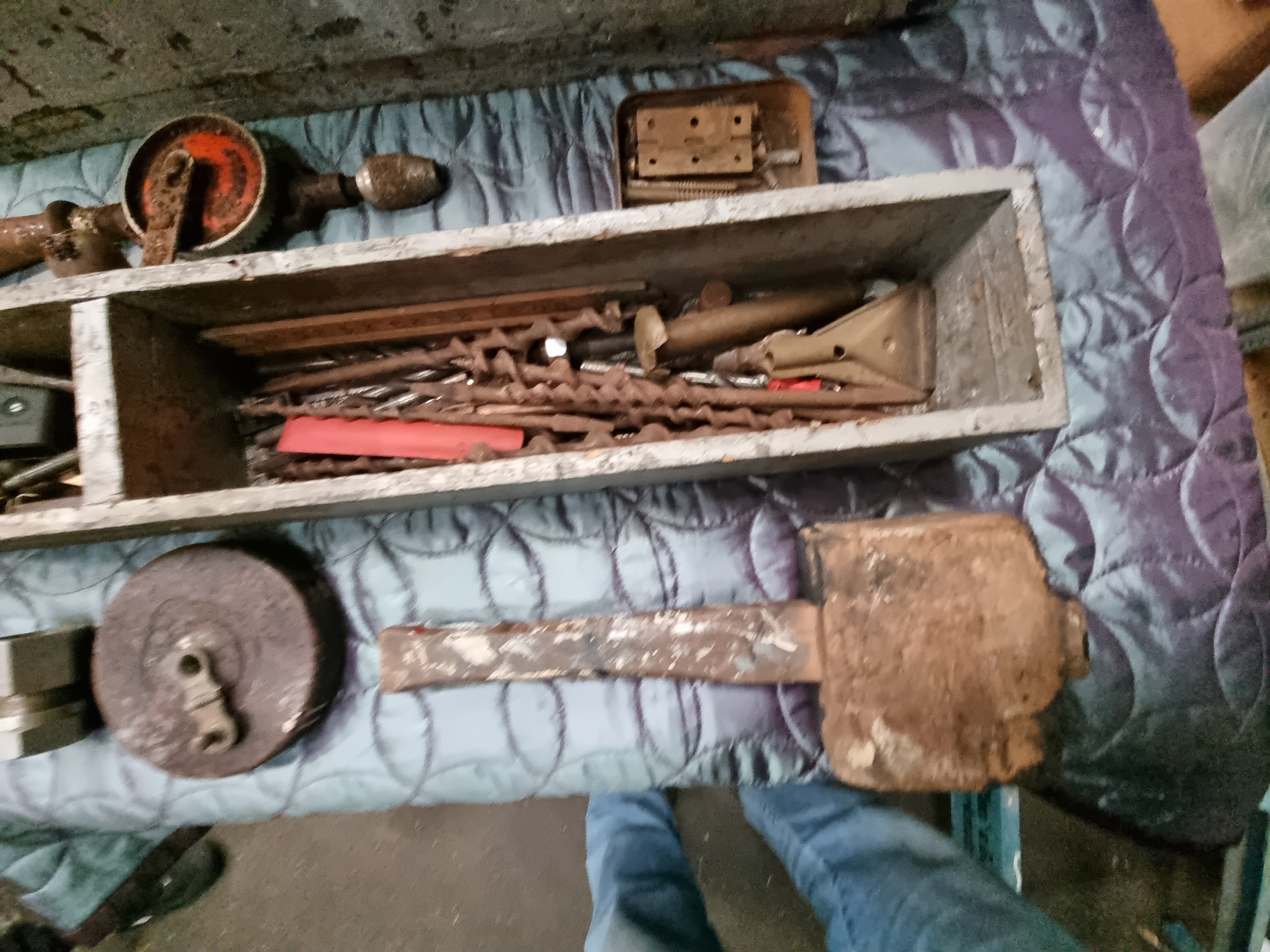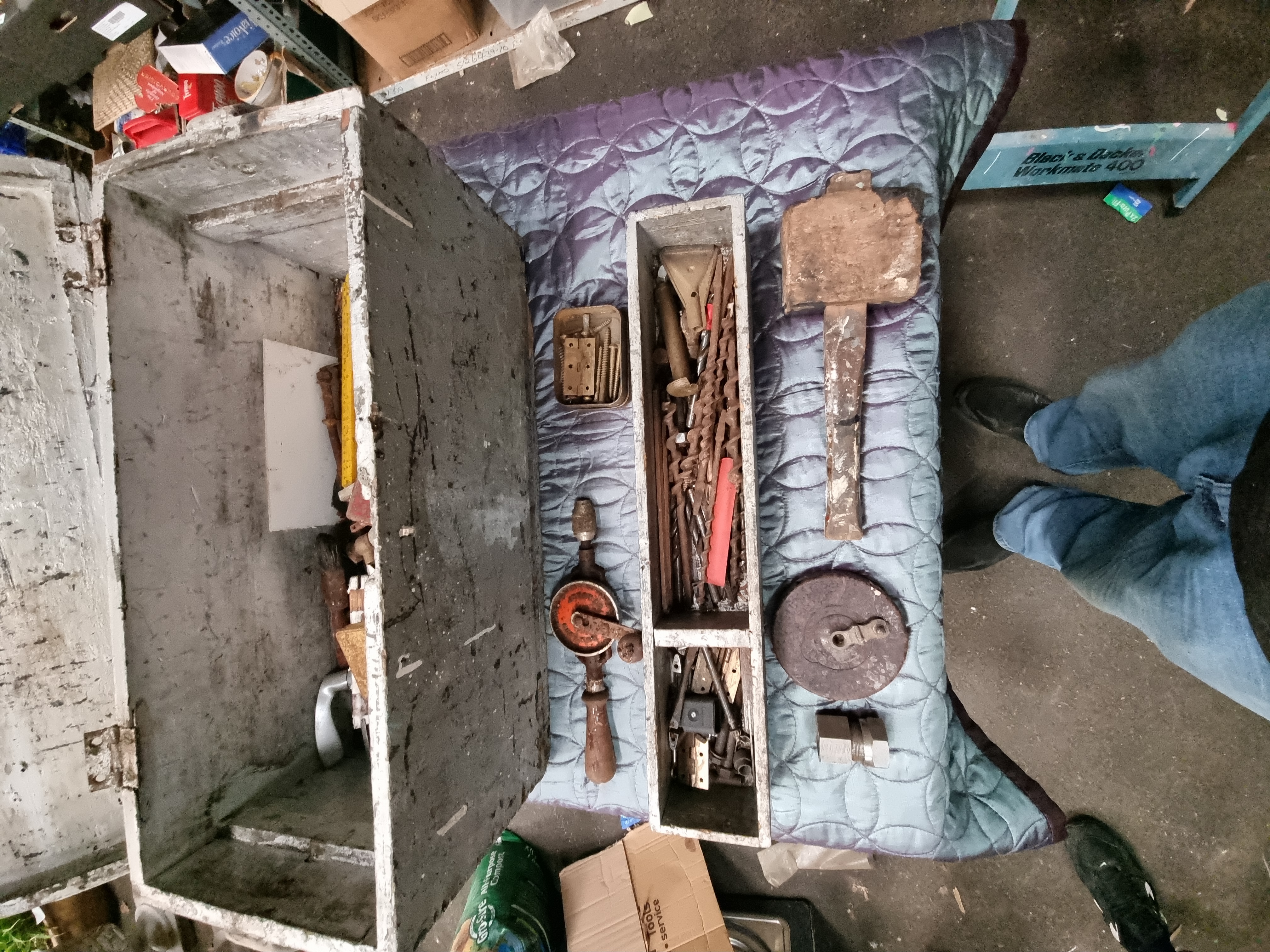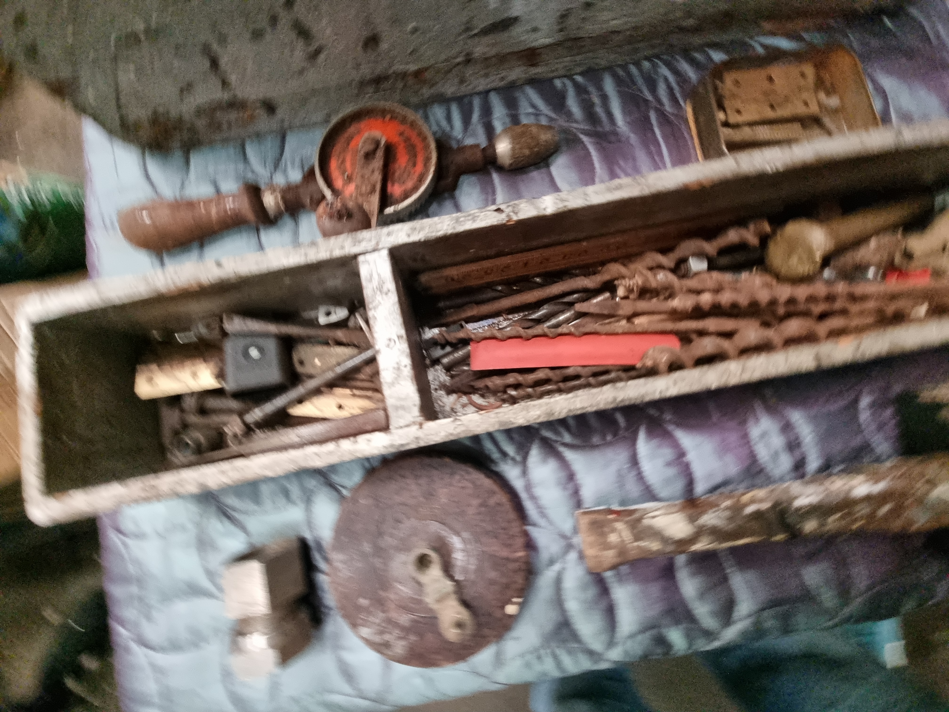 The items are in as found condition, showing wear, paint loss, and staining to the wooden chest. Metal components, including the auger bits, exhibit surface oxidation and rust. The tools show signs of use including paint splashes and workshop grime. The mechanical status of the drill and other moving parts is untested.