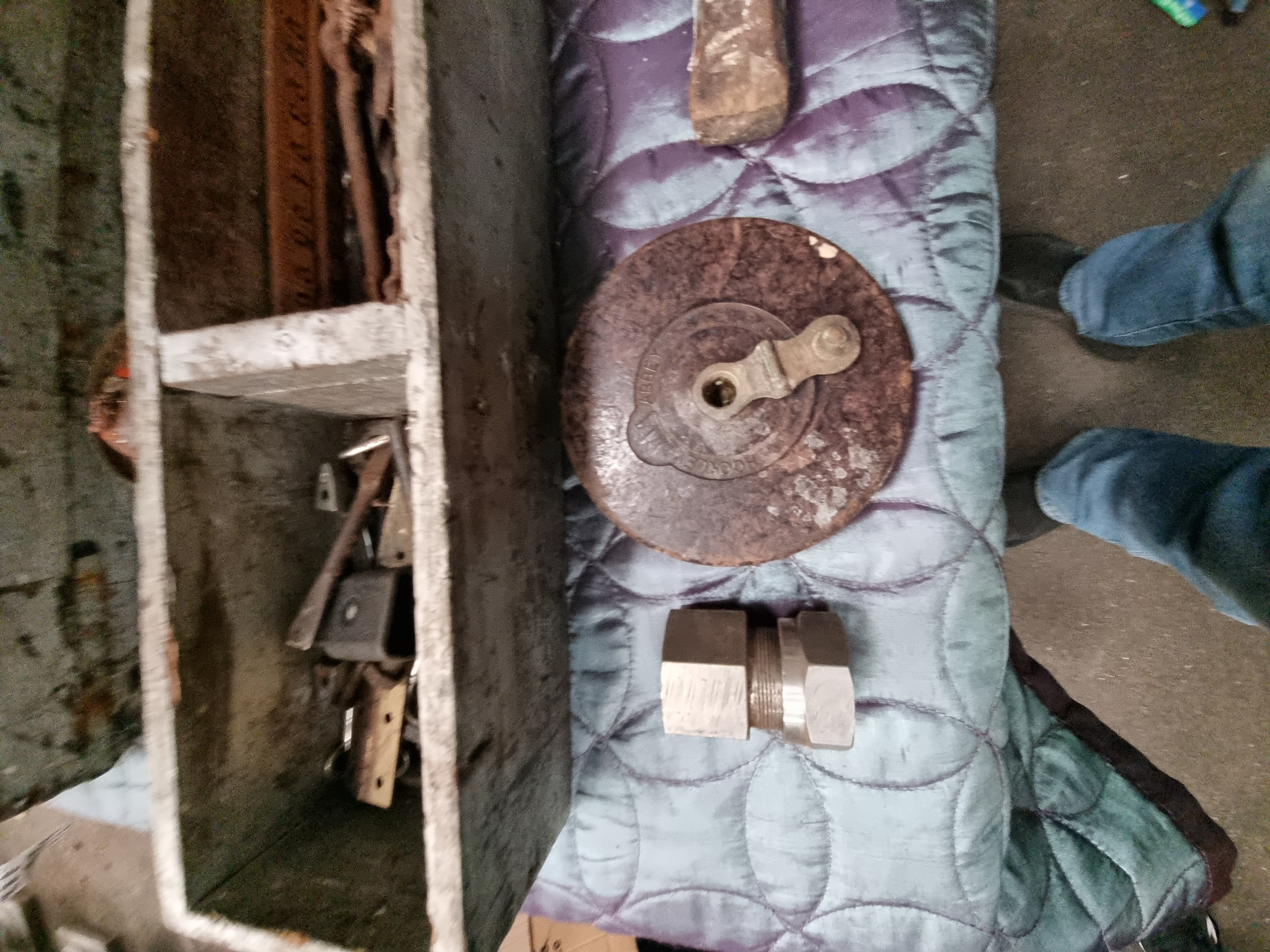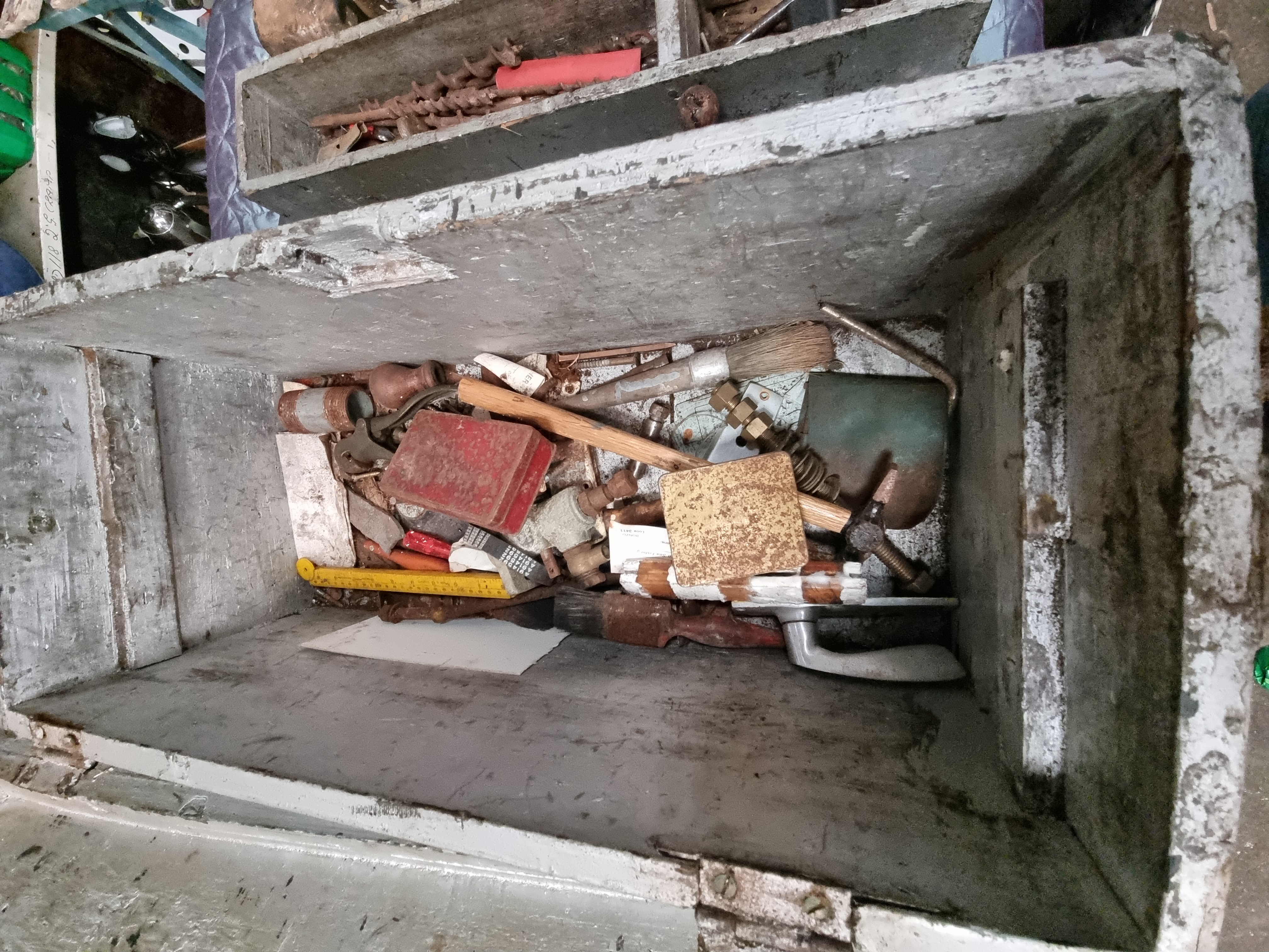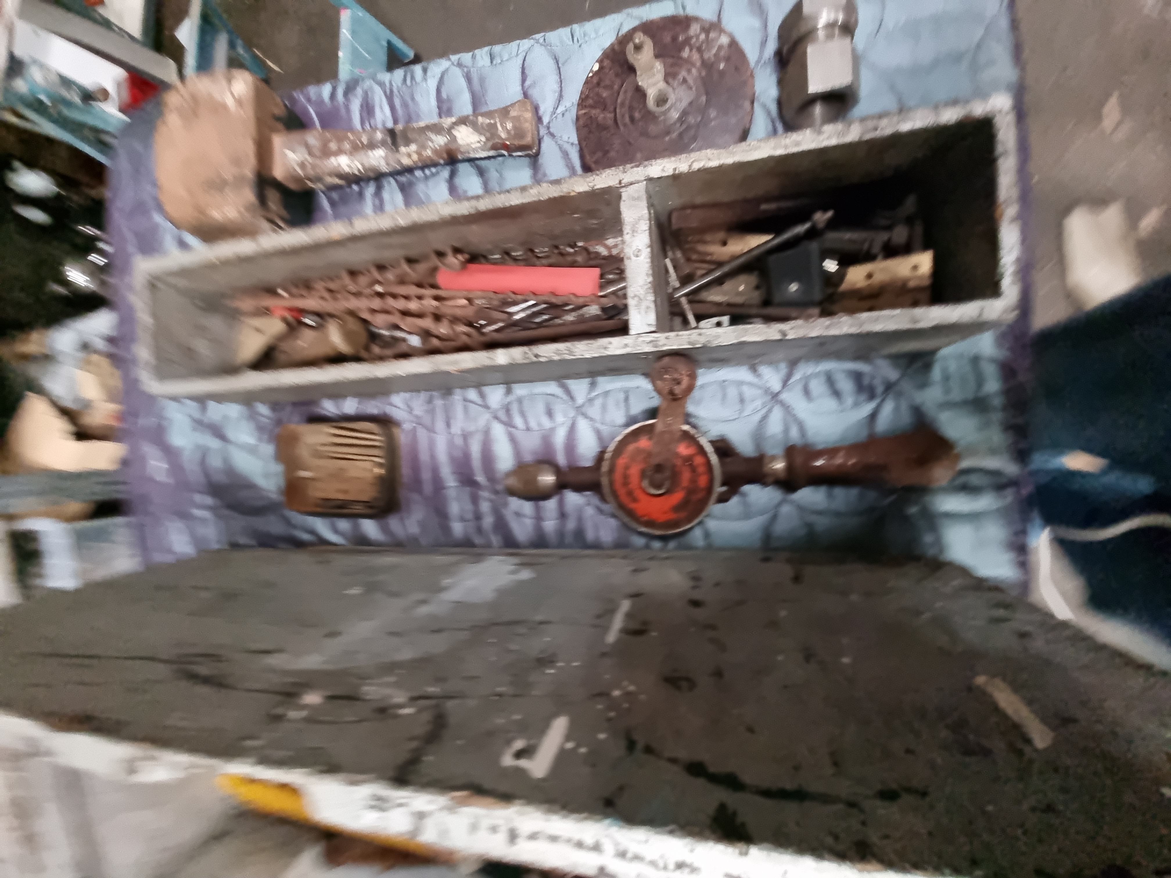 The items are in as found condition, showing wear, paint loss, and staining to the wooden chest. Metal components, including the auger bits, exhibit surface oxidation and rust. The tools show signs of use including paint splashes and workshop grime. The mechanical status of the drill and other moving parts is untested.