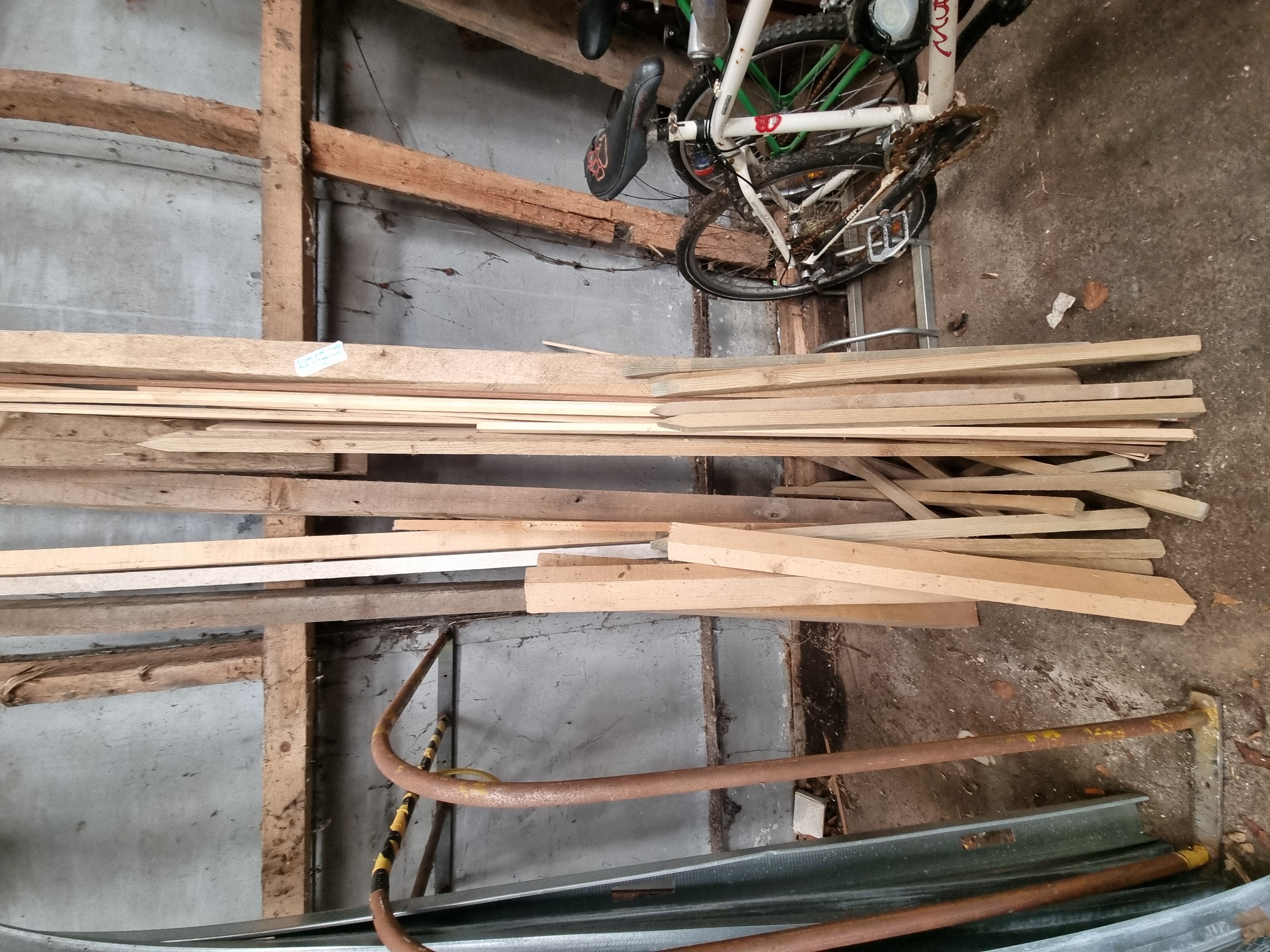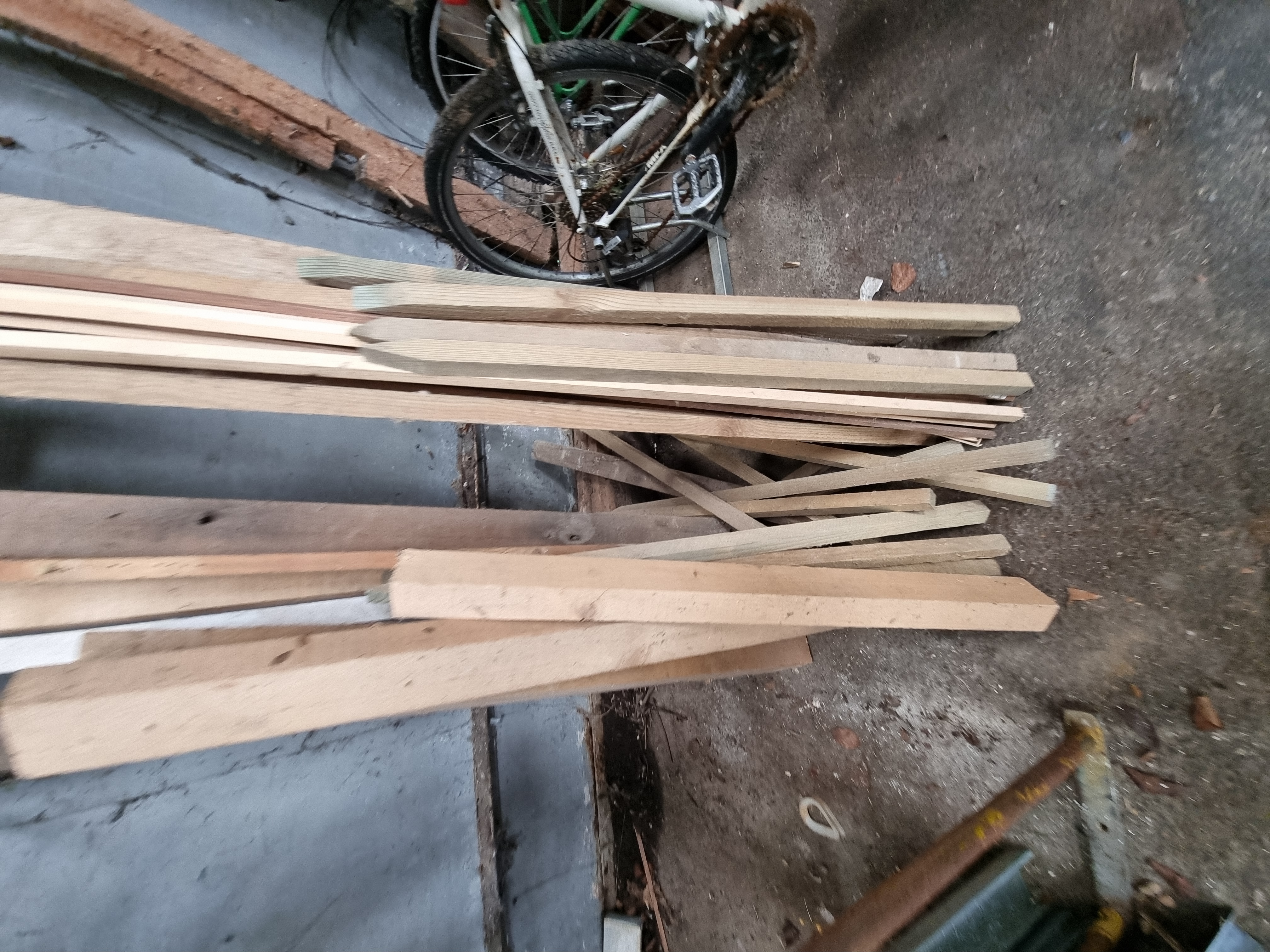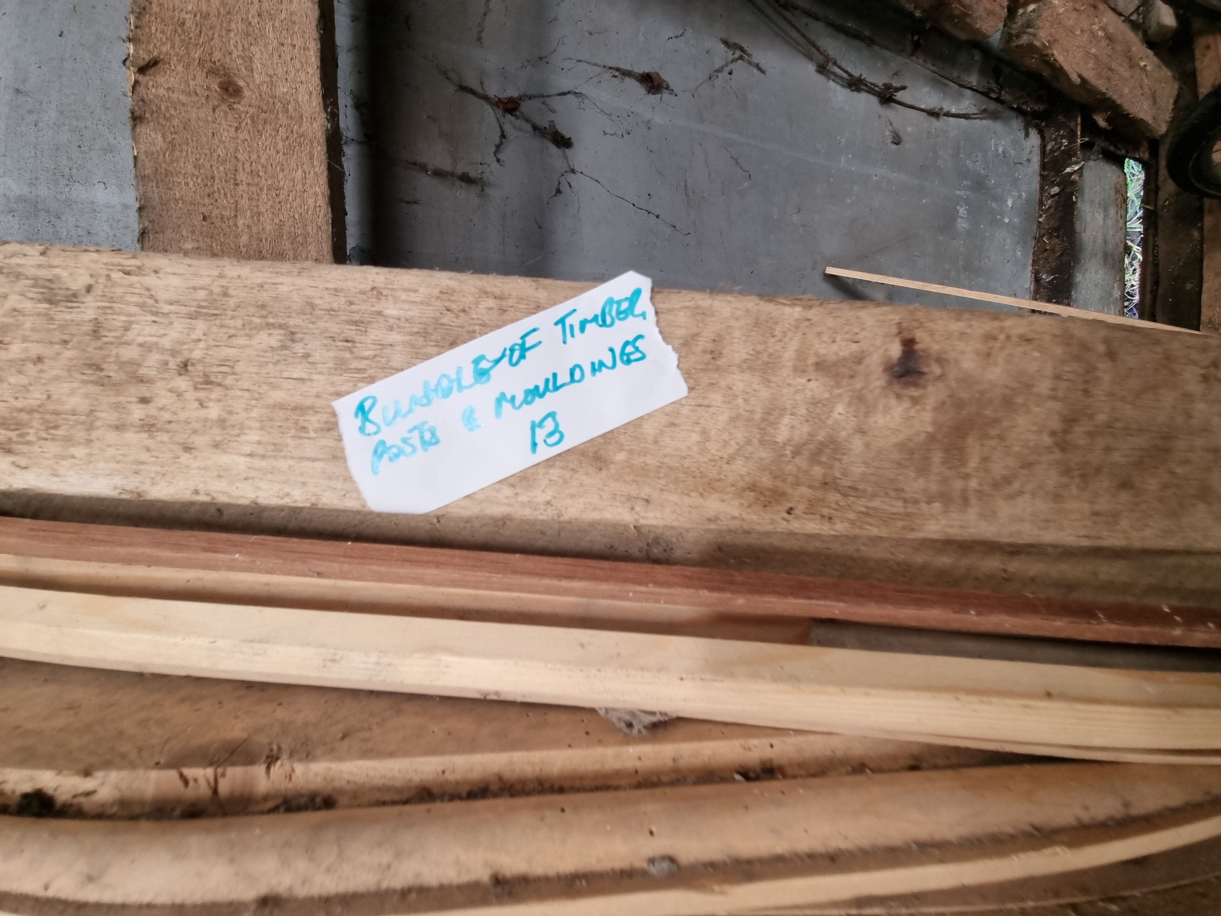 A collection of miscellaneous timber pieces in various lengths and profiles. The lot includes several squared timber posts, some featuring tapered, pointed ends designed for ground insertion. The assortment also contains various lengths of thin timber mouldings, narrow strips, and several wider planks. The wood appears to be a combination of softwoods and hardwoods. A white paper label is affixed to one of the larger planks with handwritten text in blue ink reading BUNDLE OF TIMBER POSTS & MOULDINGS 13.