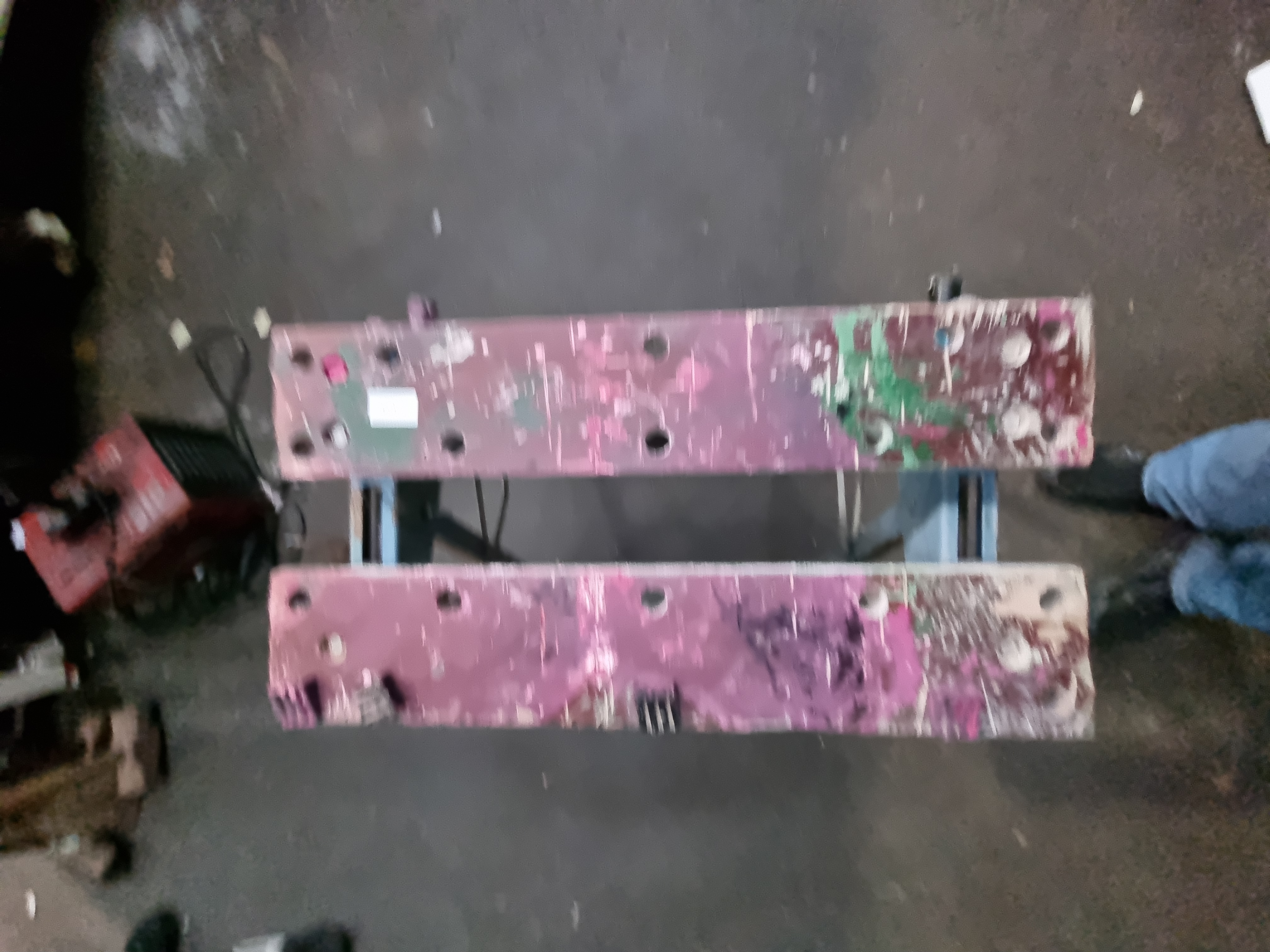 The item shows evidence of heavy workshop use. The wooden work surfaces are significantly stained with various colours of paint, notably pink and green, and feature numerous surface scuffs and gouges. The blue-painted metal frame is structurally intact but displays considerable paint overspray, surface grime, and light oxidation. Both winding handles for the vice mechanism are present. The folding and vice mechanisms have not been tested for full functionality.