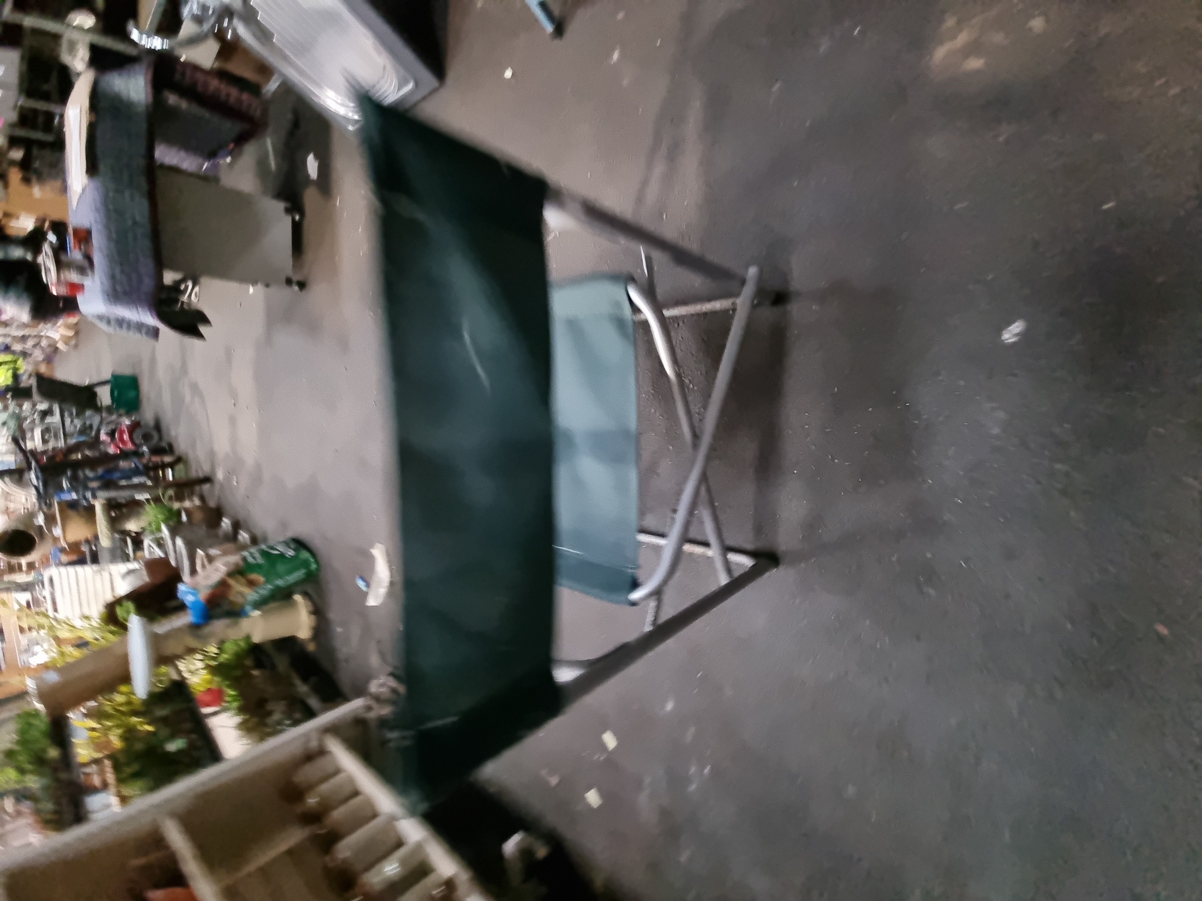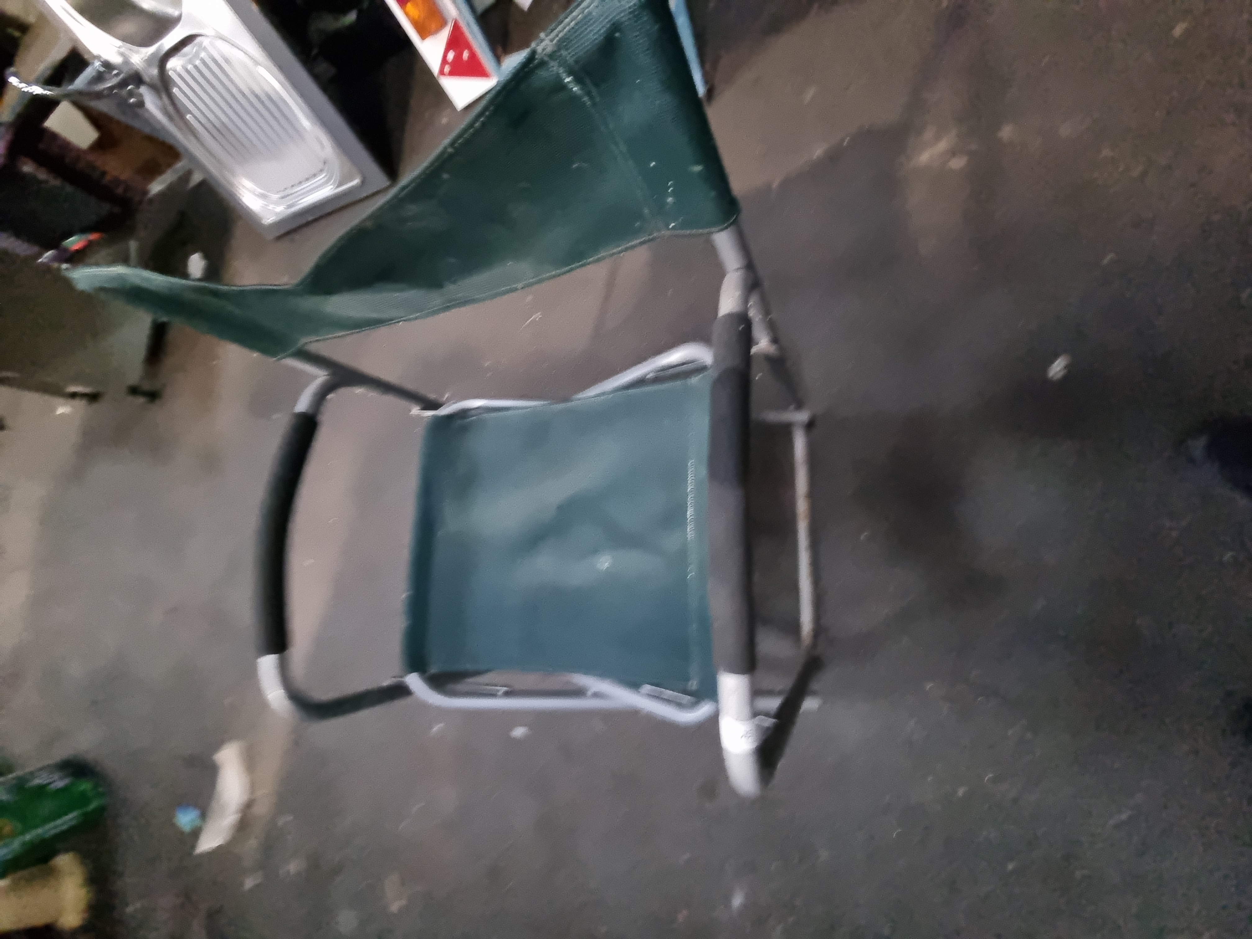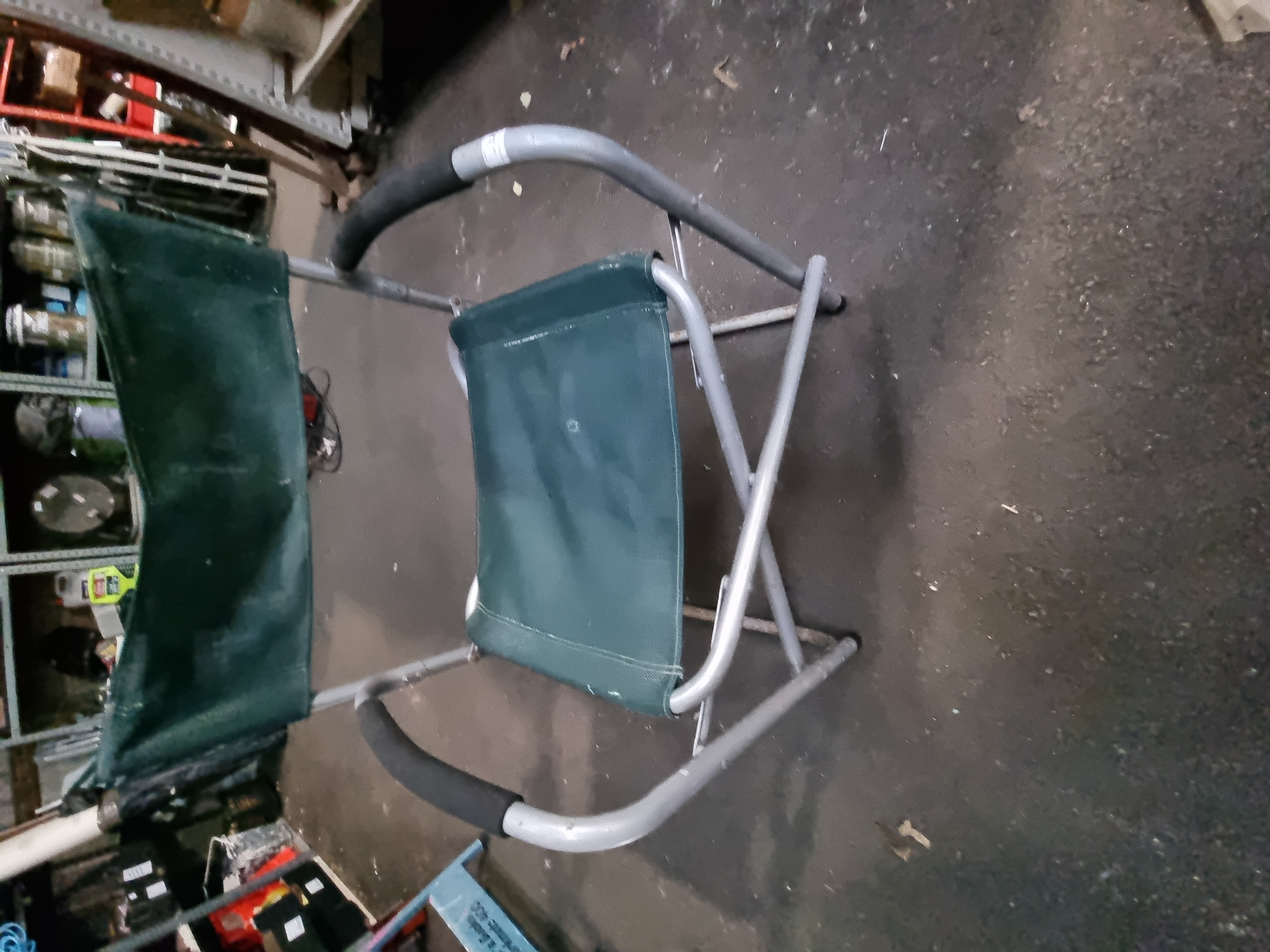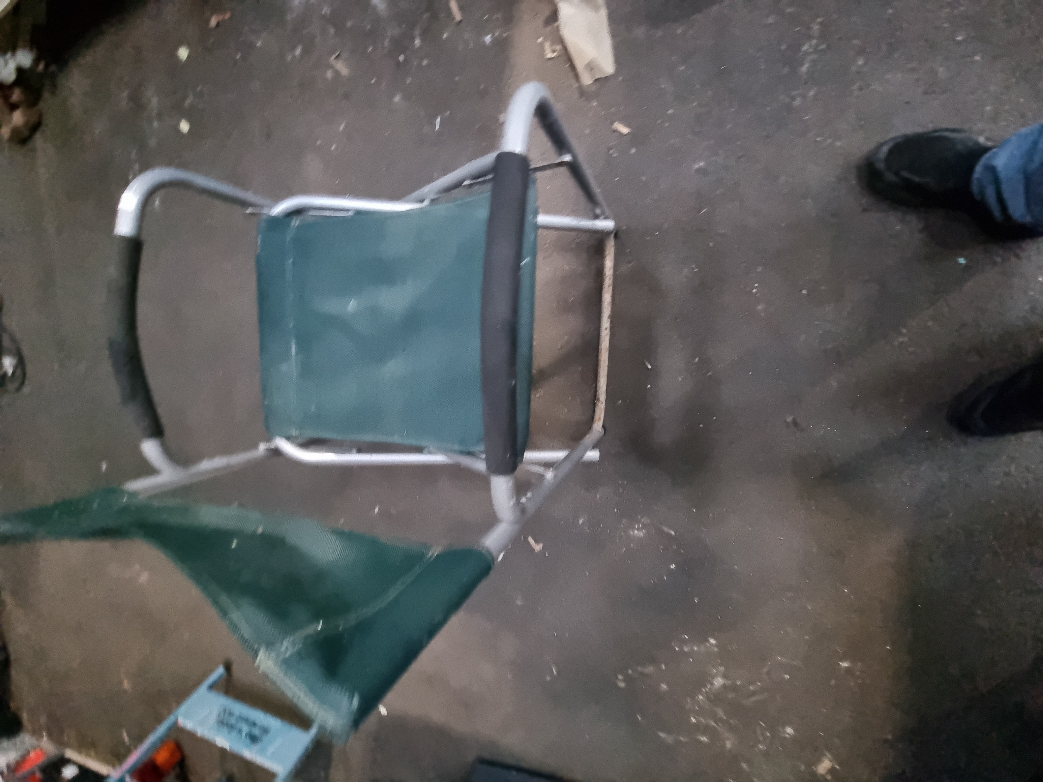 The chair is in used condition. There are visible surface marks and minor staining on the green fabric, along with light scuffing and wear consistent with outdoor use on the metal frame.