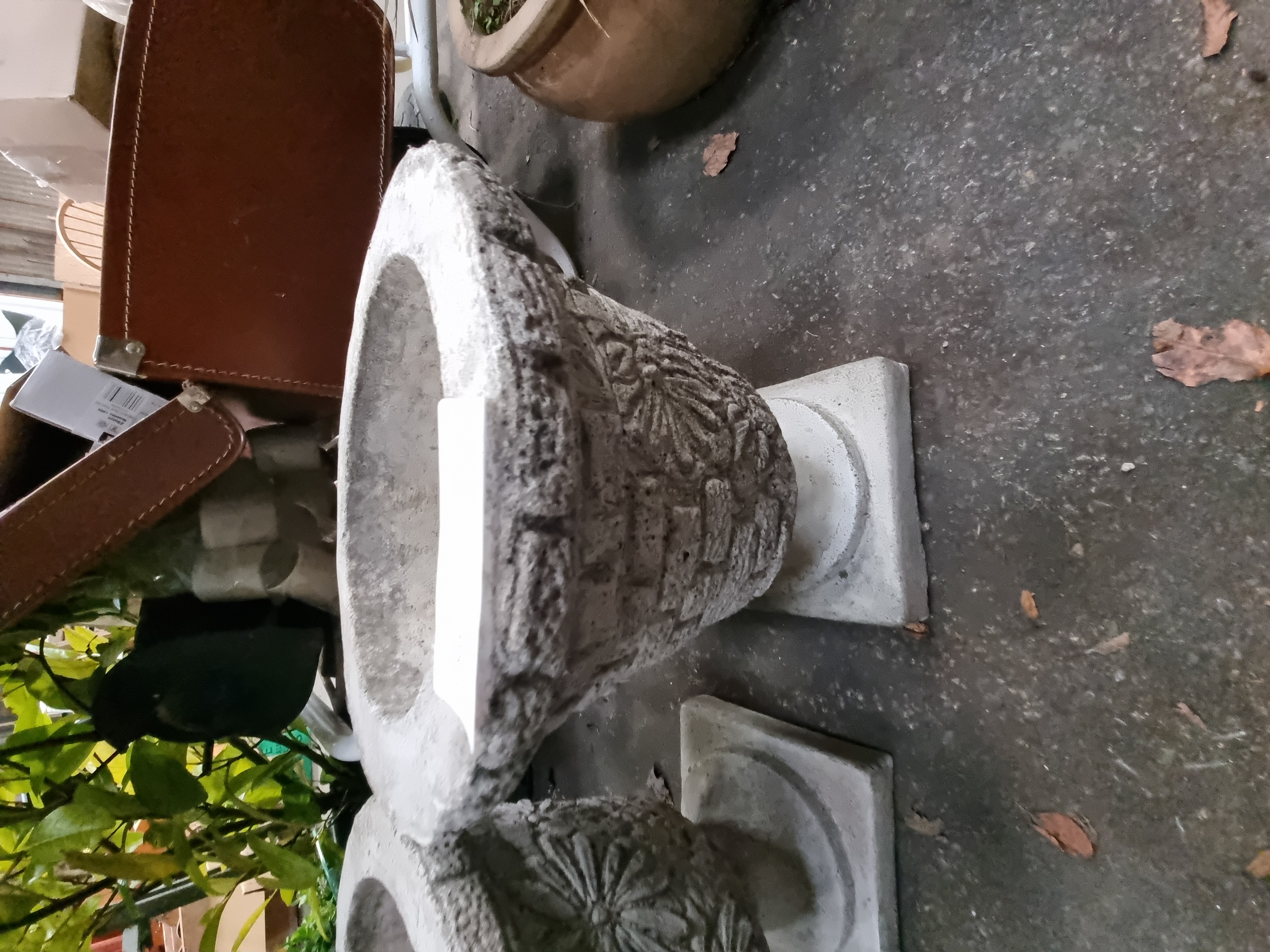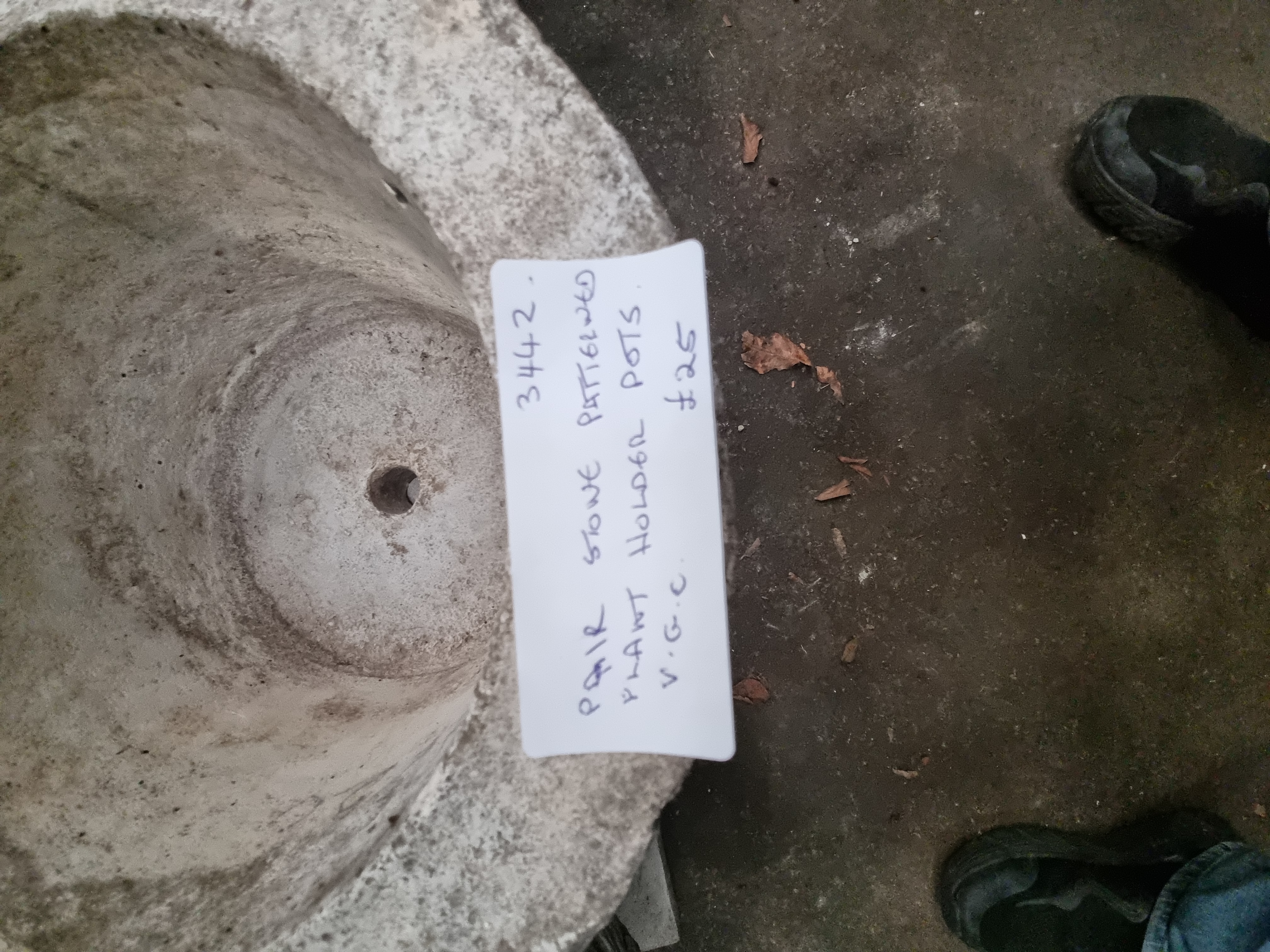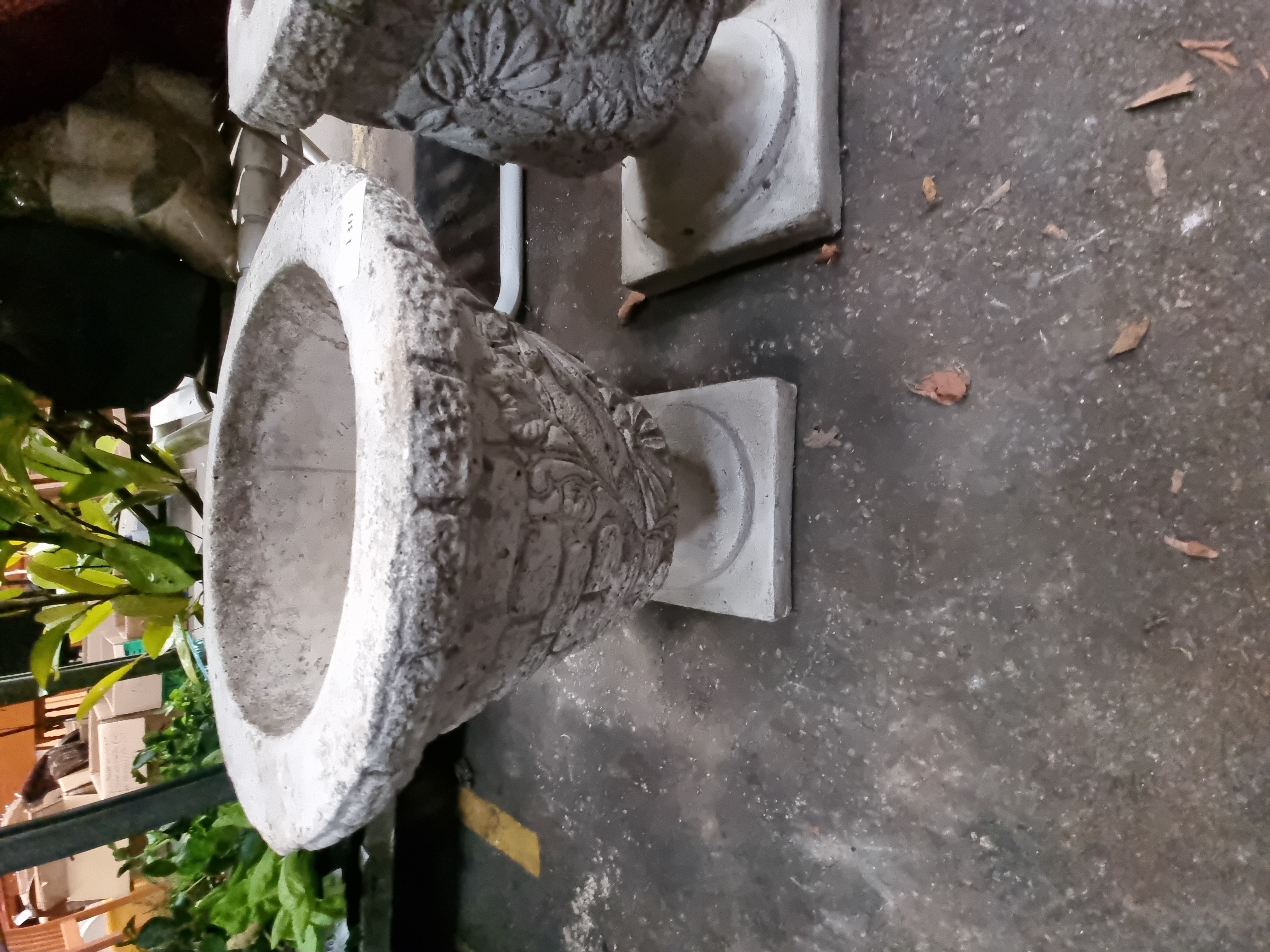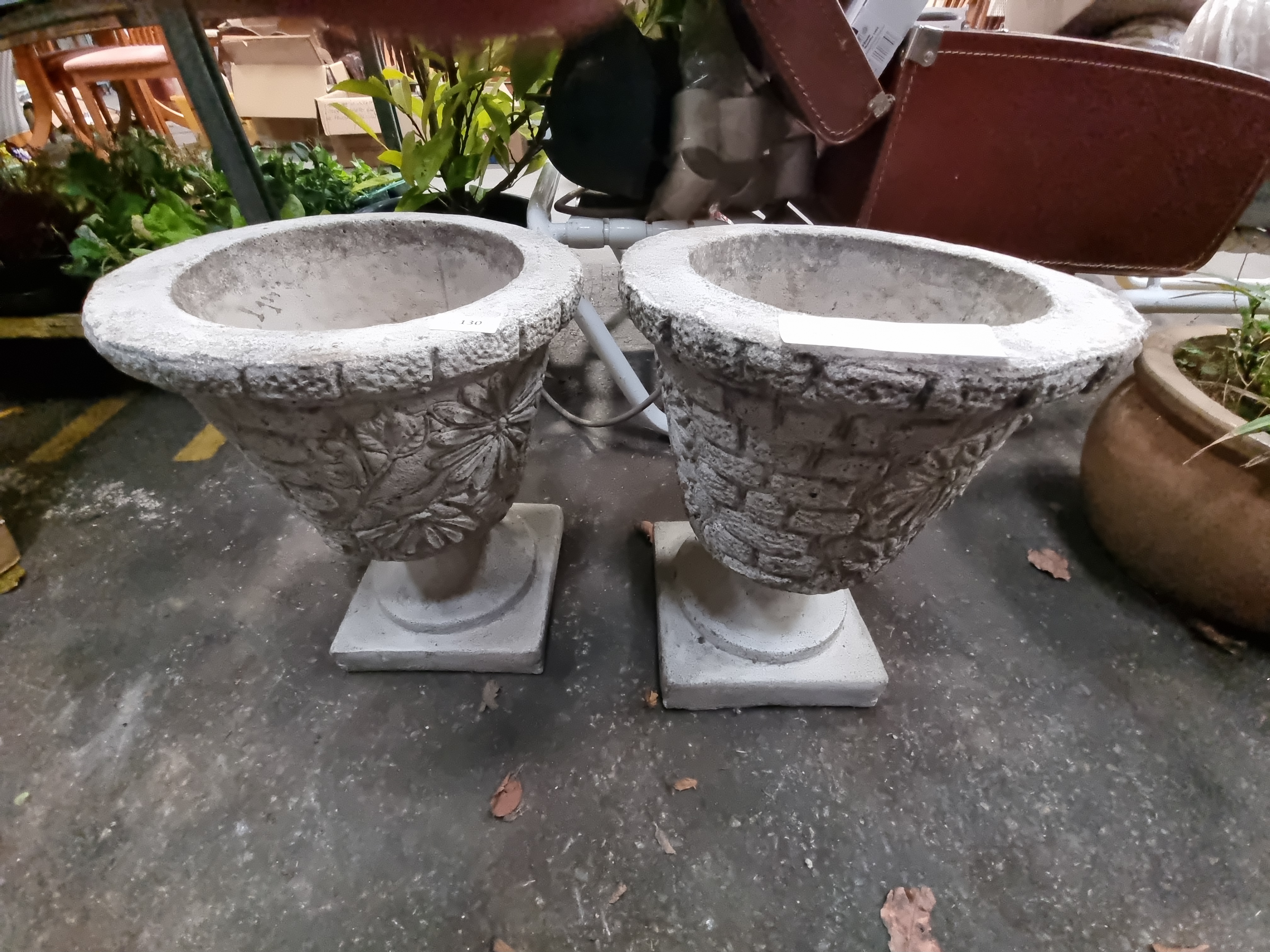 A pair of garden urns of tapered form, manufactured from cast reconstituted stone with a textured surface. The exterior of each vessel features relief-moulded decoration, with floral and foliate motifs on one side and a basketweave or brick-work pattern on the reverse. Each urn is supported by a short circular stem resting on a square pedestal base. The interiors are finished with a central drainage hole. No maker’s marks or signatures are visible.