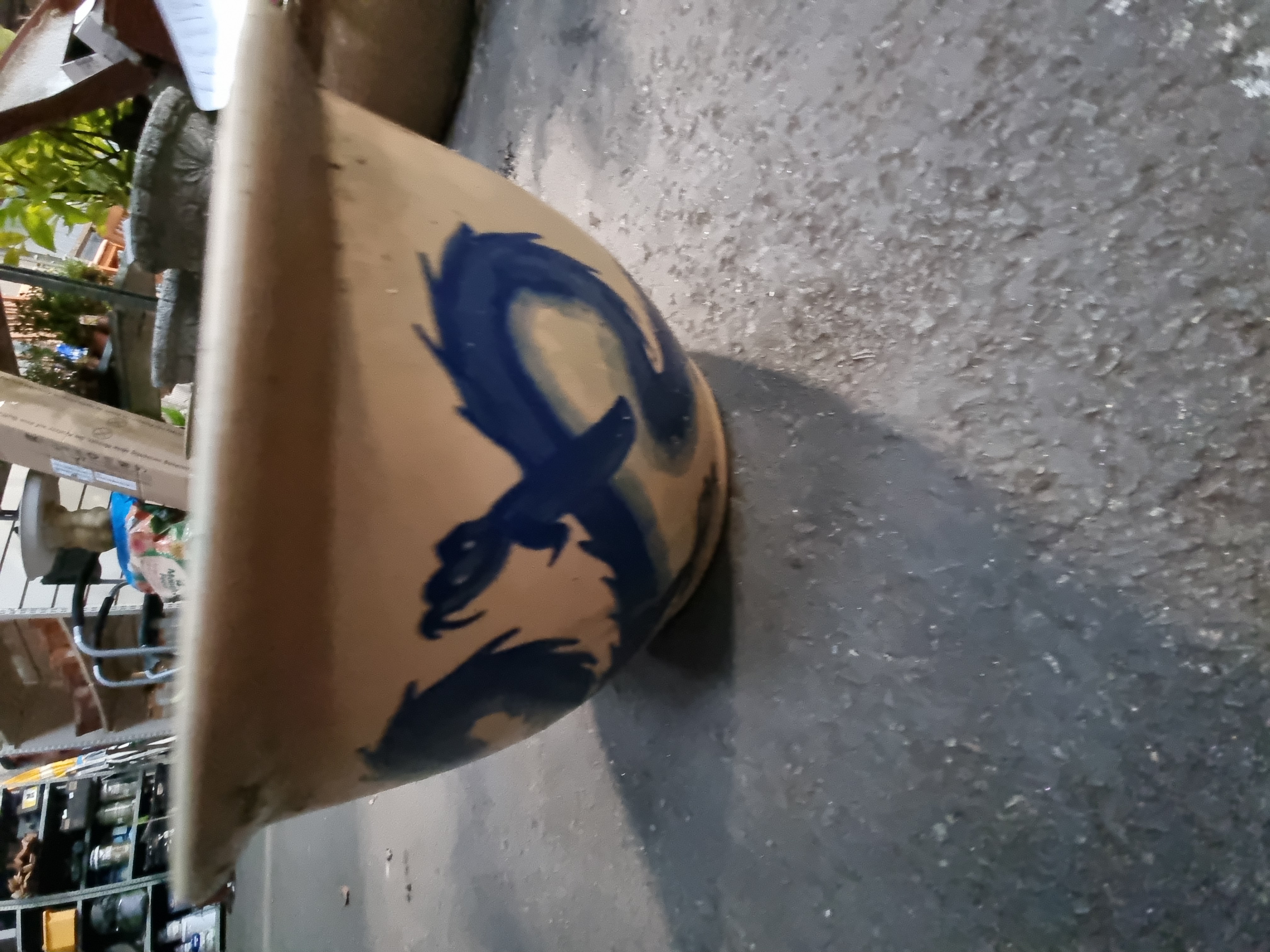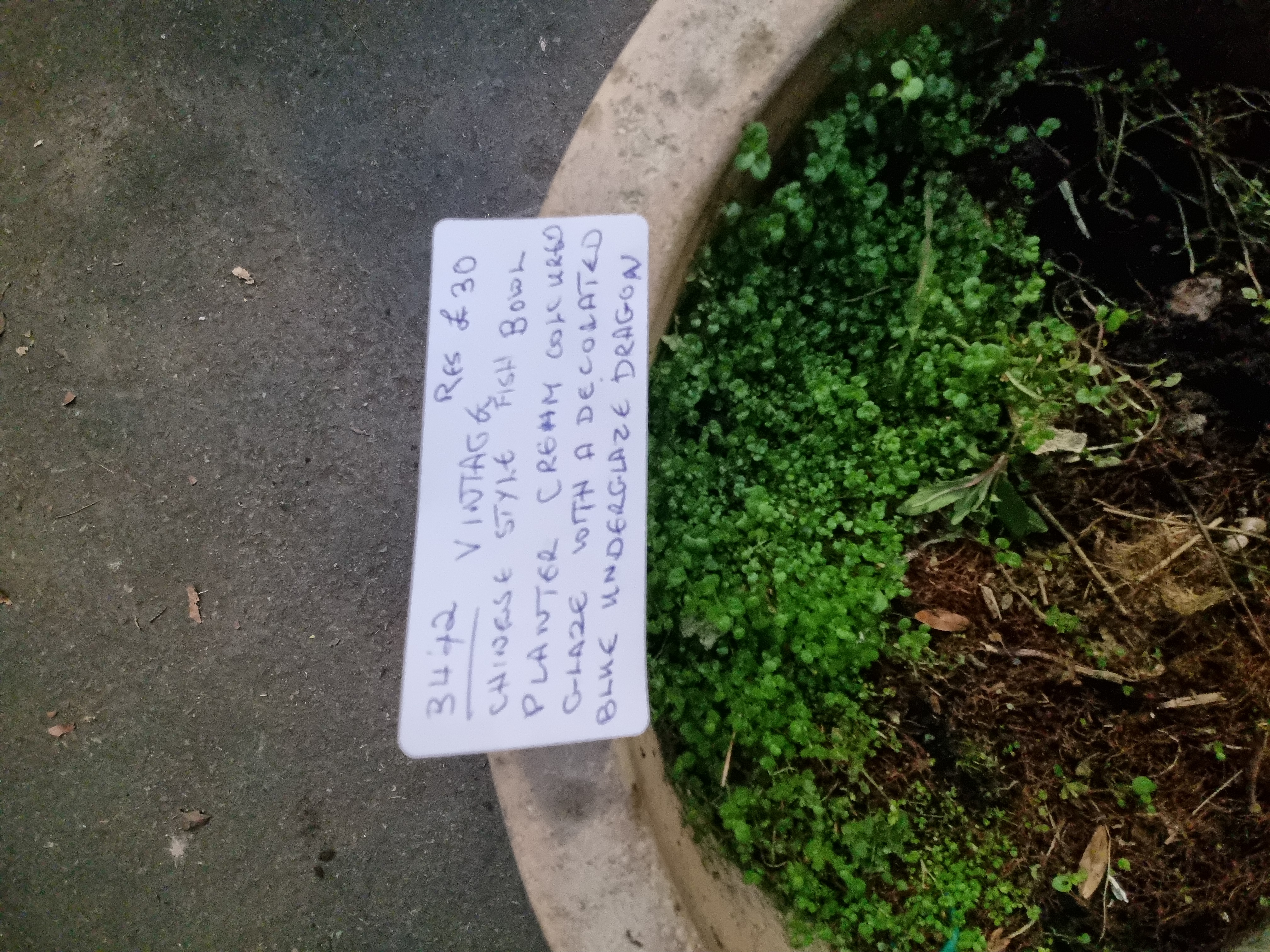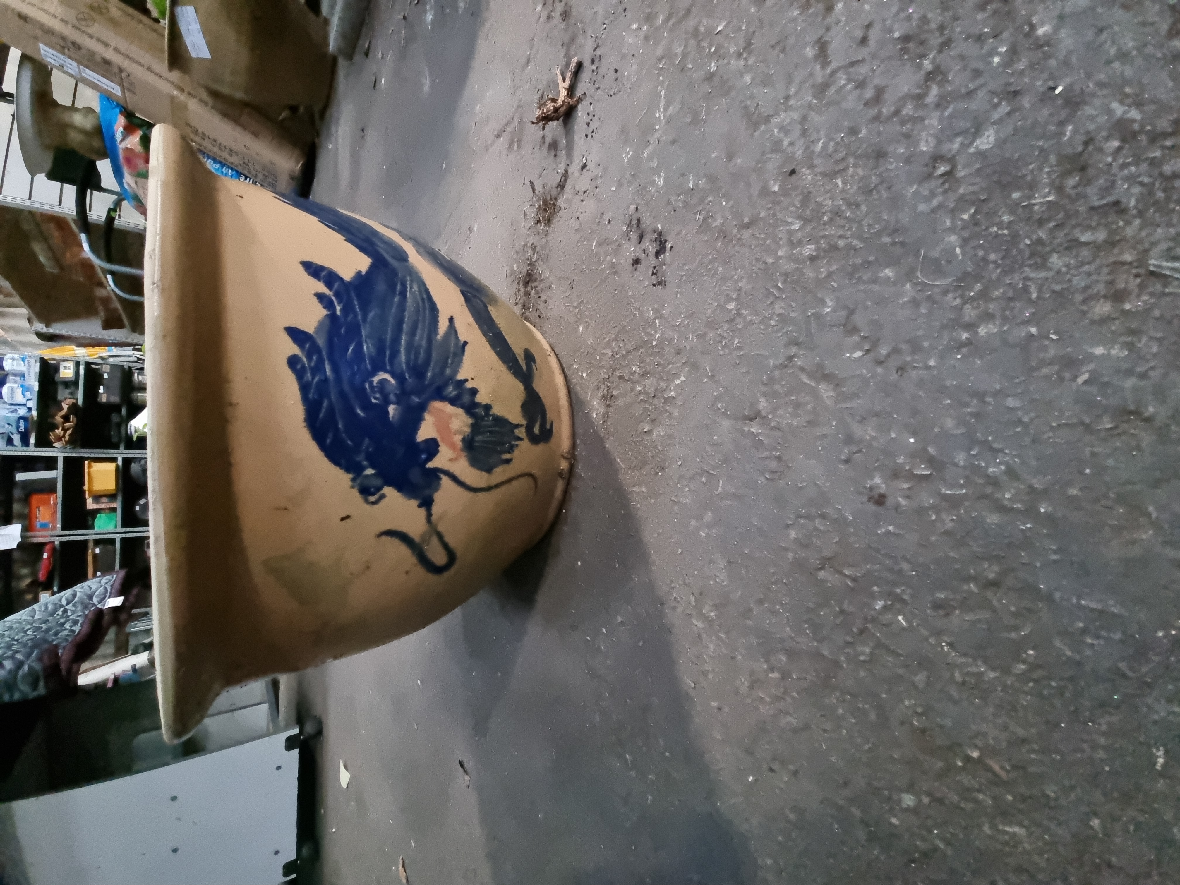 The item shows signs of use consistent with its function as a garden planter. The interior contains soil and organic matter. There is surface dirt and minor staining to the exterior glaze. No significant chips or cracks are immediately apparent, though there are minor surface abrasions and typical firing irregularities.