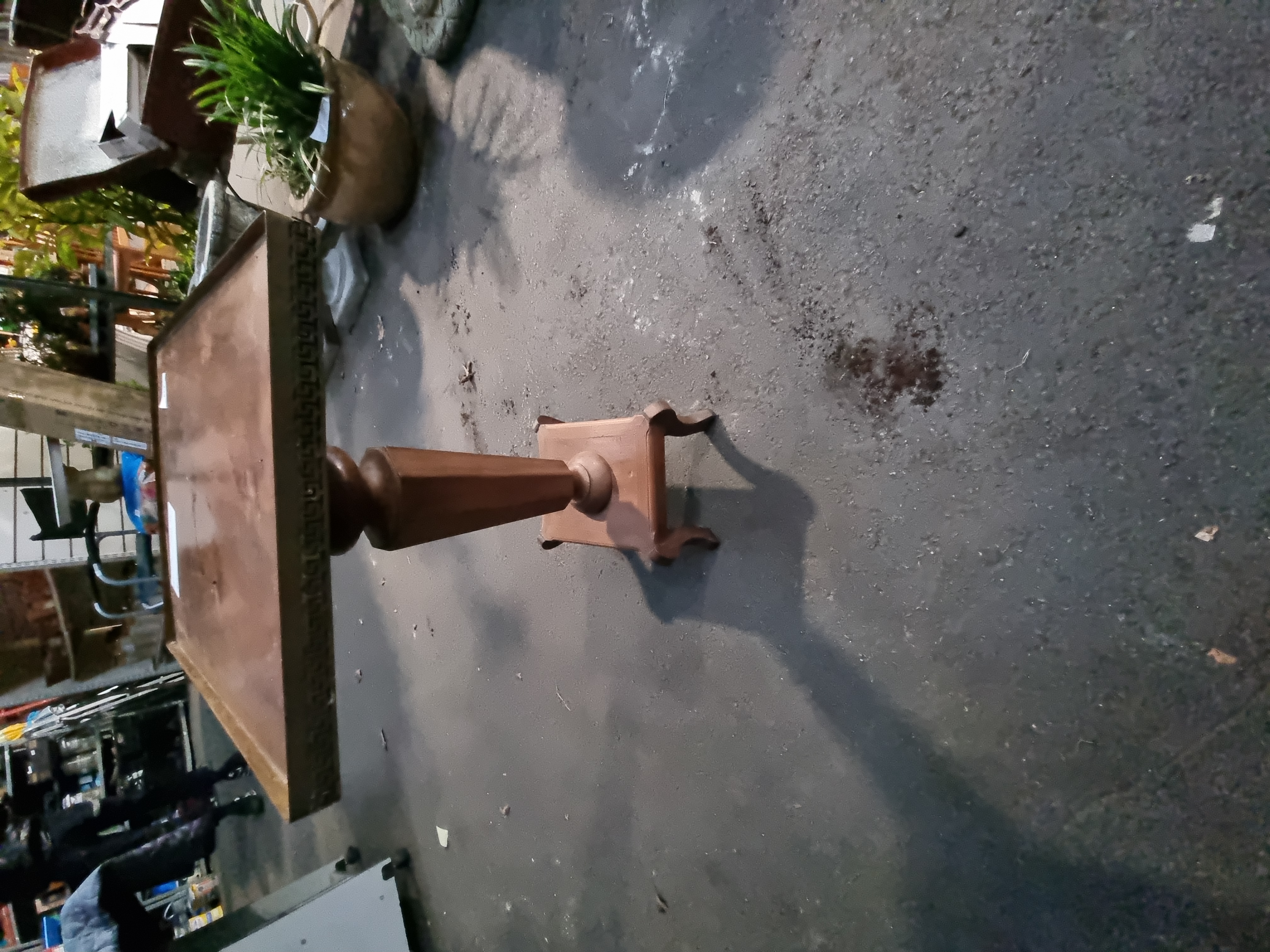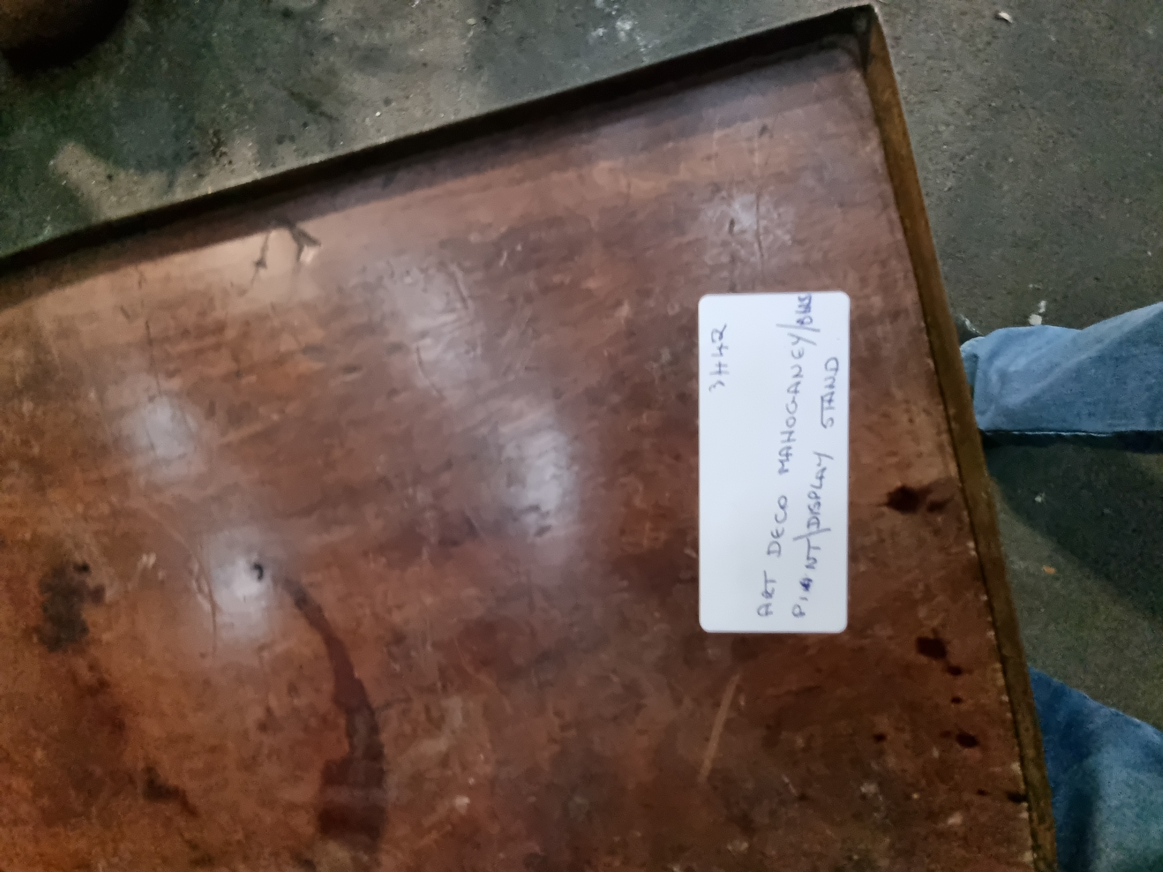 An Art Deco mahogany plant or display stand, dating from circa 1930s. The rectangular mahogany top is set within a raised, pierced metal gallery featuring a repeating geometric Greek key pattern. The structure features a central pedestal design with a tapered octagonal column mounted on a square plinth base. The base is supported by four out-swept stylised feet. No manufacturer marks, signatures, or factory stamps are visible on the base or body of the item. A handwritten identification label is present on the top surface.