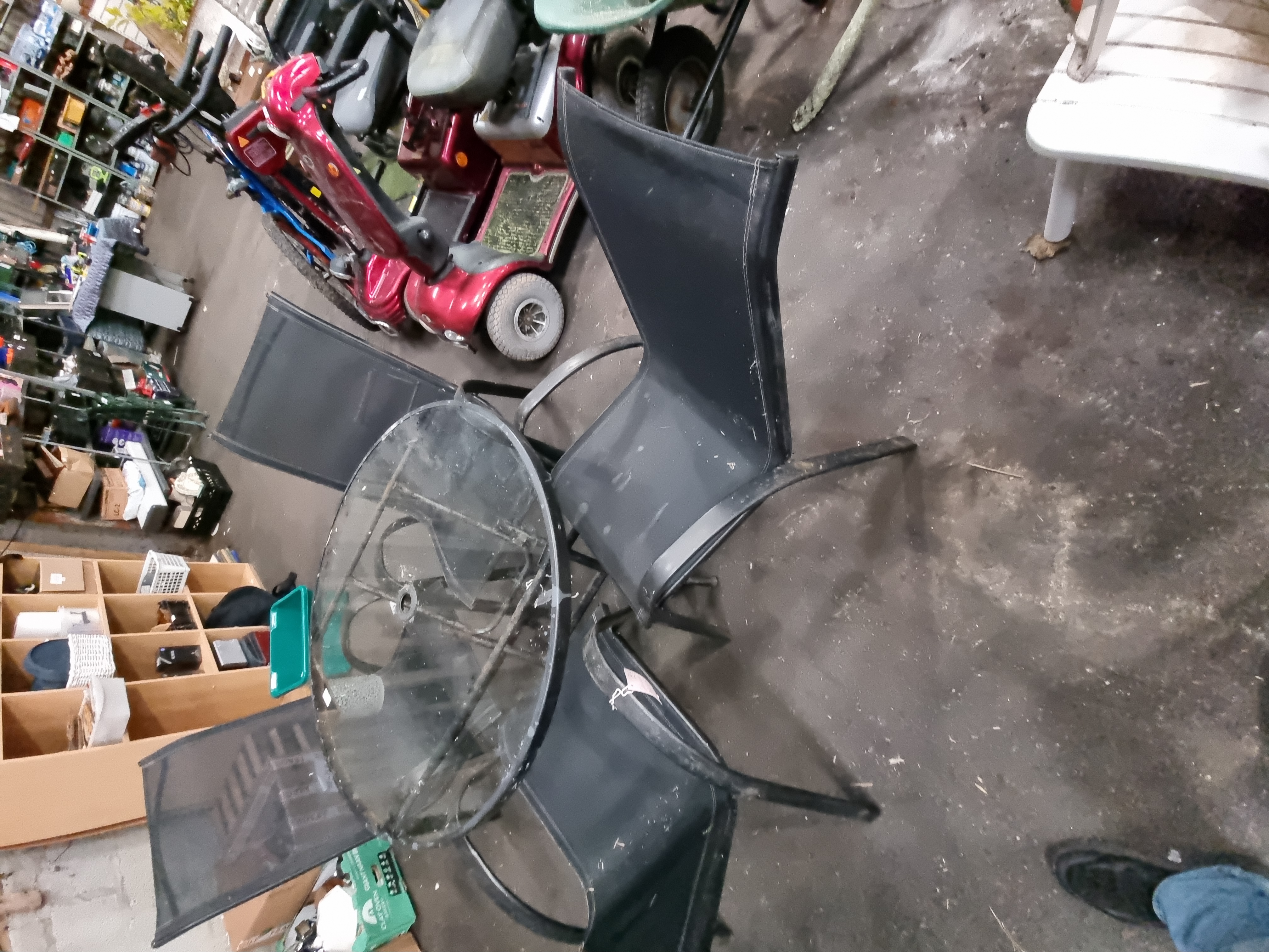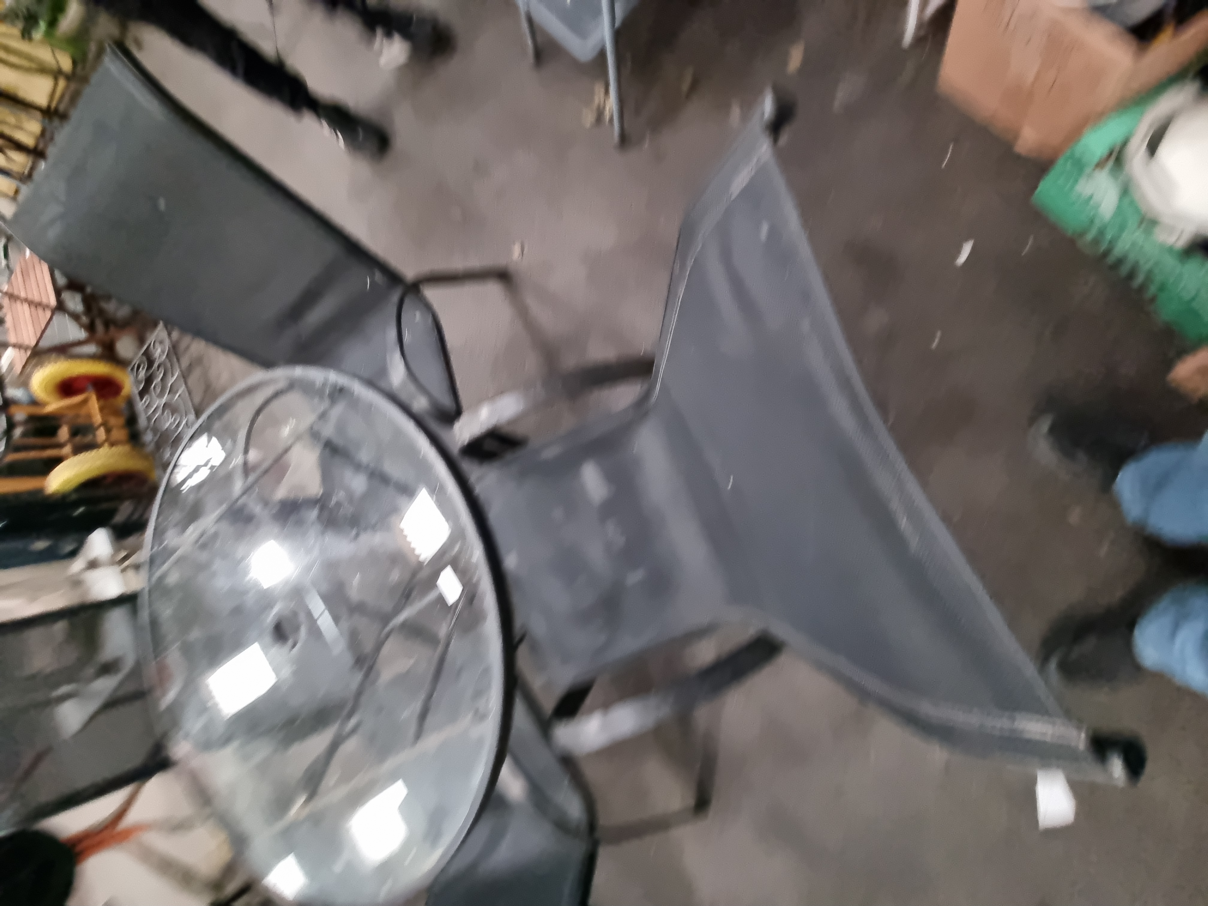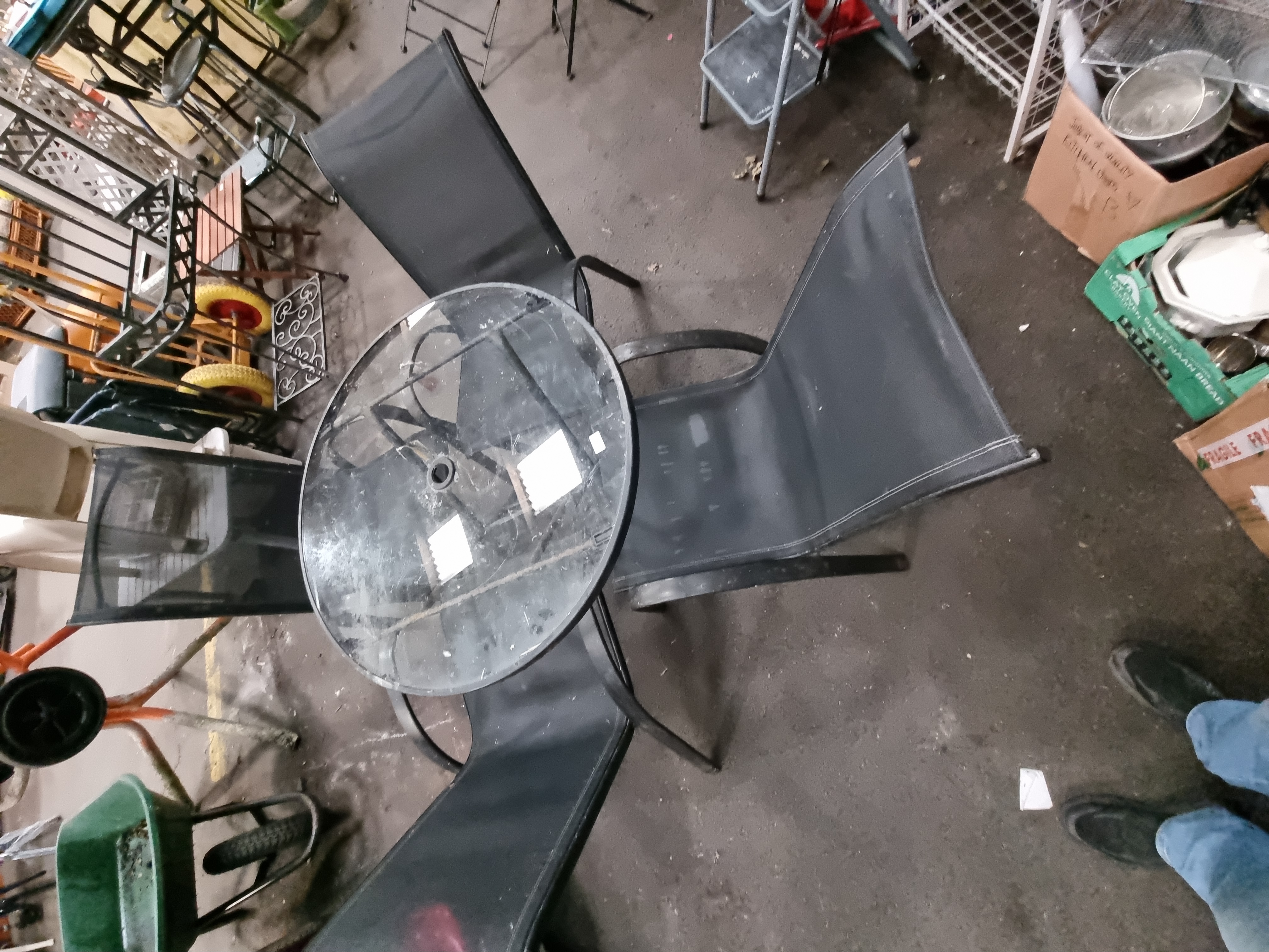 The set is in used condition with visible surface dust and dirt from storage. The metal frames show light signs of wear and minor scuffing consistent with age and outdoor use. The glass top requires cleaning.