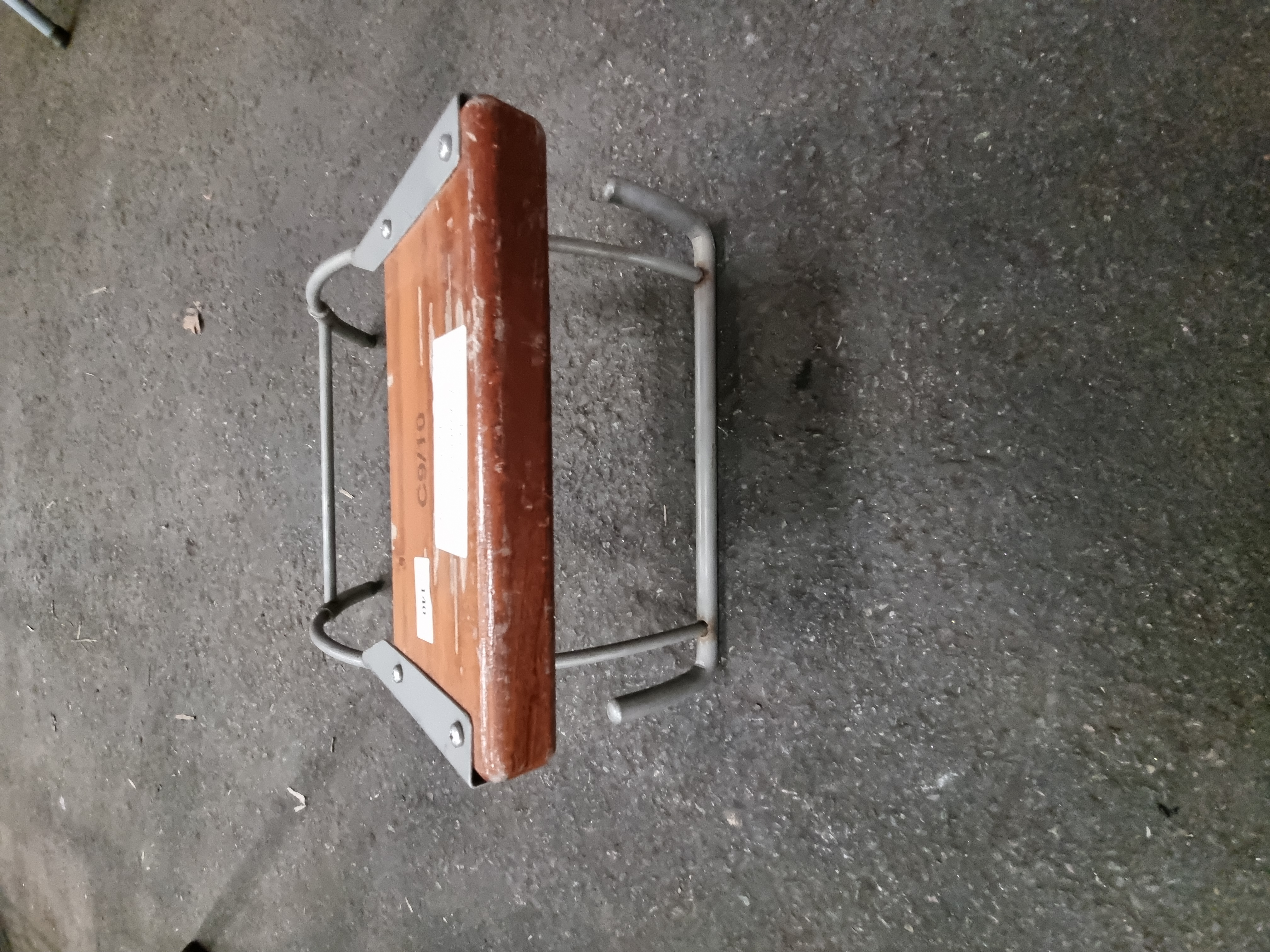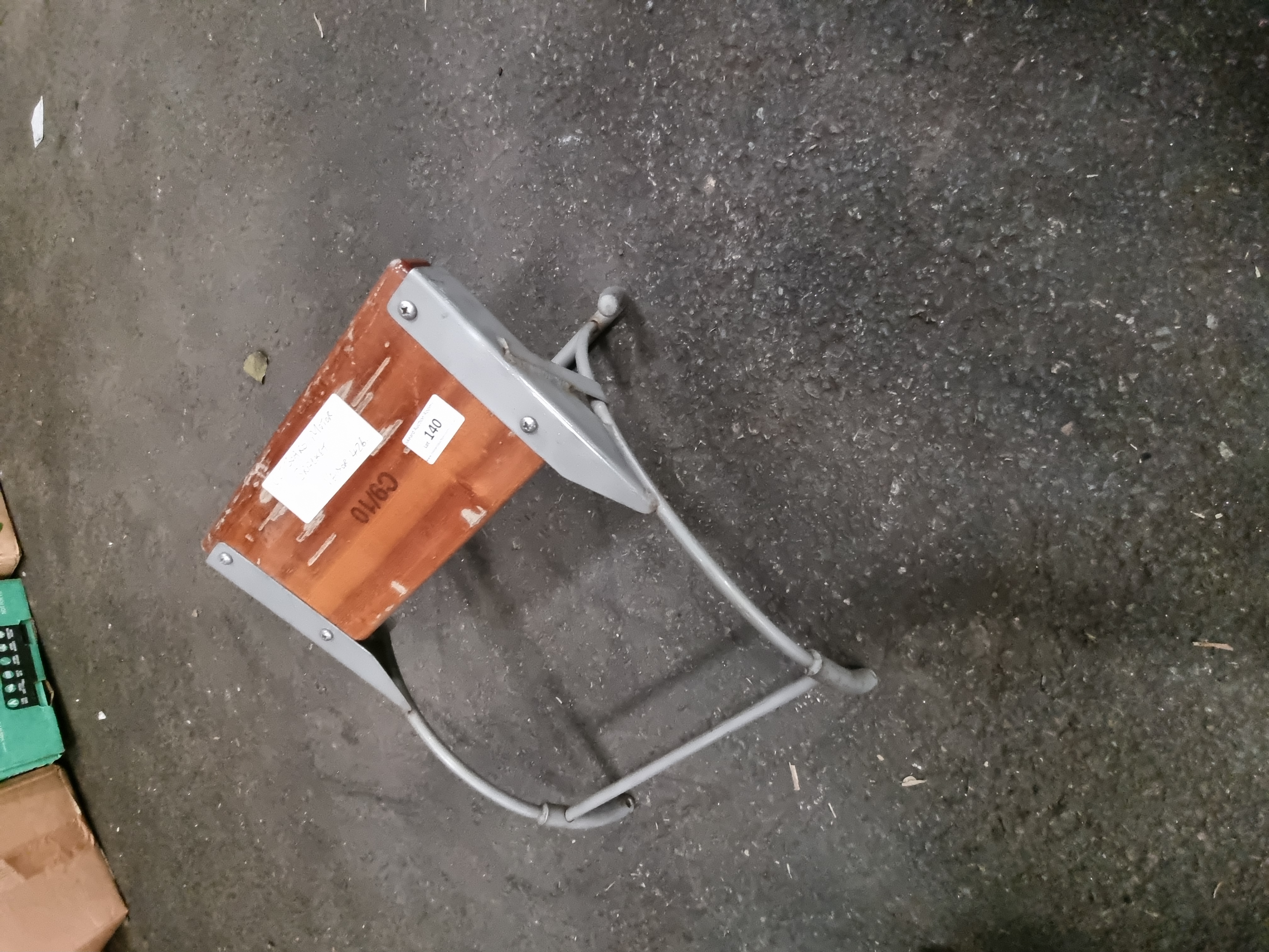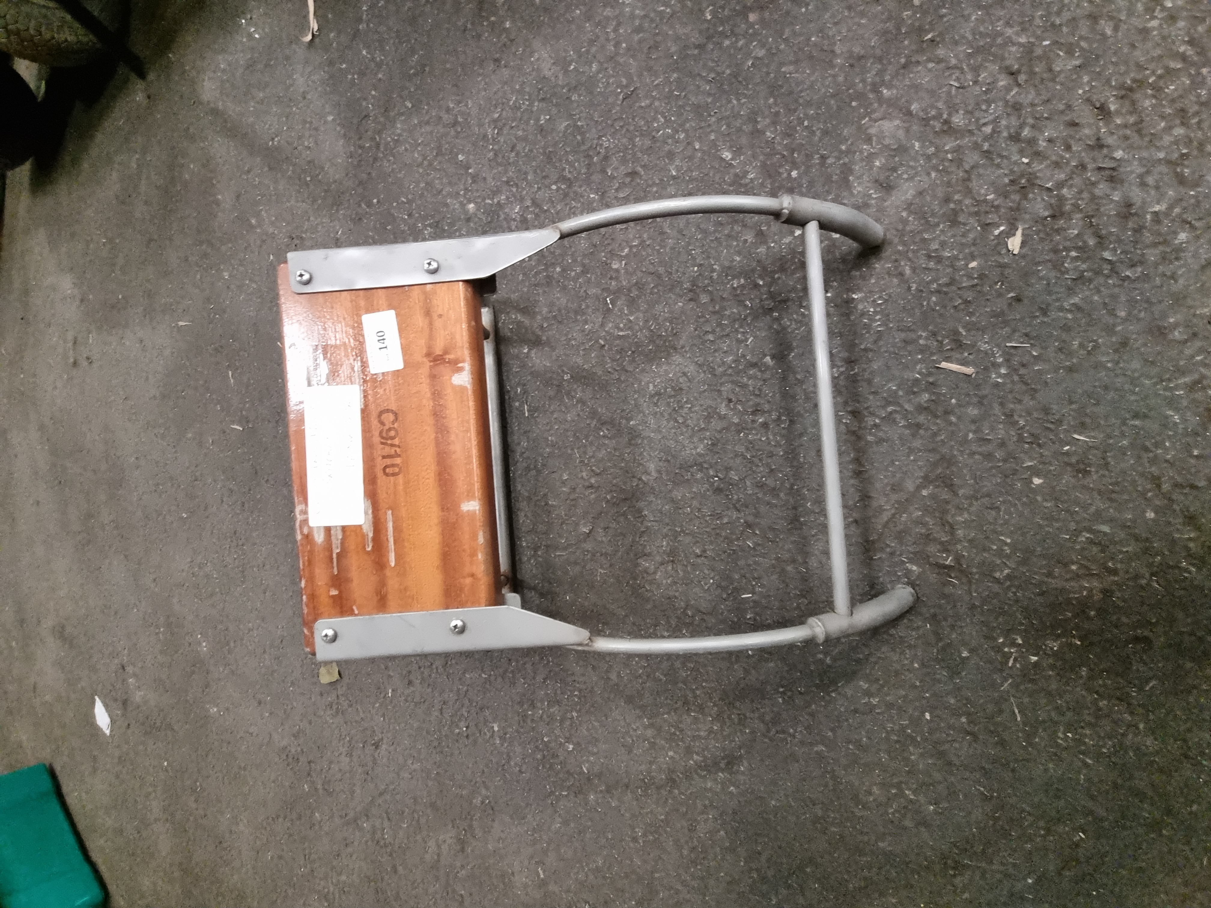 A mid-20th century marine accessory, identified as a transom motor mount for an inflatable boat, likely manufactured by Avon. The construction consists of a solid rectangular block of hardwood, possibly teak, which is secured by four screws through metal mounting plates to a grey-painted tubular steel frame. The frame features two arching side supports joined by a single lower cross-stretcher with welded joints. The wooden component is stamped with the characters C9/10 in black ink. There is a small white adhesive label marked 140 and a larger handwritten paper label that includes the text SHARP MOTORSAILING.
