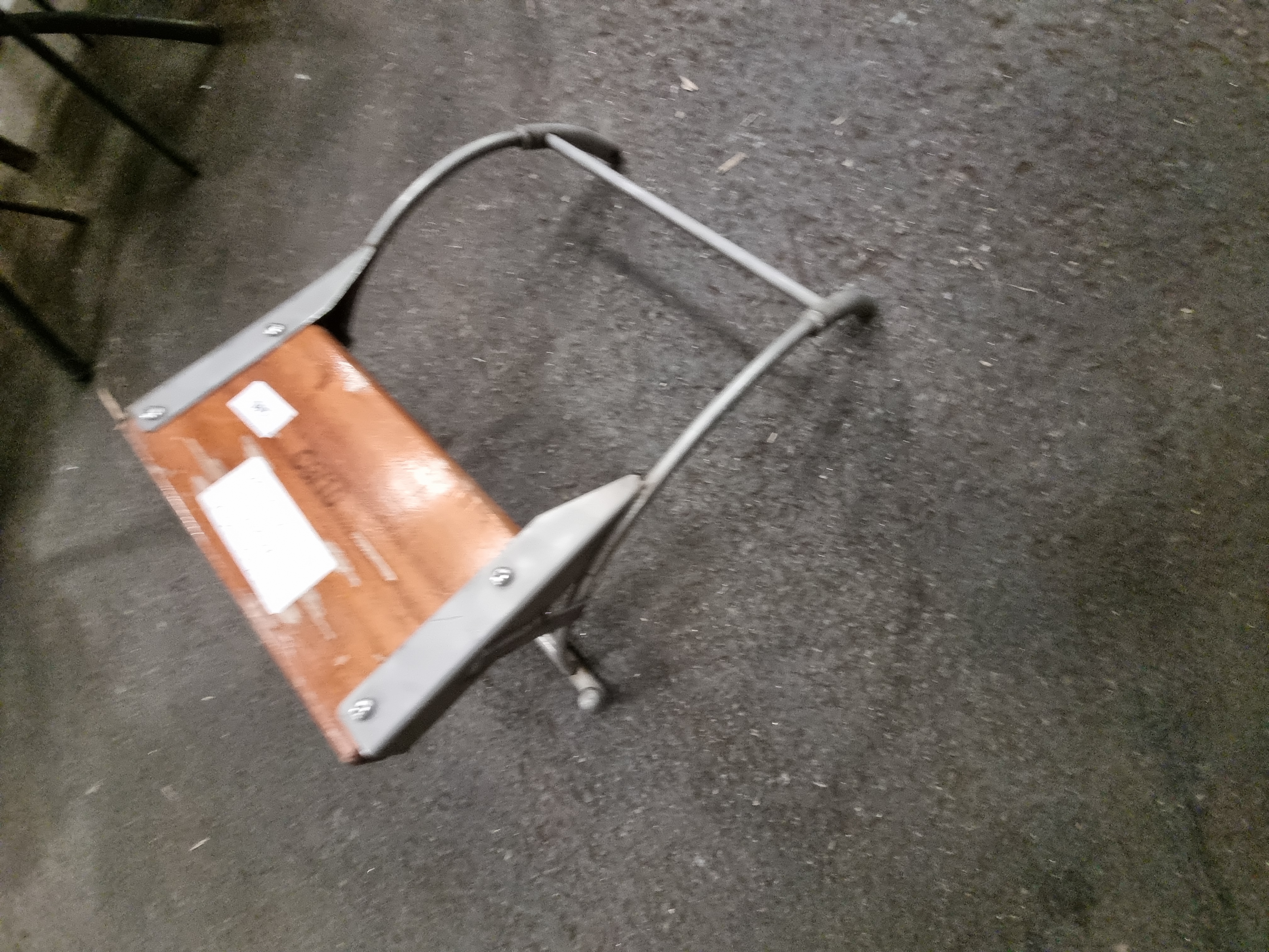 The item is in used condition, showing signs of wear consistent with age and marine environments. There are surface scratches, scuffs, and finish loss to the wooden block. The grey-painted metal frame shows typical scuffs and minor areas of paint loss.