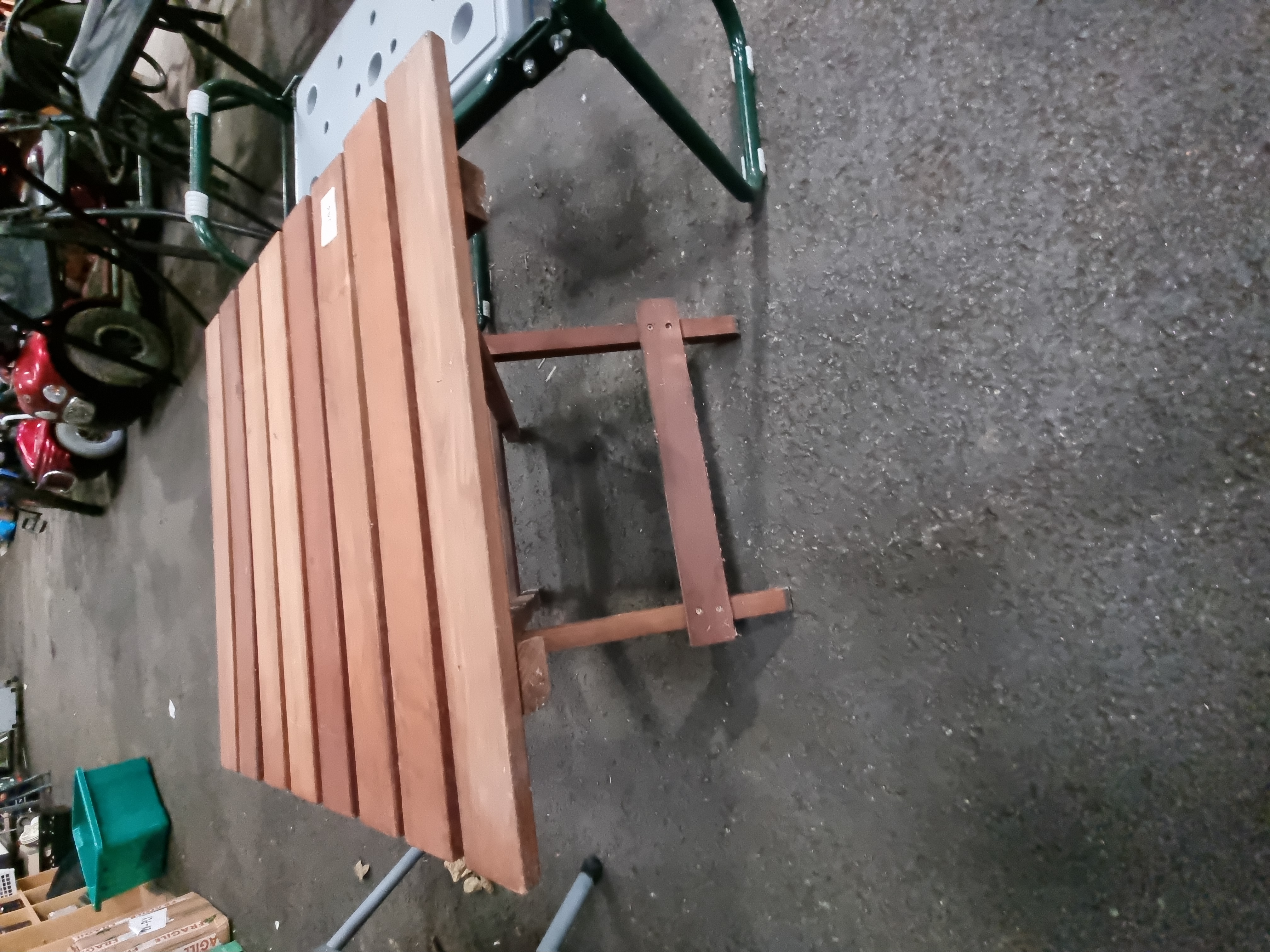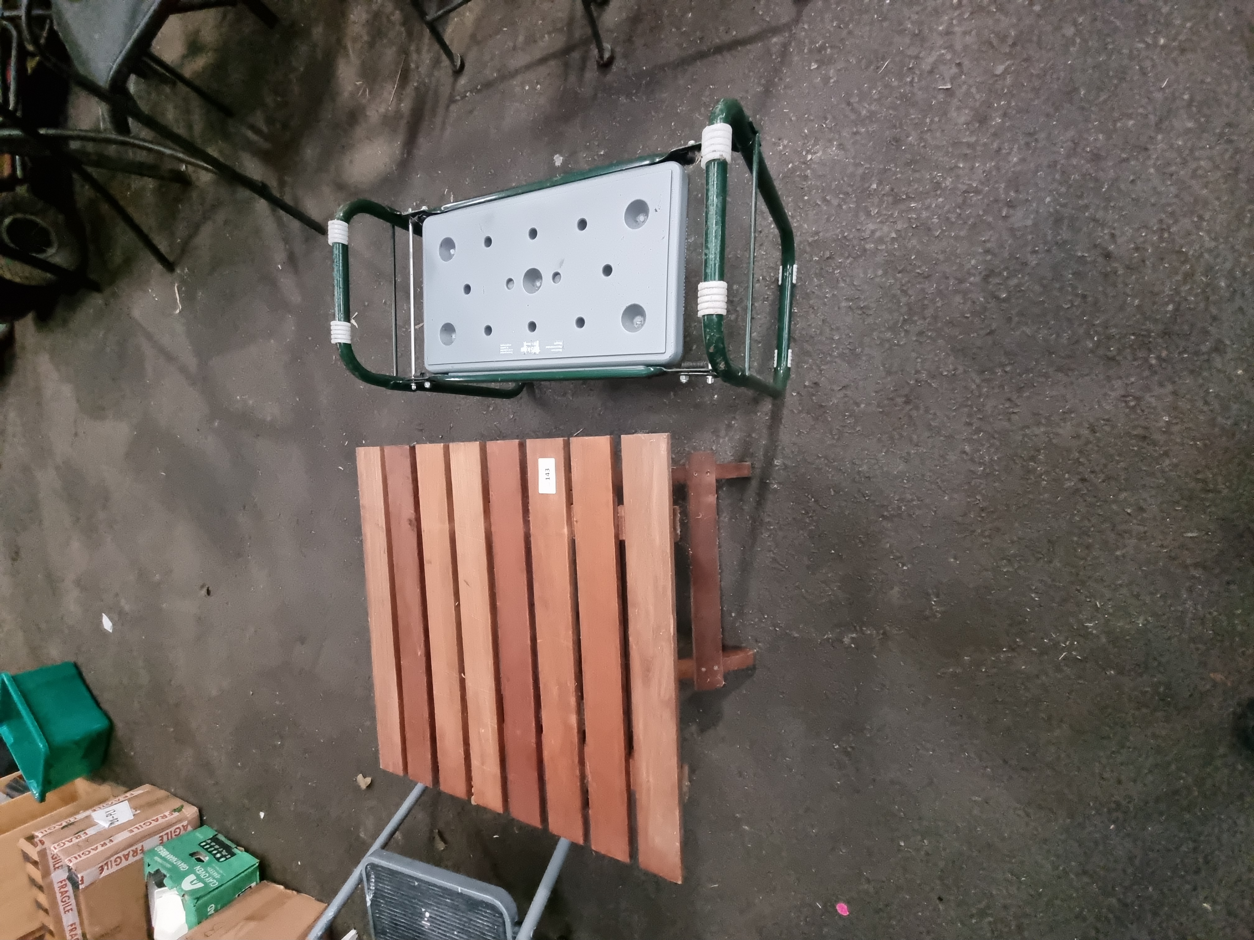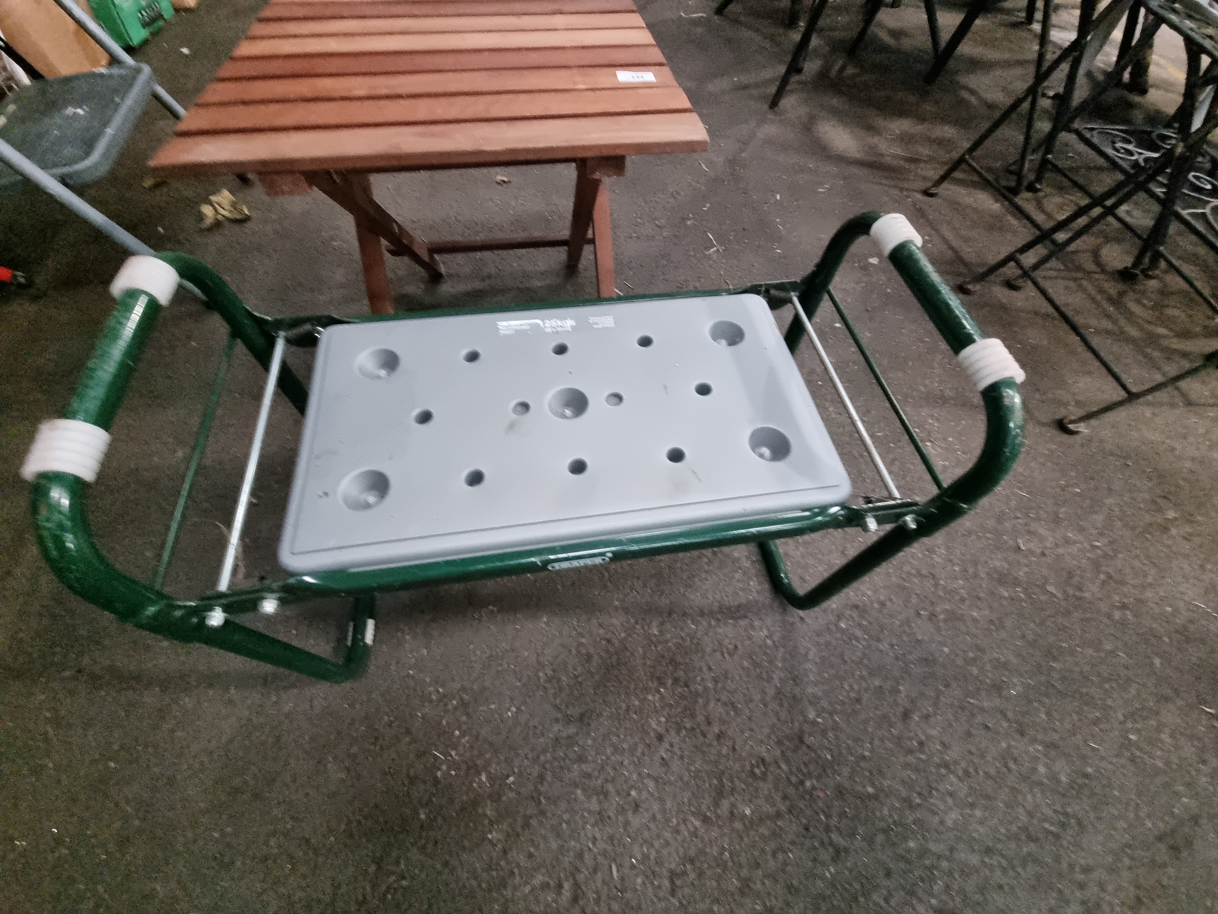 Lot 143: Two items of garden furniture comprising a Draper folding garden kneeler and a folding teak slatted table