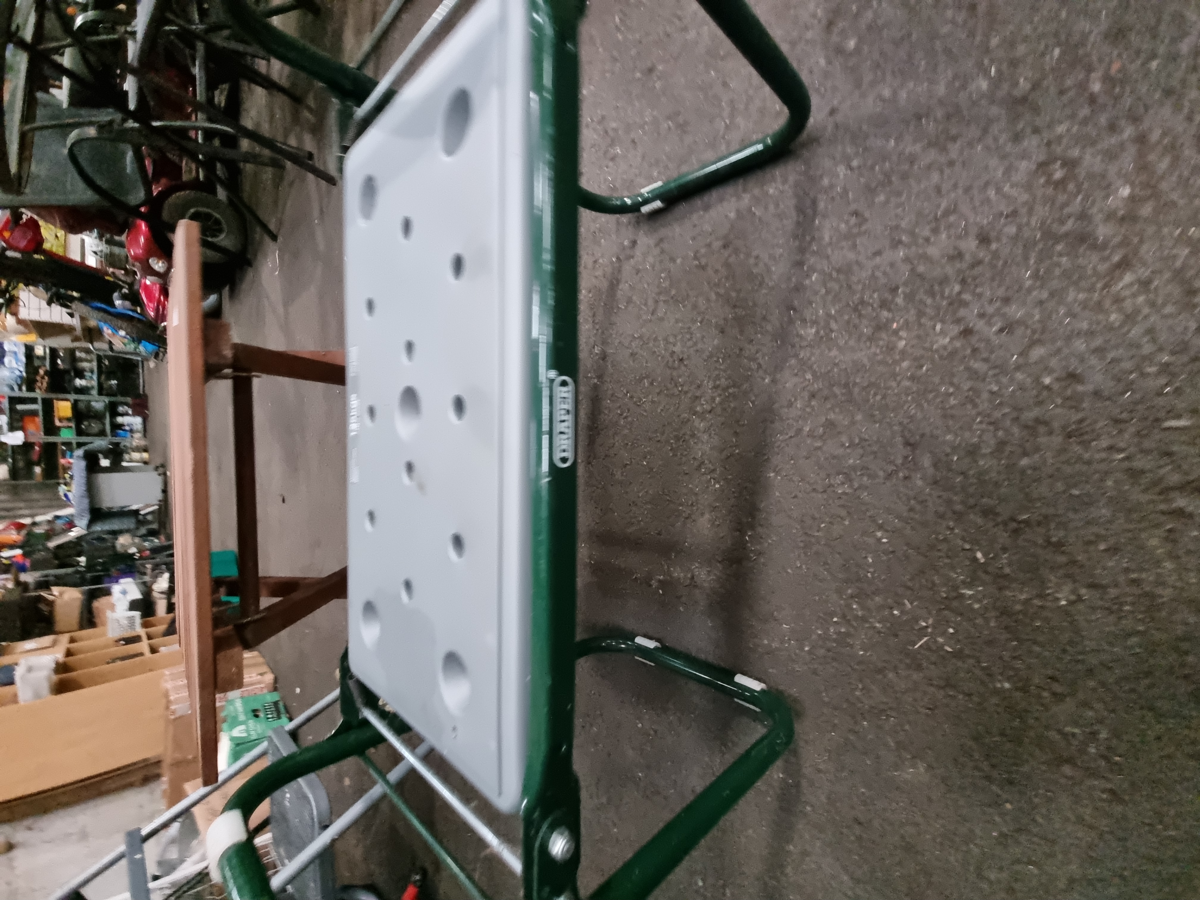 A group of garden furniture comprising a Draper folding garden kneeler and a wooden slatted table. The garden kneeler is constructed with a green painted tubular metal frame and a grey padded plastic seat with circular indentations. The frame bears a Draper manufacturer label and the seat is marked with a maximum load capacity of 125kg. The accompanying wooden table features a rectangular top composed of parallel slats supported by a folding X-frame base, finished in a reddish-brown stain.