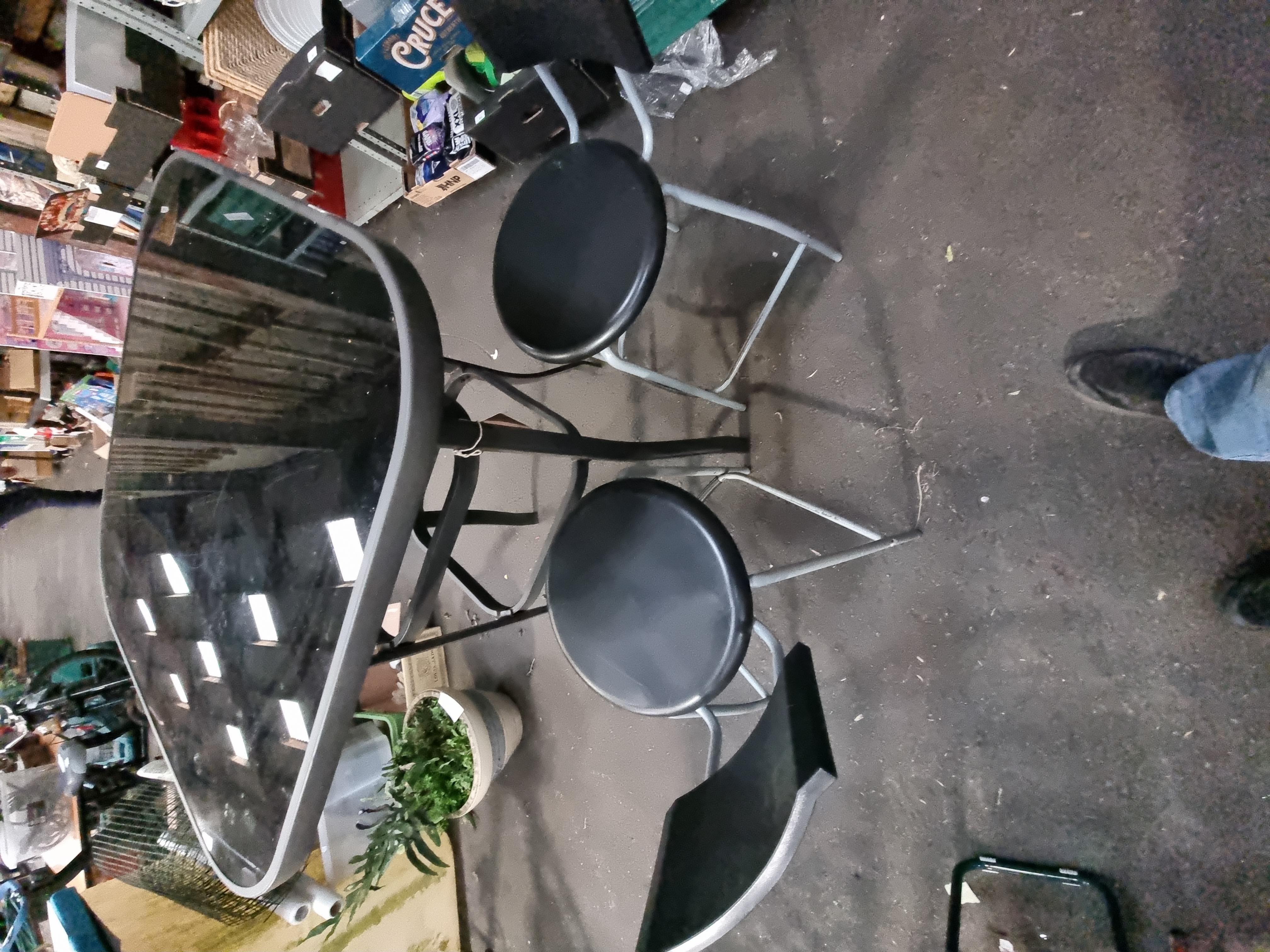 Lot 144: A Contemporary Three Piece Breakfast Set Comprising a Glass Top Bar Table and Two Folding Stools