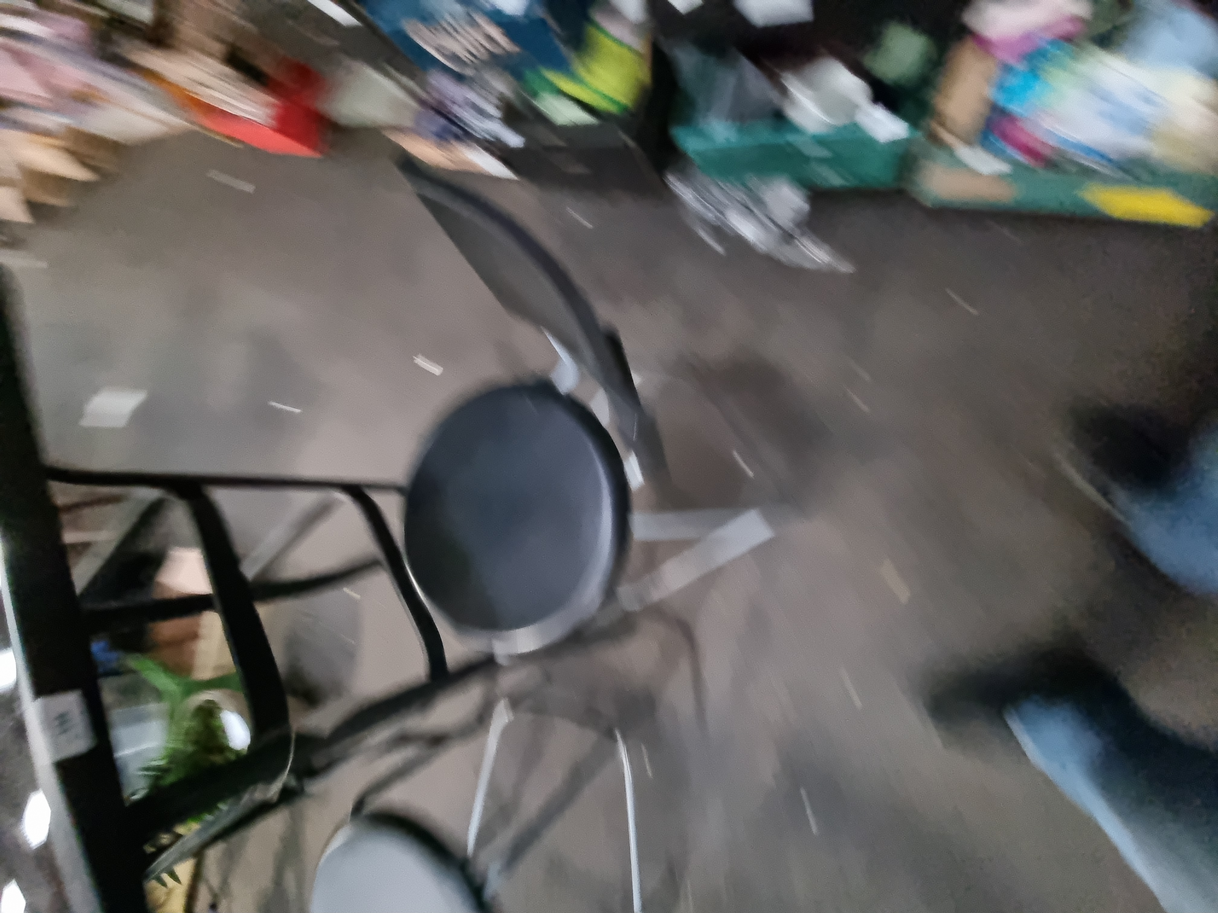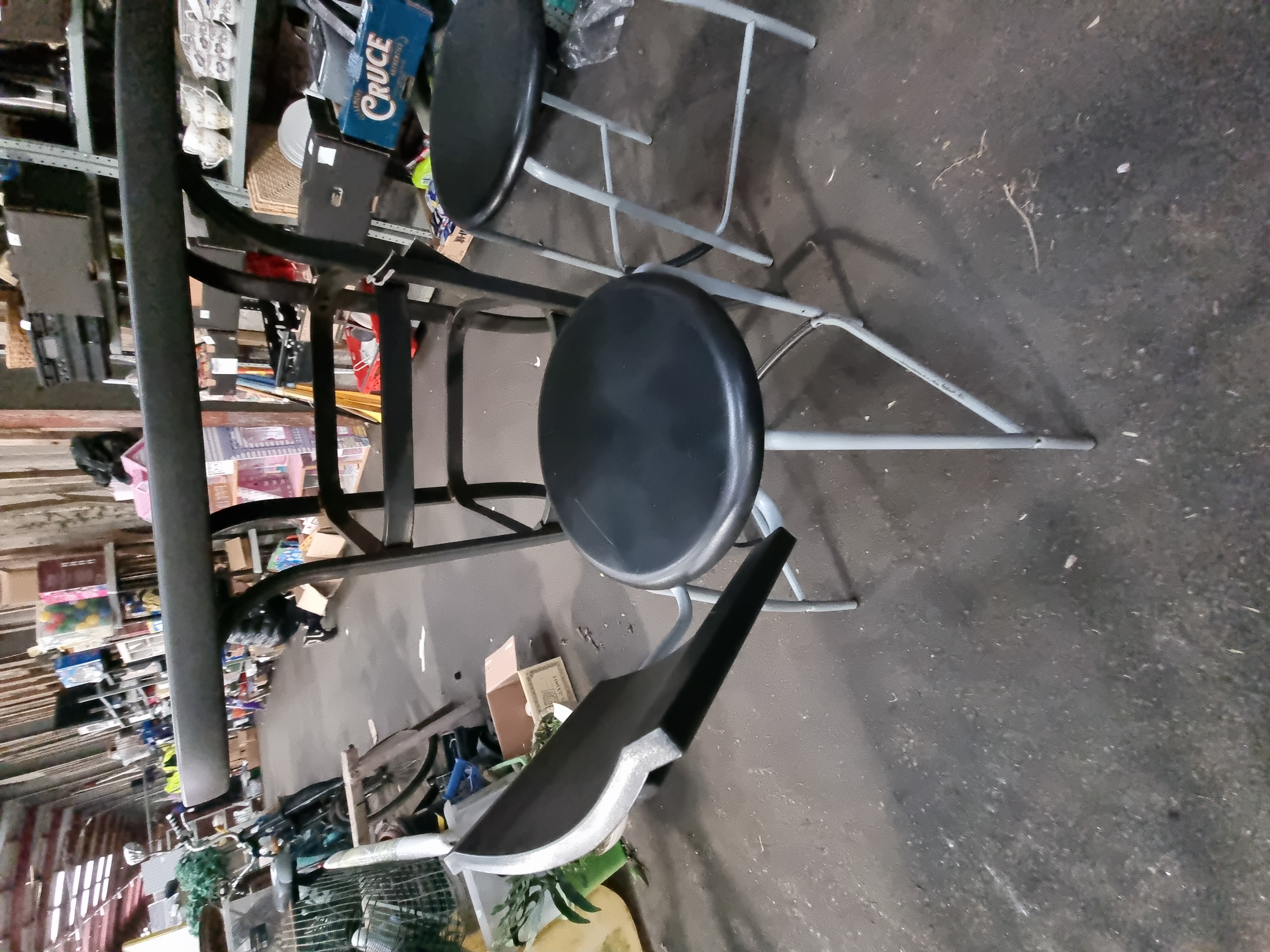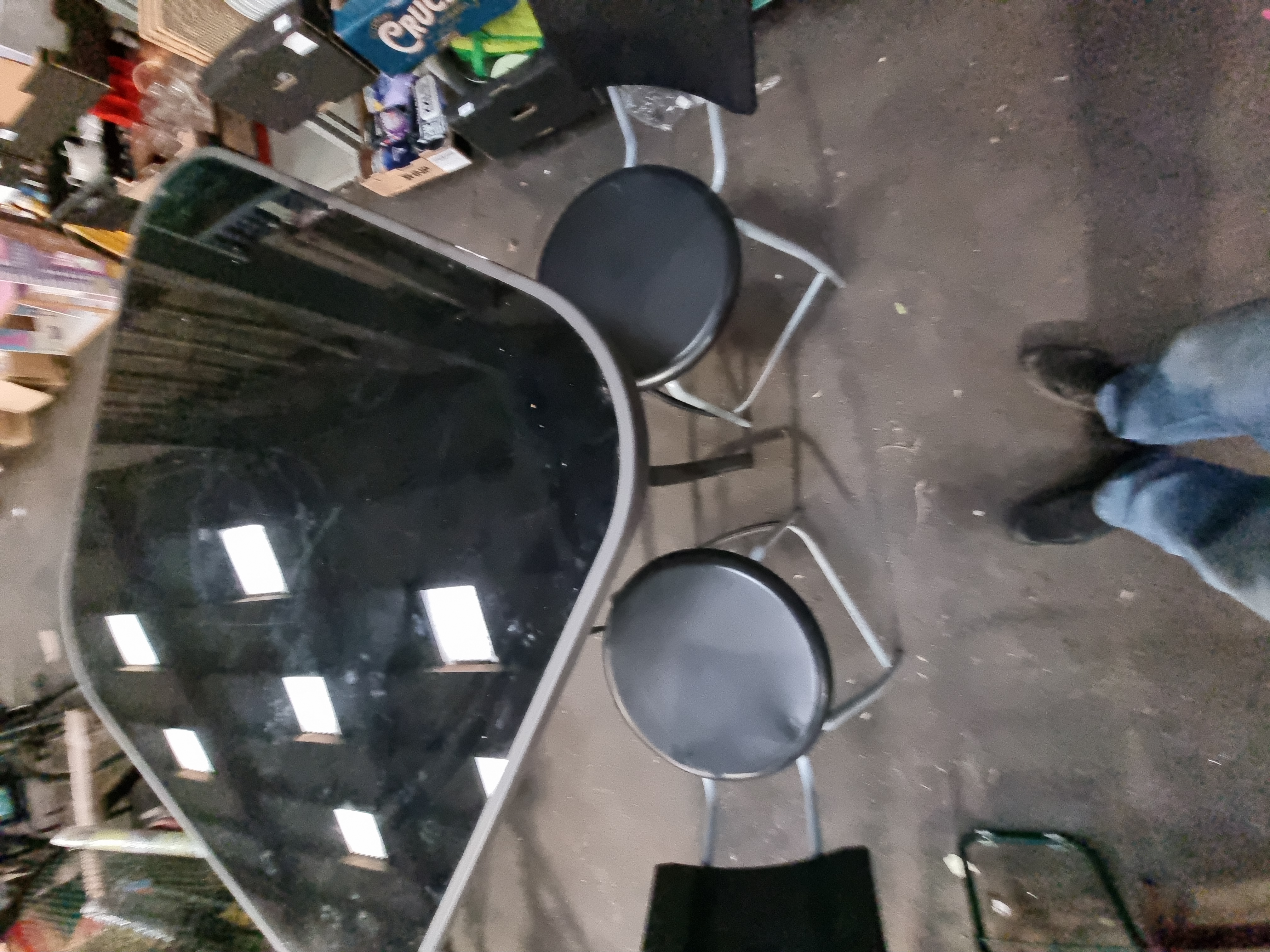 The set is in used condition. The glass table top exhibits significant surface scratching and smudging consistent with regular use. There are minor scuffs and marks to the painted metal frames of both the table and the stools. The items show an accumulation of dust from storage.