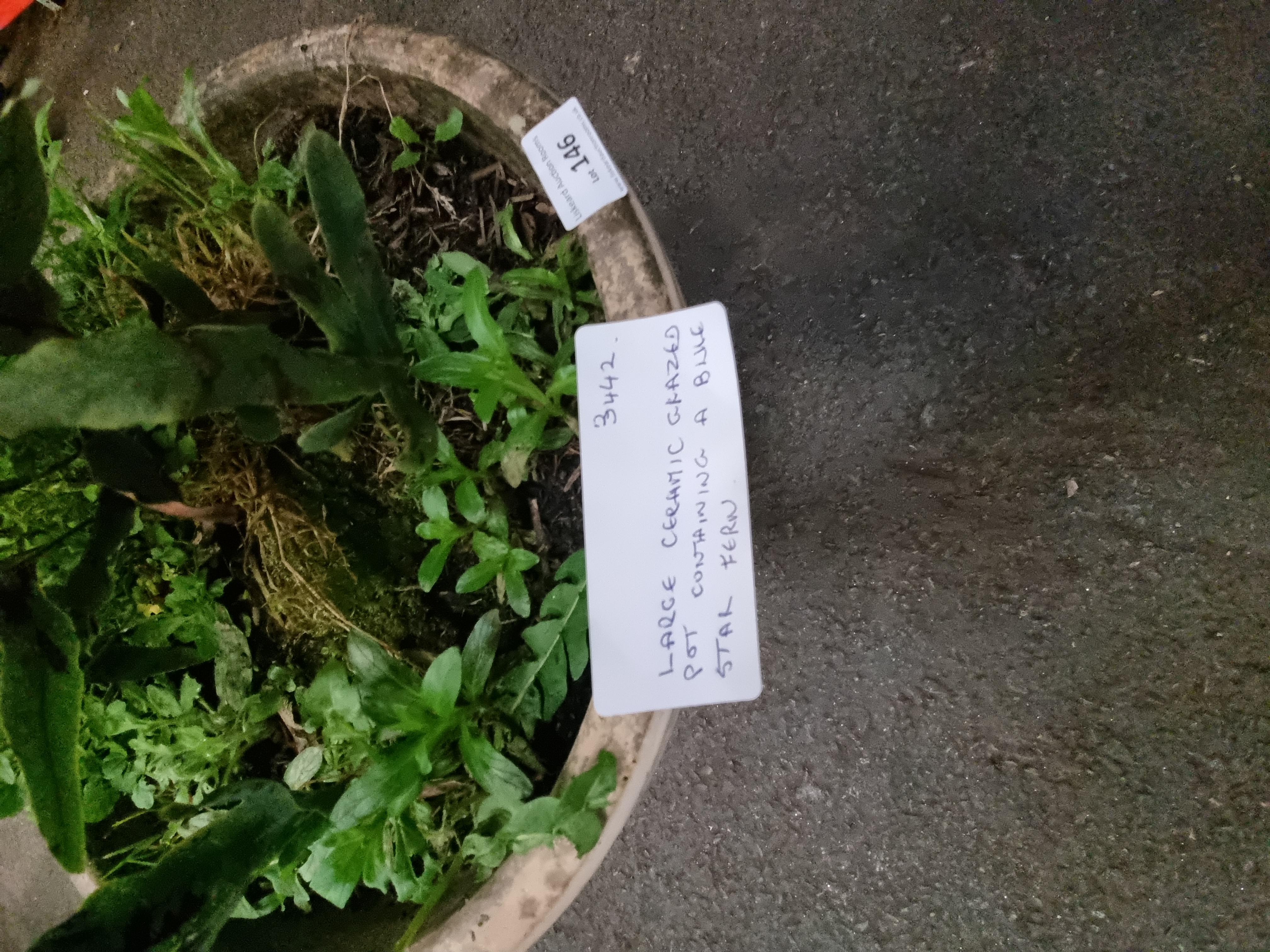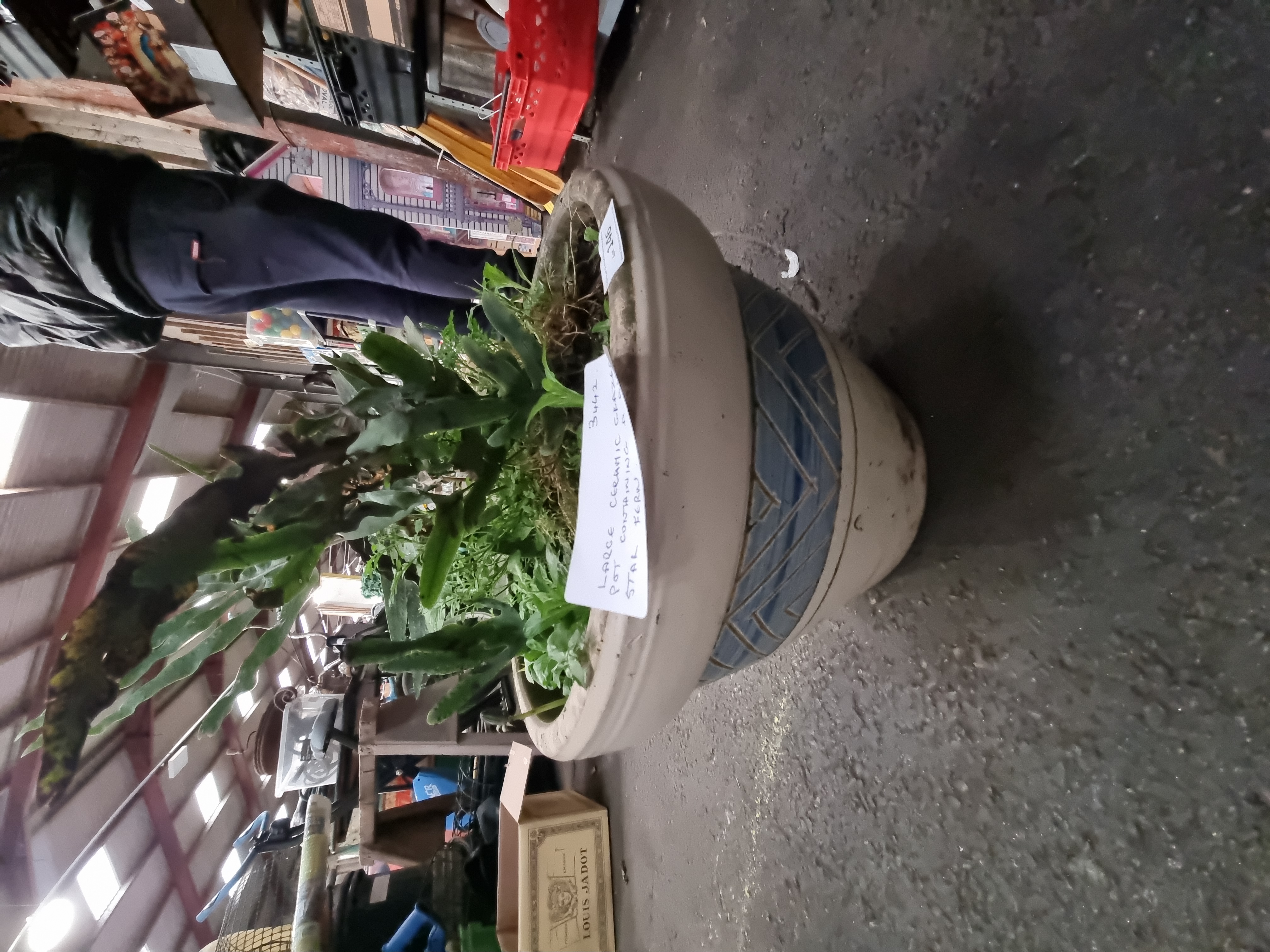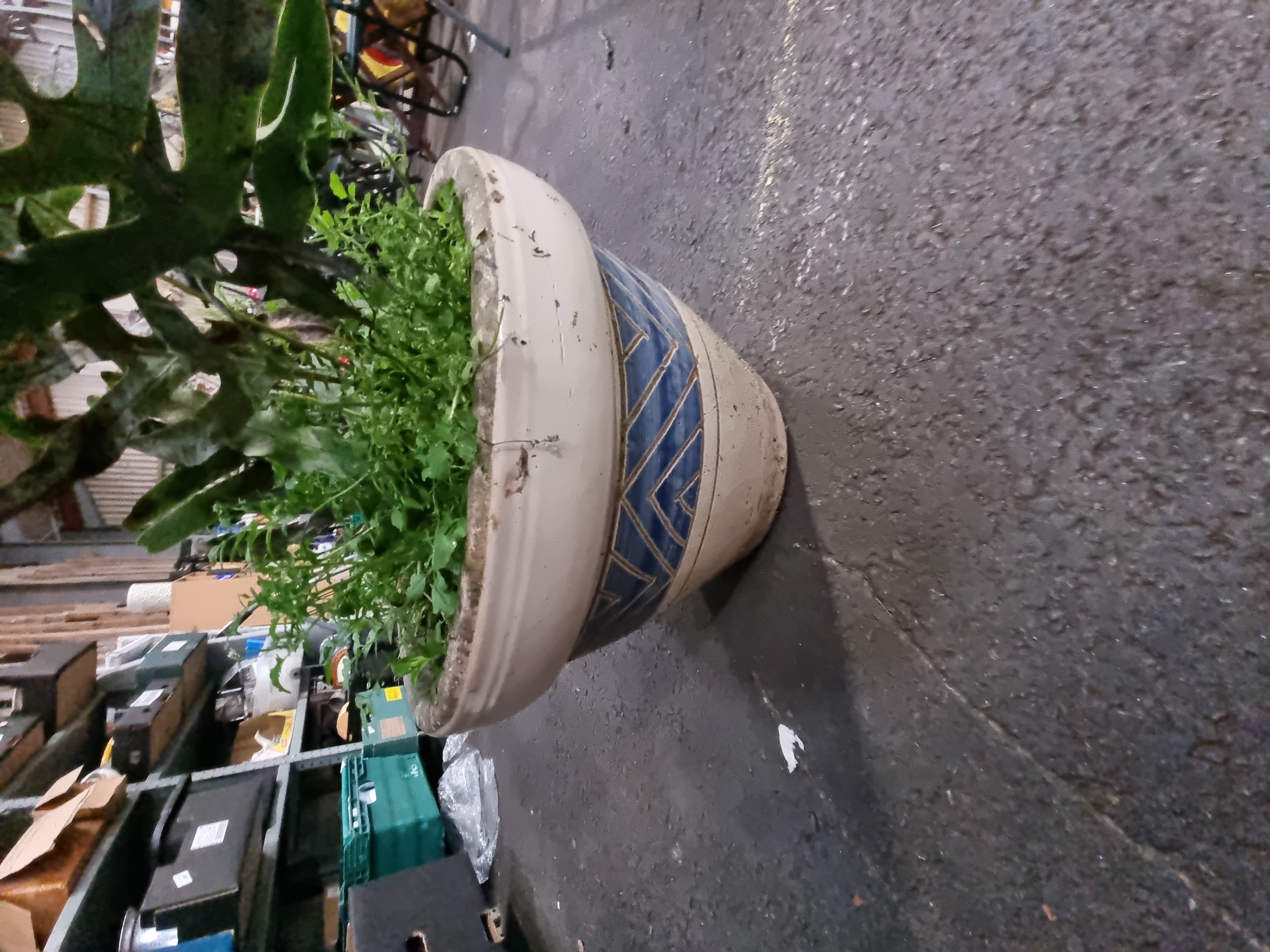 A large glazed earthenware or stoneware garden planter of tapered circular form. The vessel features a broad, flat rim and a buff-coloured body. It is decorated with a wide median band of hand-painted blue geometric chevron and trellis-style patterning. The planter contains a live Blue Star Fern (Phlebodium aureum) and other incidental greenery within the soil. No maker’s marks or factory stamps are visible on the exterior or interior of the pot; the base has not been inspected.