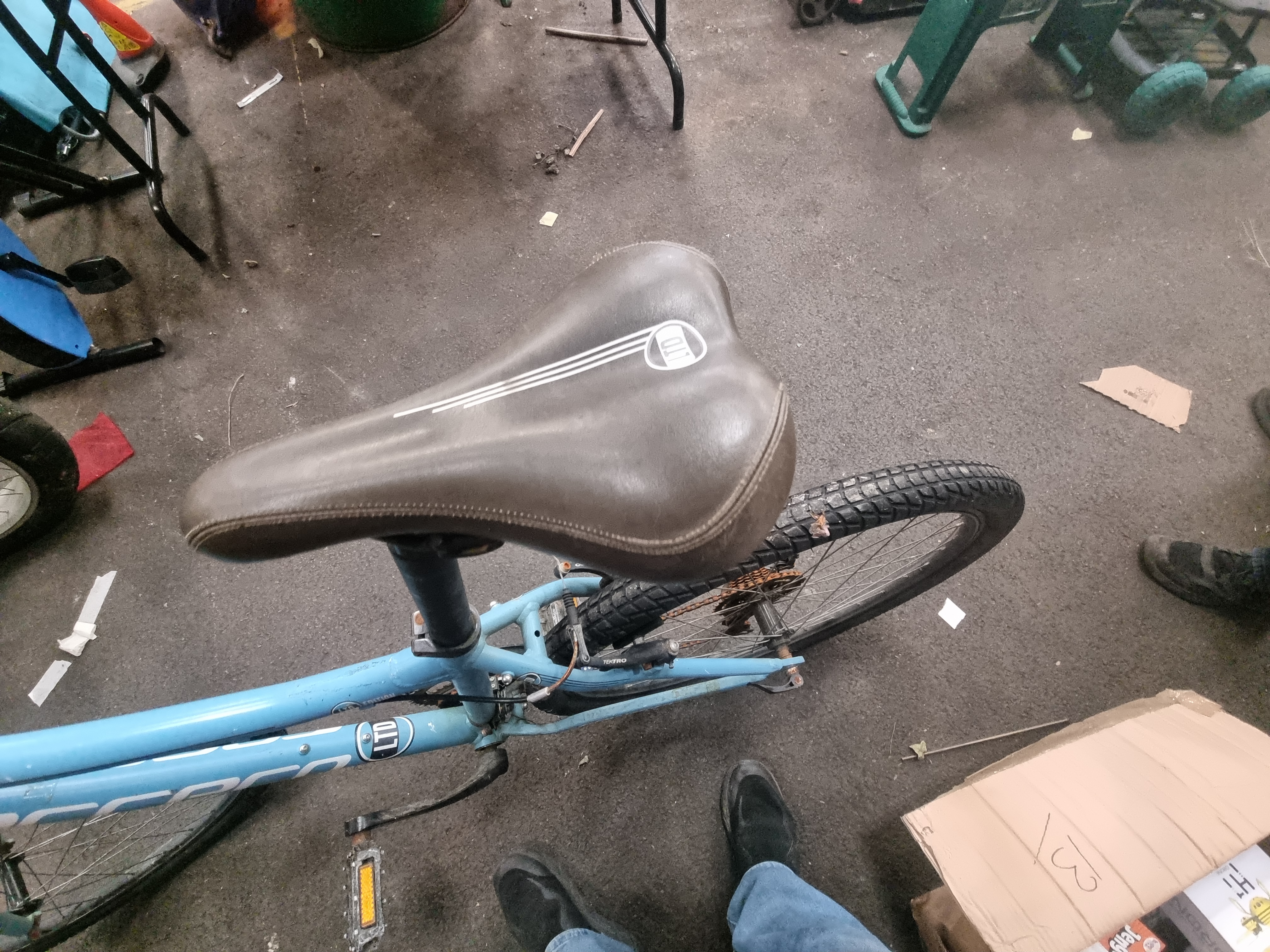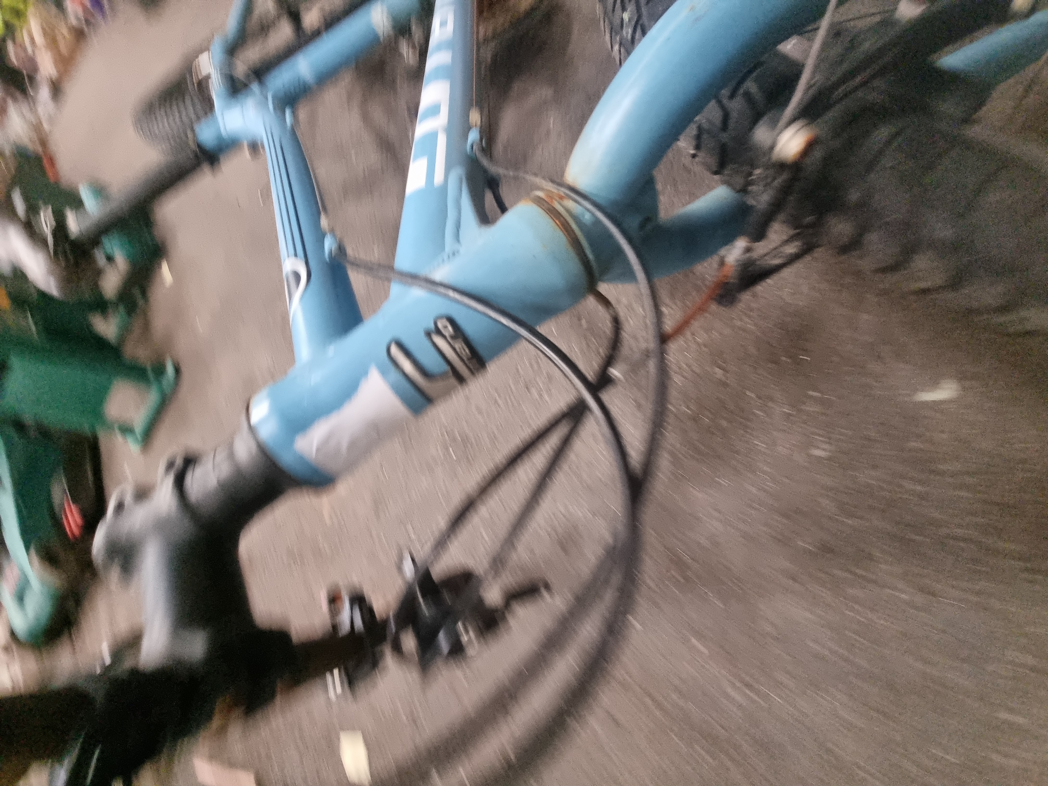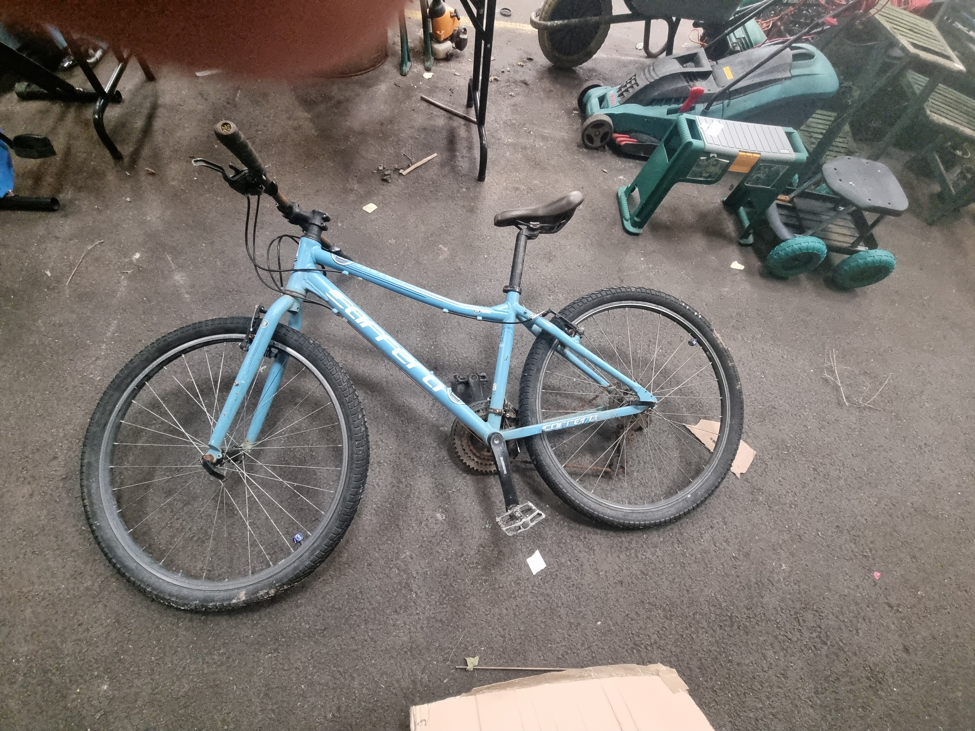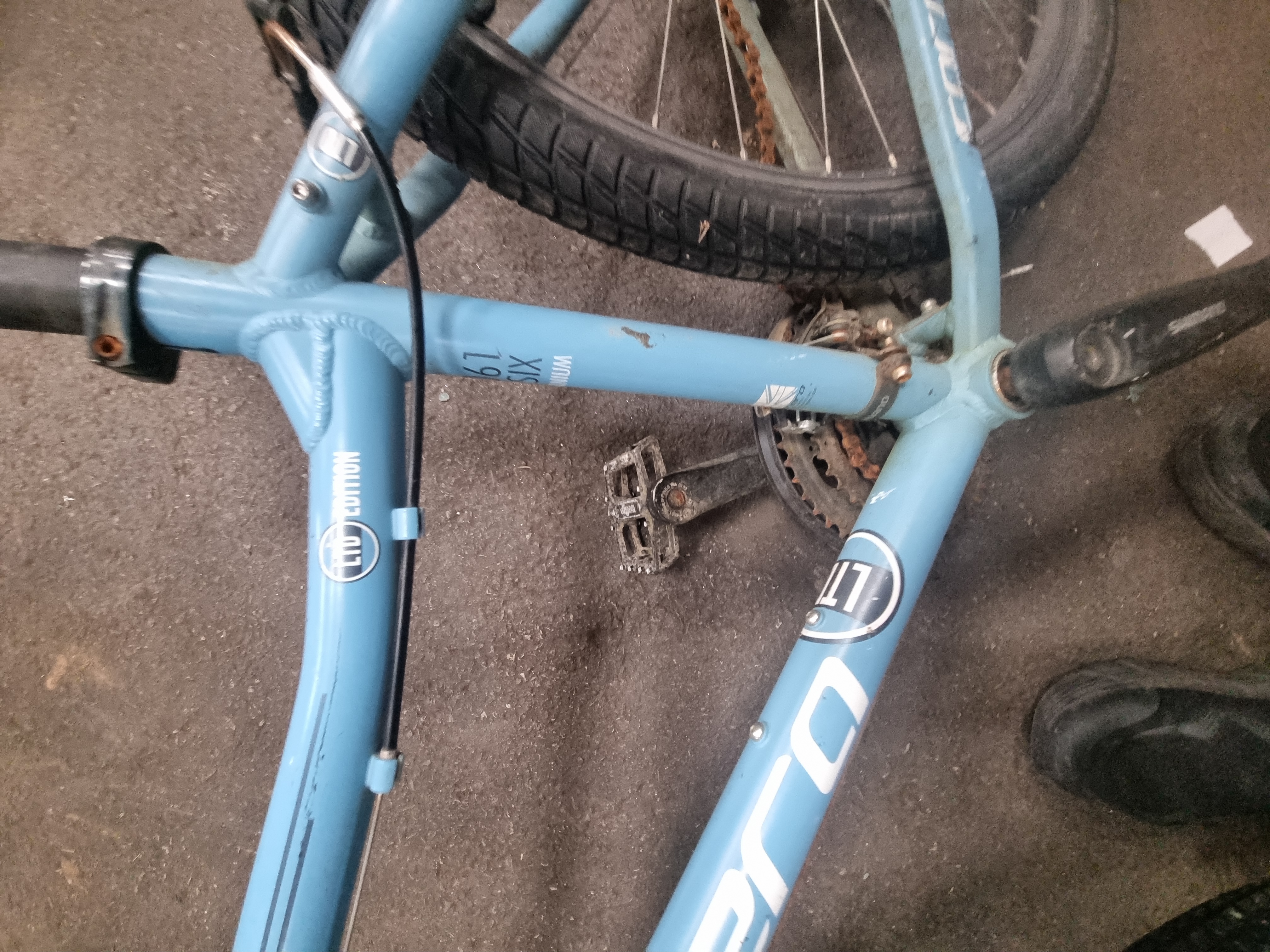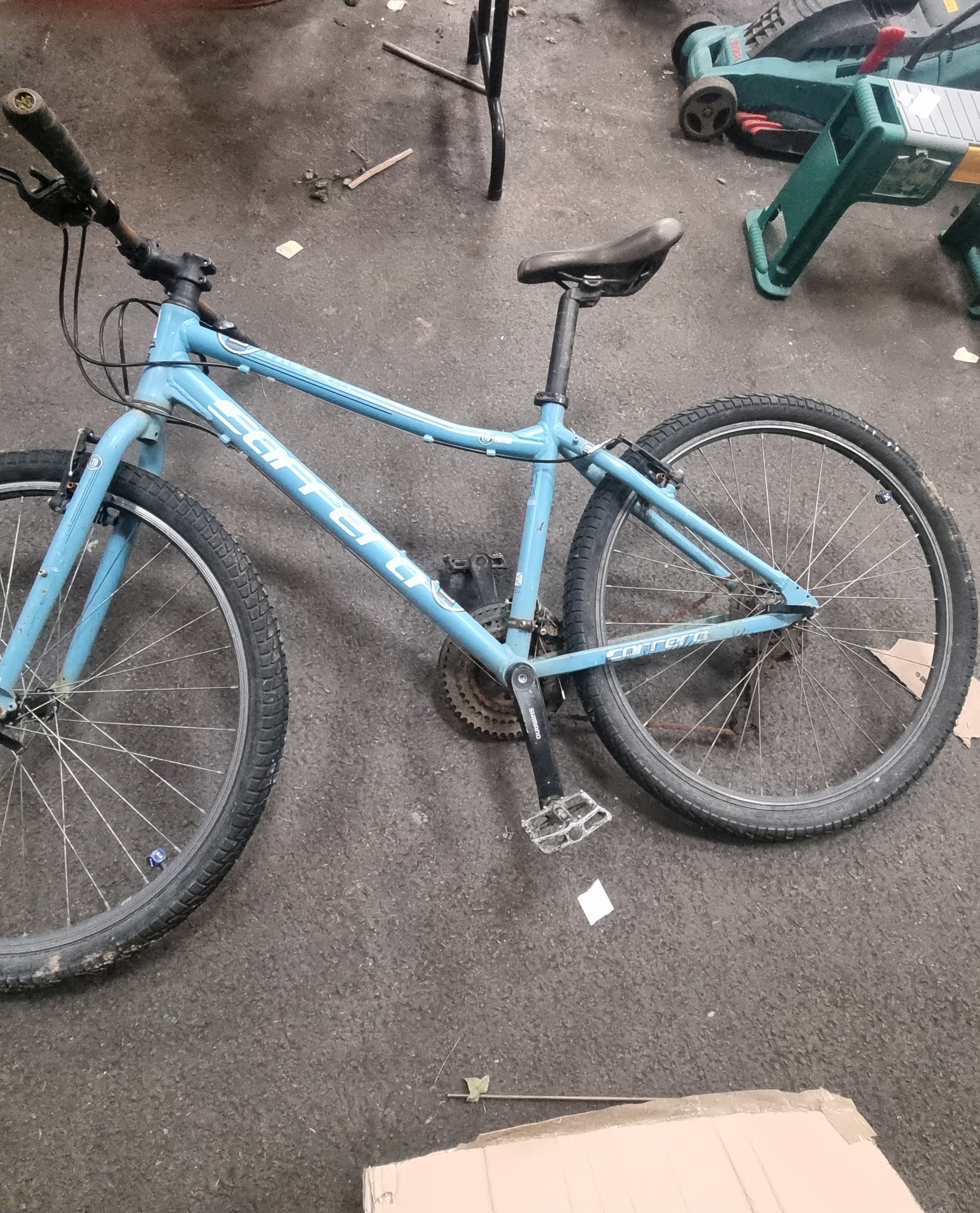 Showing significant signs of age and use throughout. There are scuffs and scratches to the paintwork. Prominent surface corrosion is visible on the chain, cassette, and various metal fittings. The item requires a full mechanical service before use.