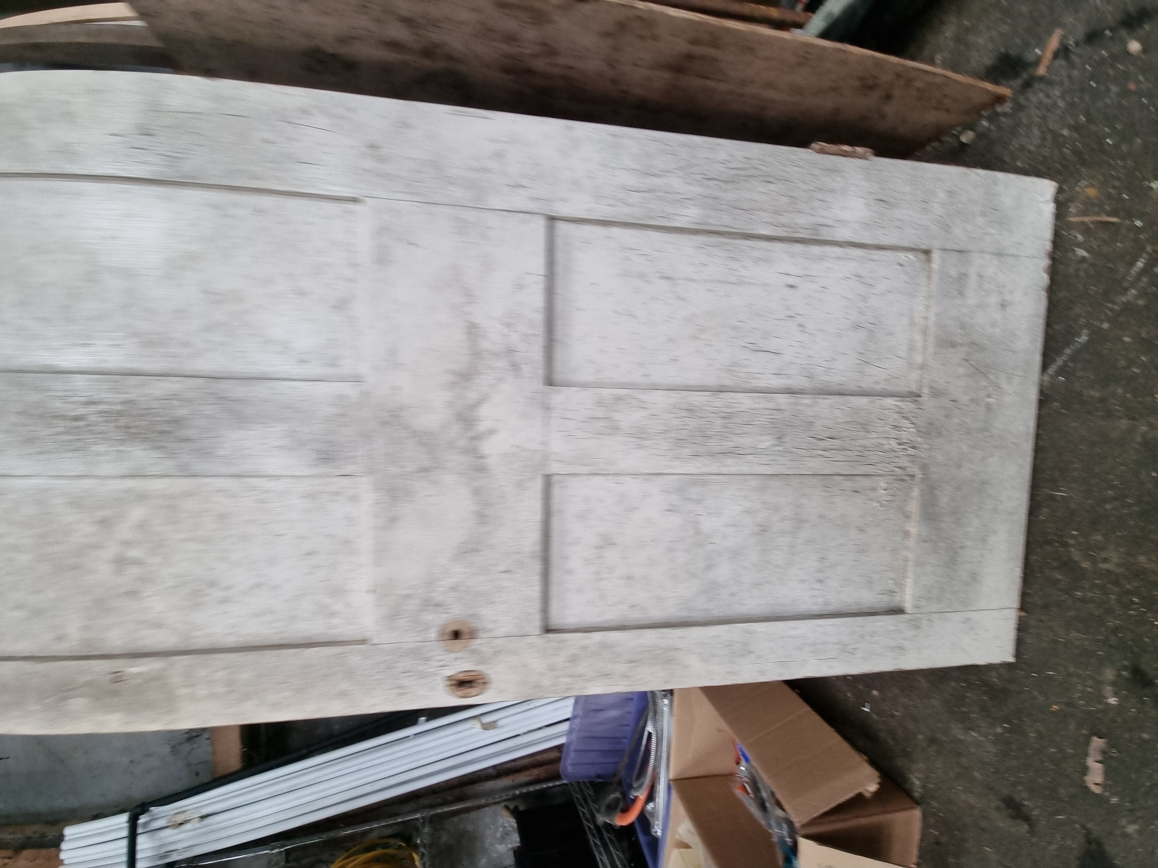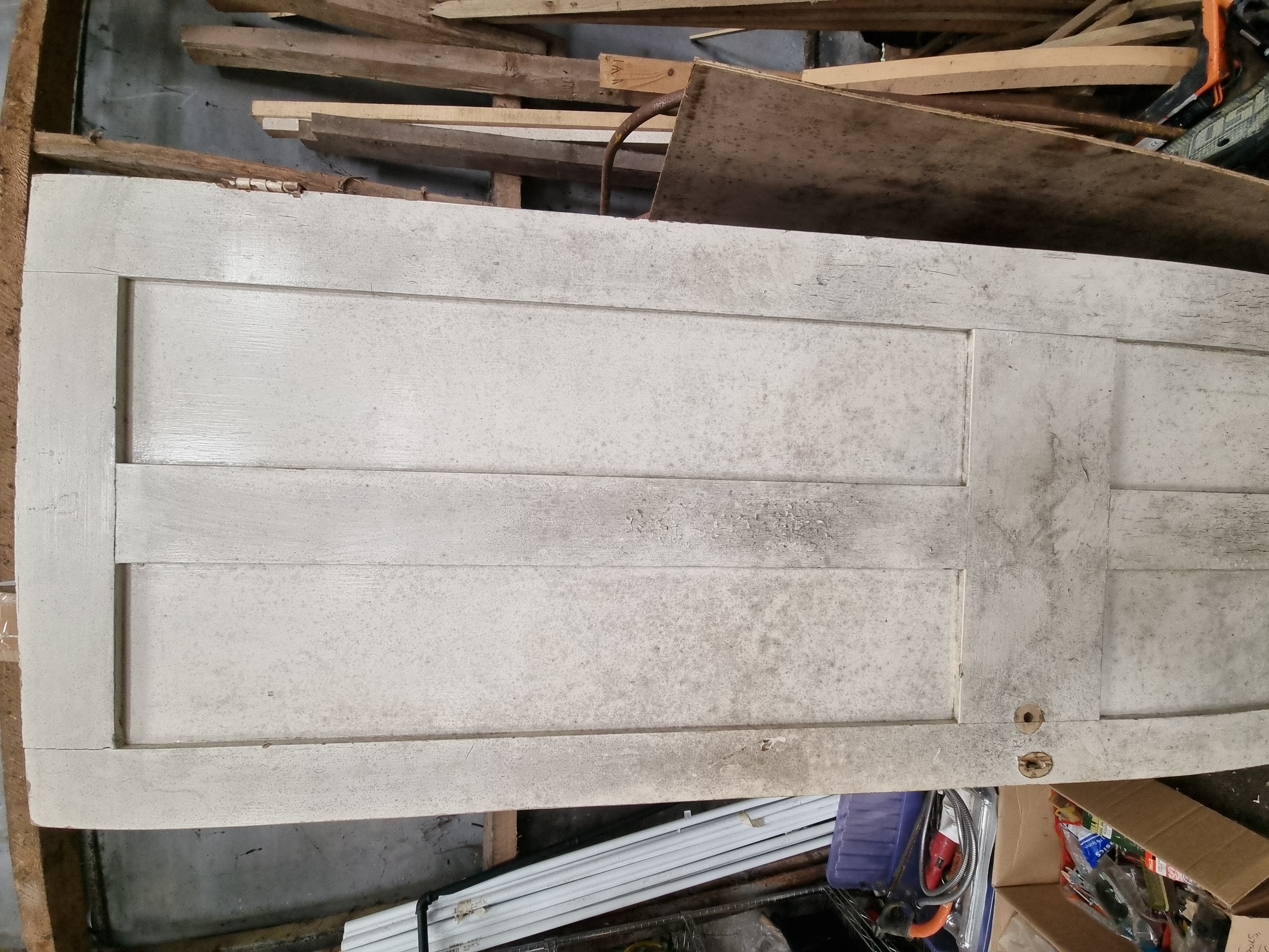 The door is in an unrestored, as found condition. There is extensive surface soiling, spotting, and staining throughout the painted finish. The pine timber shows signs of age-related wear and exposure, including areas of raised grain. The original handles and lock mechanism are missing. This item is suitable for restoration.