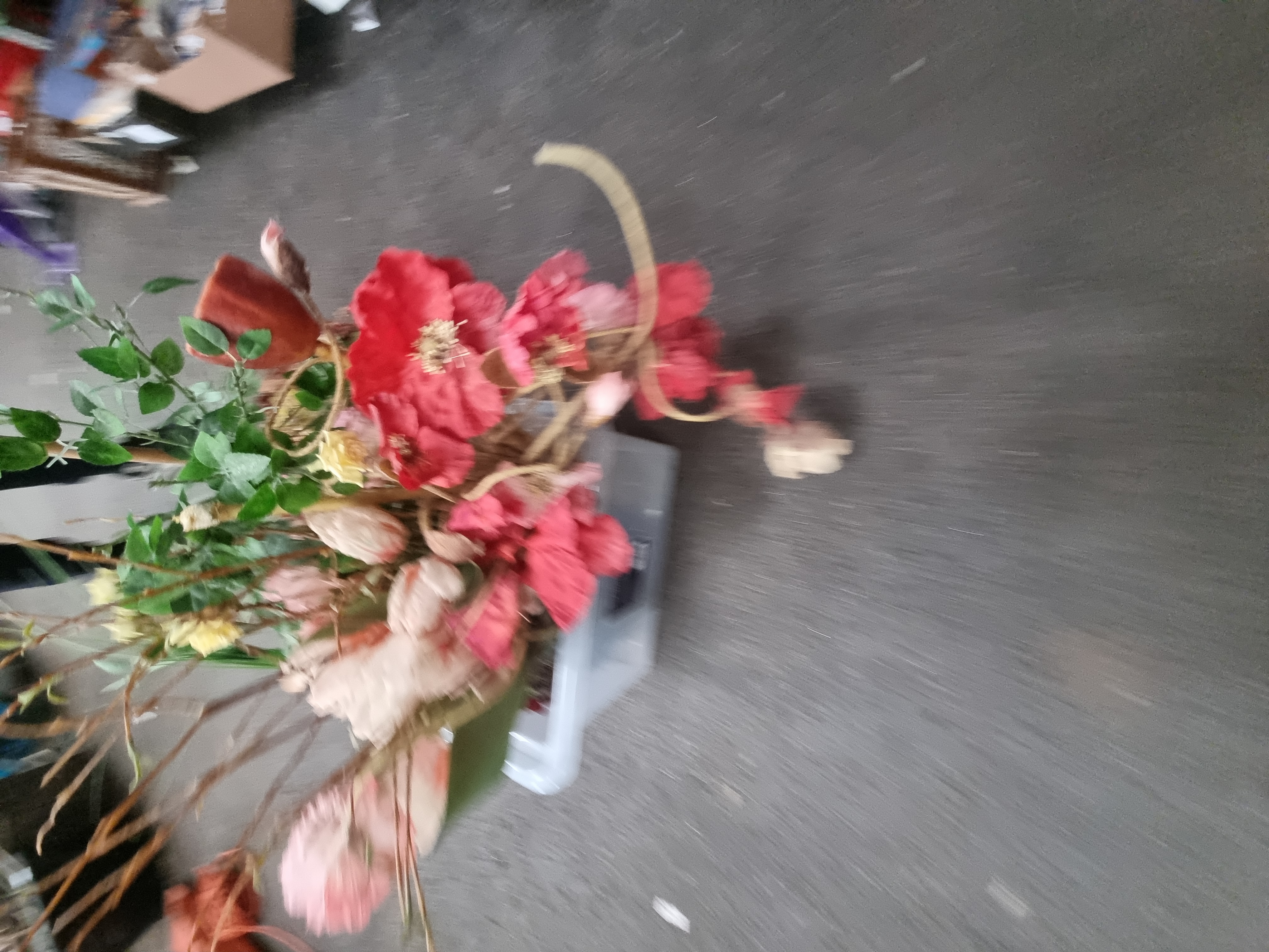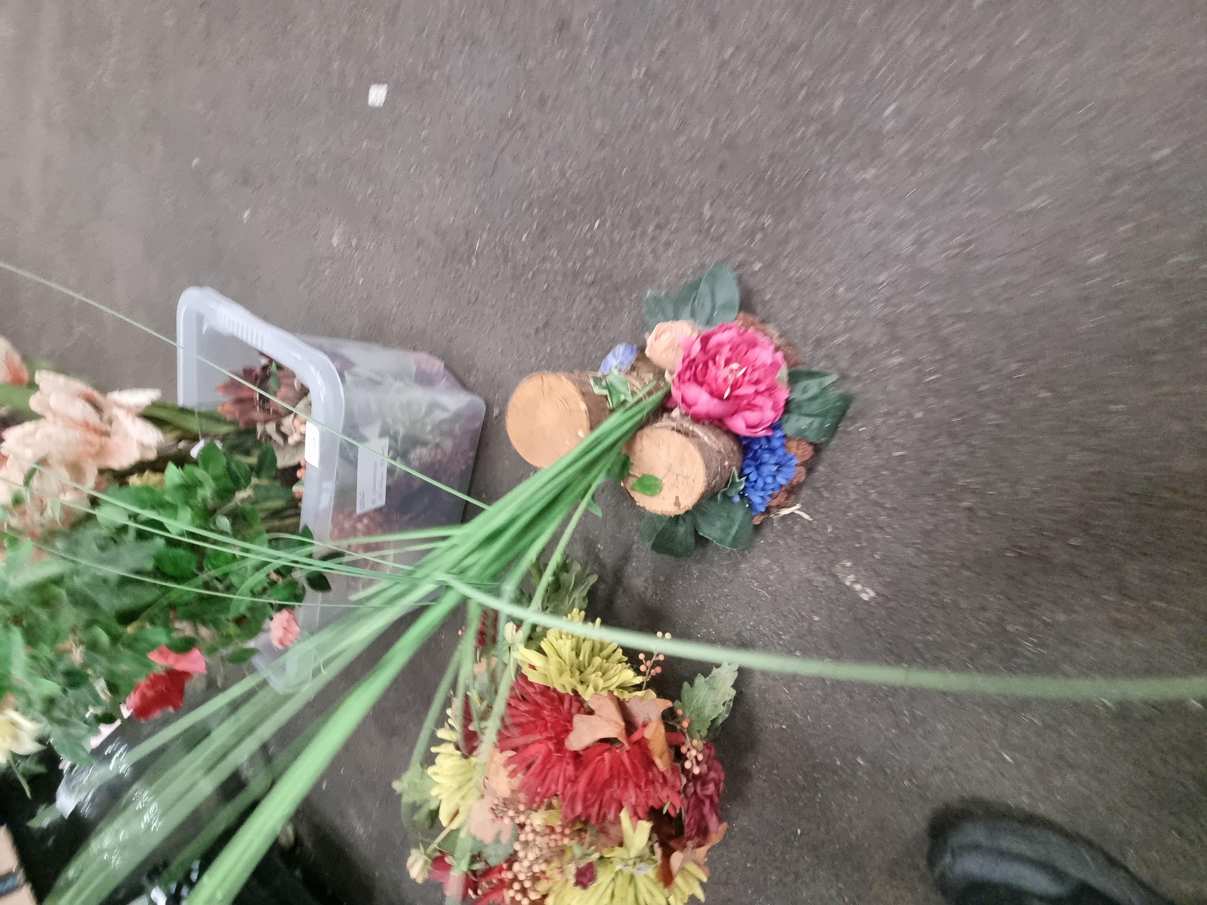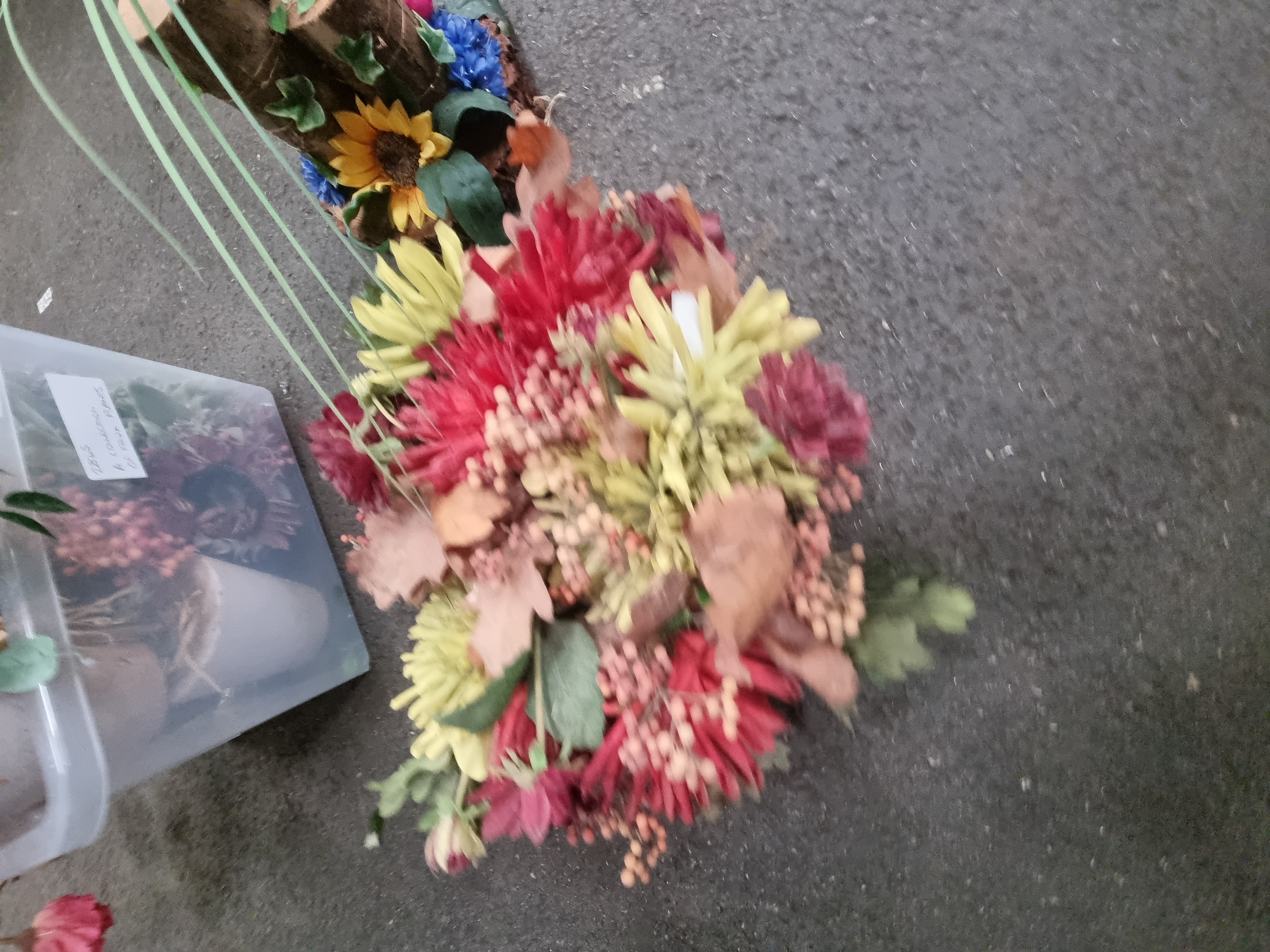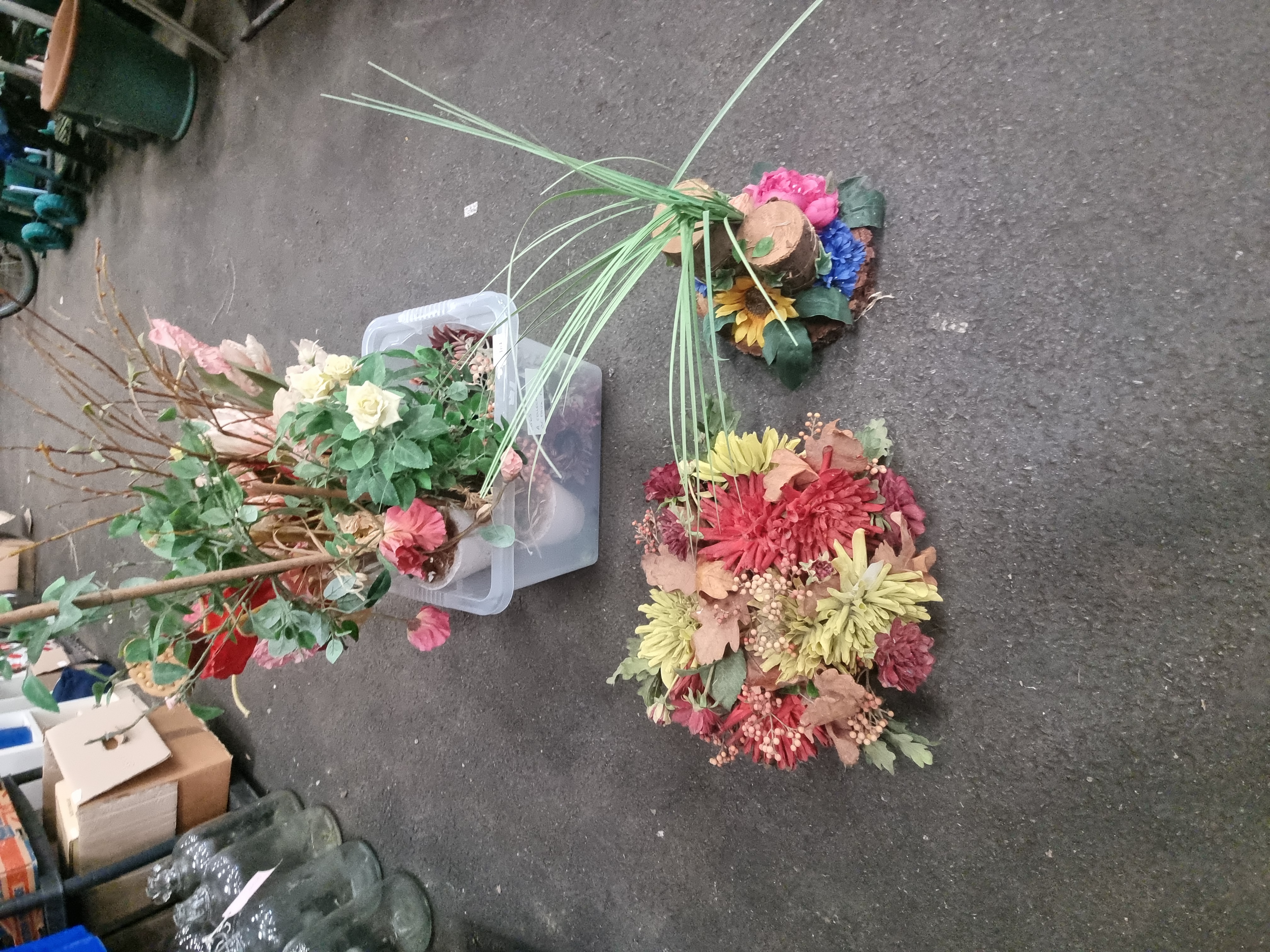 The items are in good overall condition. Due to storage within the crate, some stems and petals may require minor reshaping or fluffing for display. One centrepiece arrangement exhibits visible adhesive residue at the base of the wooden components, consistent with its construction.