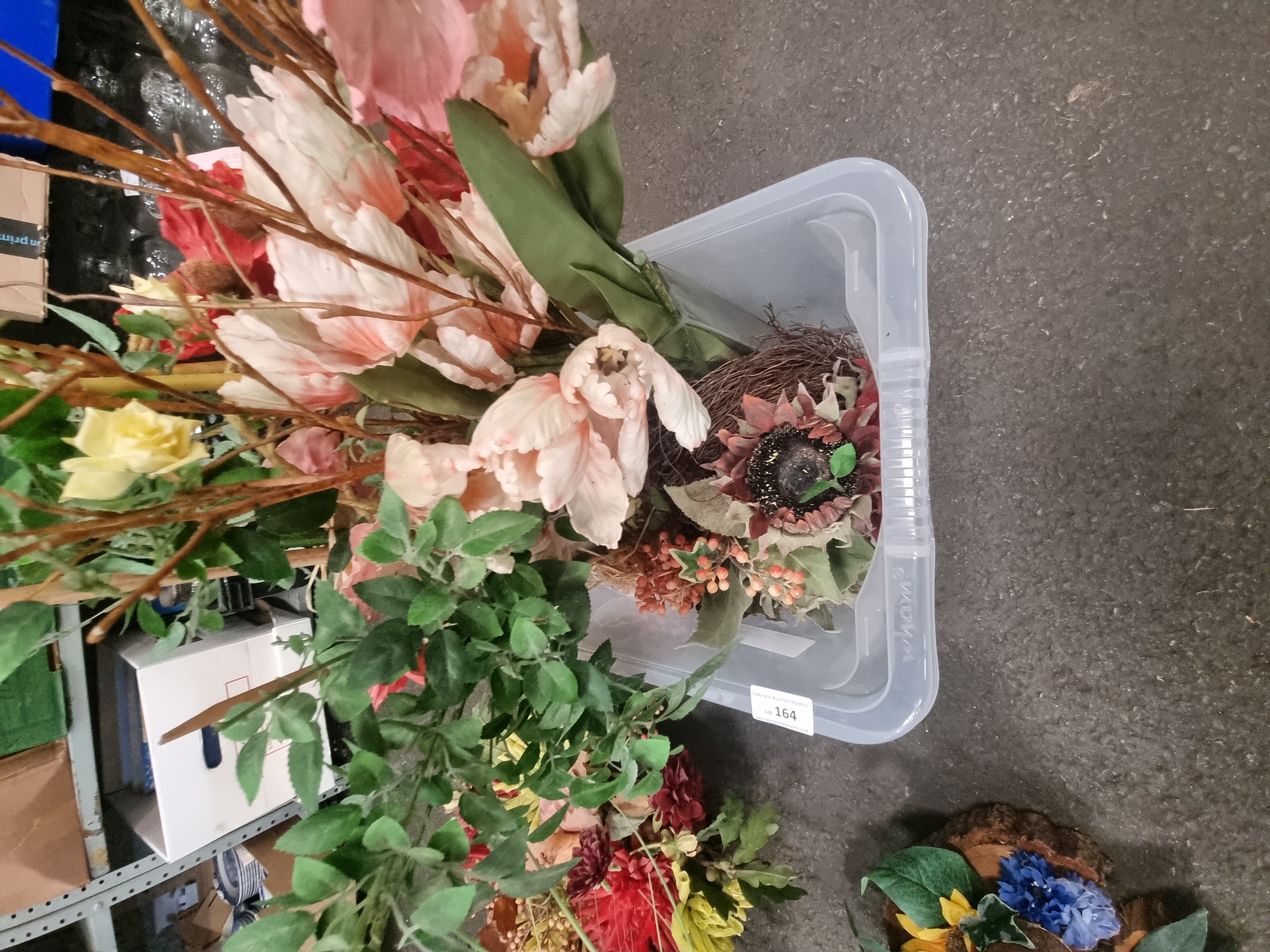 An assortment of contemporary artificial flora comprising pre-made arrangements and various loose stems, presented as a mixed DIY flower bucket lot. The collection includes two primary table centrepieces: one featuring autumnal-toned dahlias and oak leaves, and a second rustic-style arrangement composed of a pink peony and blue blossoms set upon two small natural wood log bases. The loose stems include varieties such as roses, tulips, sunflowers, and tall decorative grasses. The items are housed within a clear plastic storage container embossed with the brand name Wham. A hand-written label on the container reads A COLLECTION OF FAUX FLOWERS and the lot is marked with a white auction tag for Lot 164. Materials include synthetic fabric, plastic, wire, and natural wood.