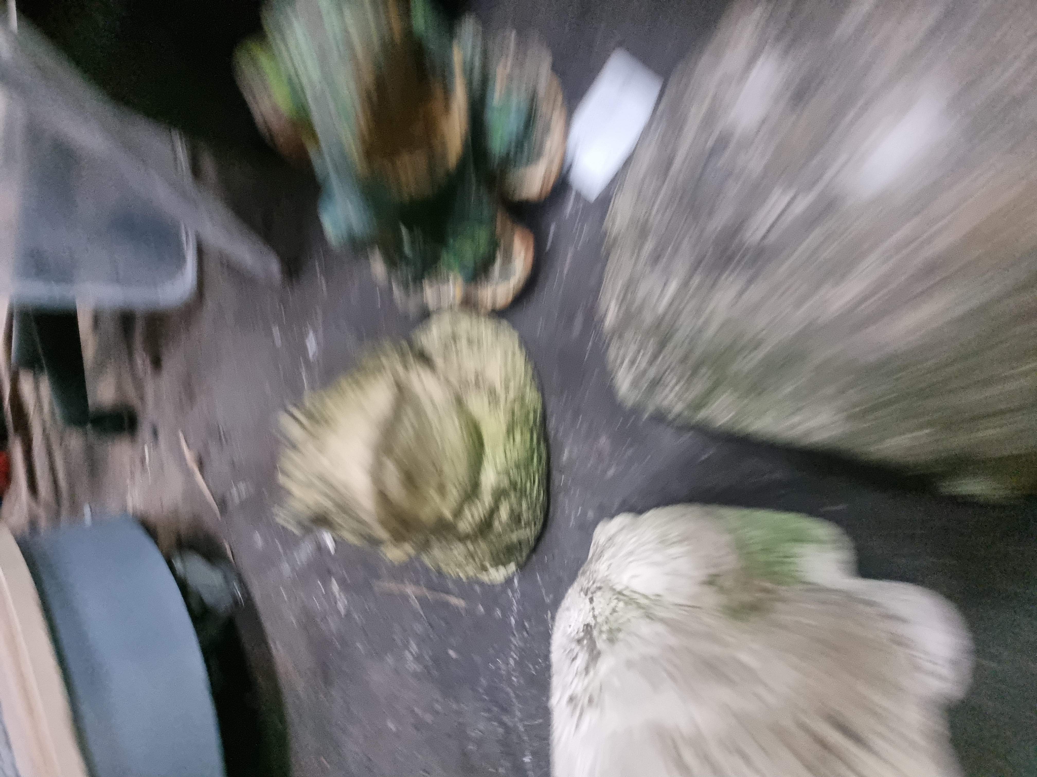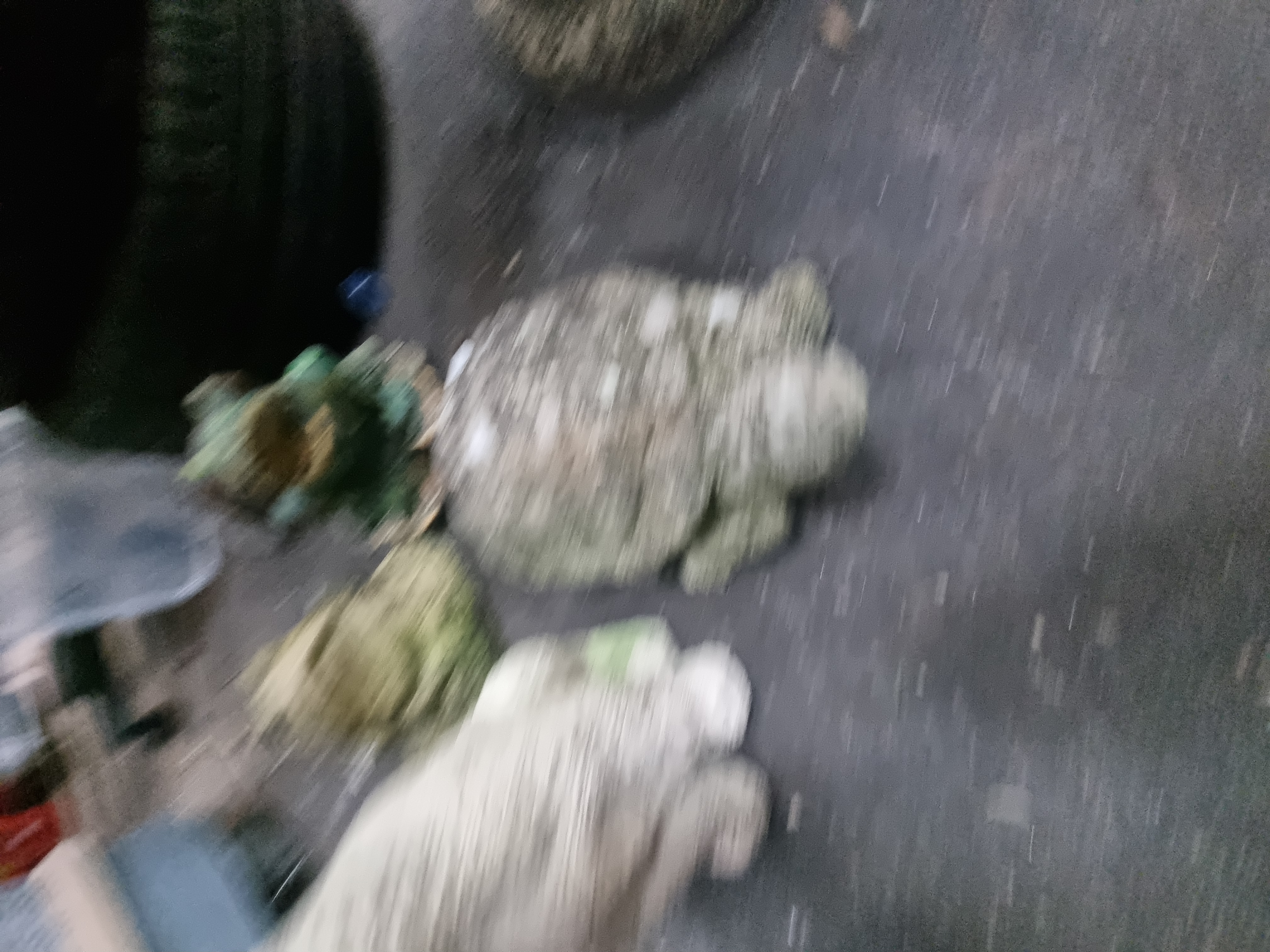 All items exhibit significant weathering commensurate with outdoor use, including a natural patina of moss, lichen, and algae. The painted figures show heavy flaking and loss to the original finishes. Minor chips to the edges of the cast stone are present, but no major structural cracks or repairs are visible.