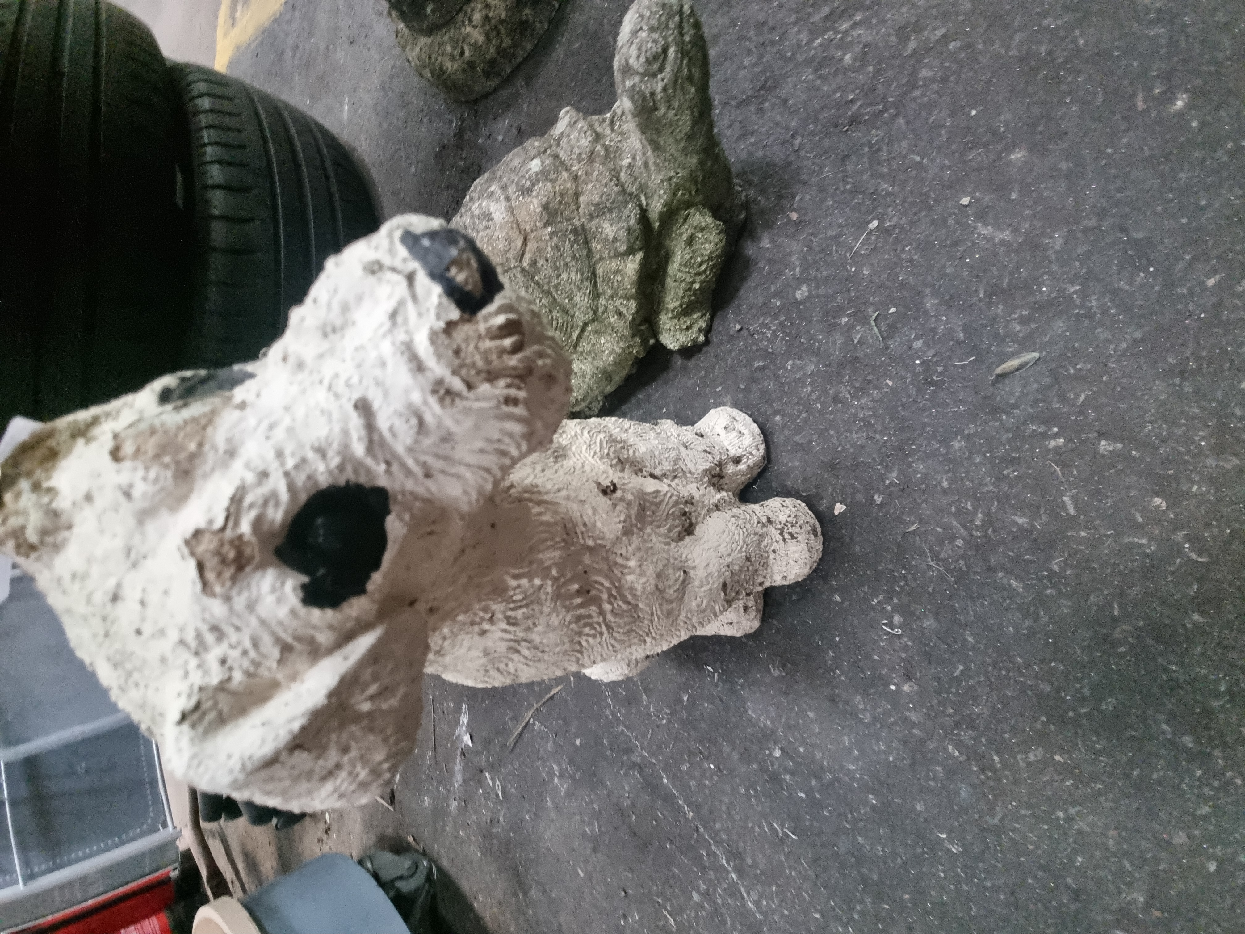 An assortment of garden ornaments cast from reconstituted stone, including figures of a tortoise, a seated terrier, and frogs. The tortoise is modelled with a textured carapace. The terrier, resembling a West Highland White Terrier, is depicted in a seated pose with remnants of white and black decorative finish. The frogs include a larger figure with traces of green and yellow paint and a smaller unpainted figure in a seated position. These items are characteristic of mid to late 20th-century outdoor statuary. No maker’s marks or factory stamps are present.
