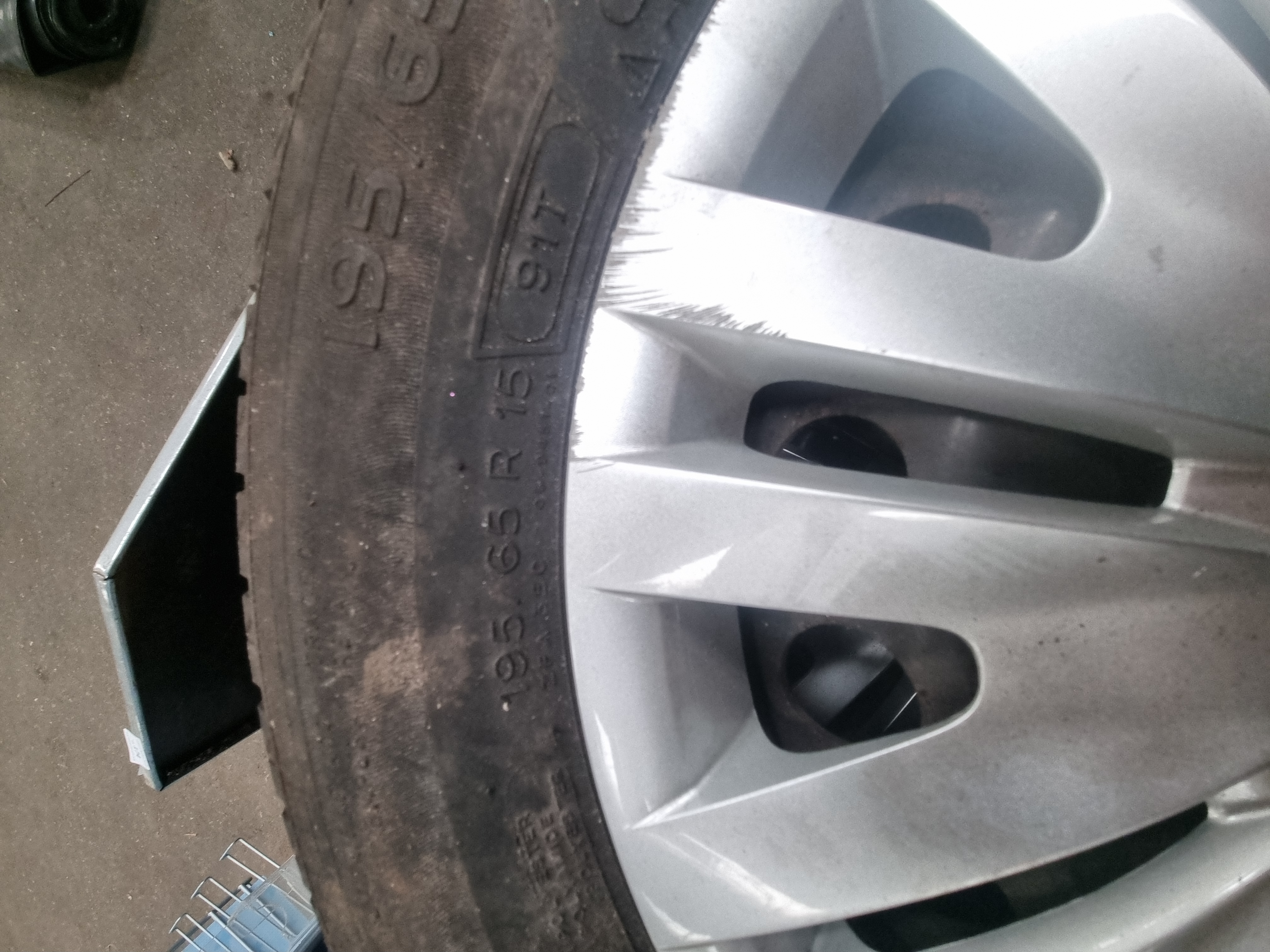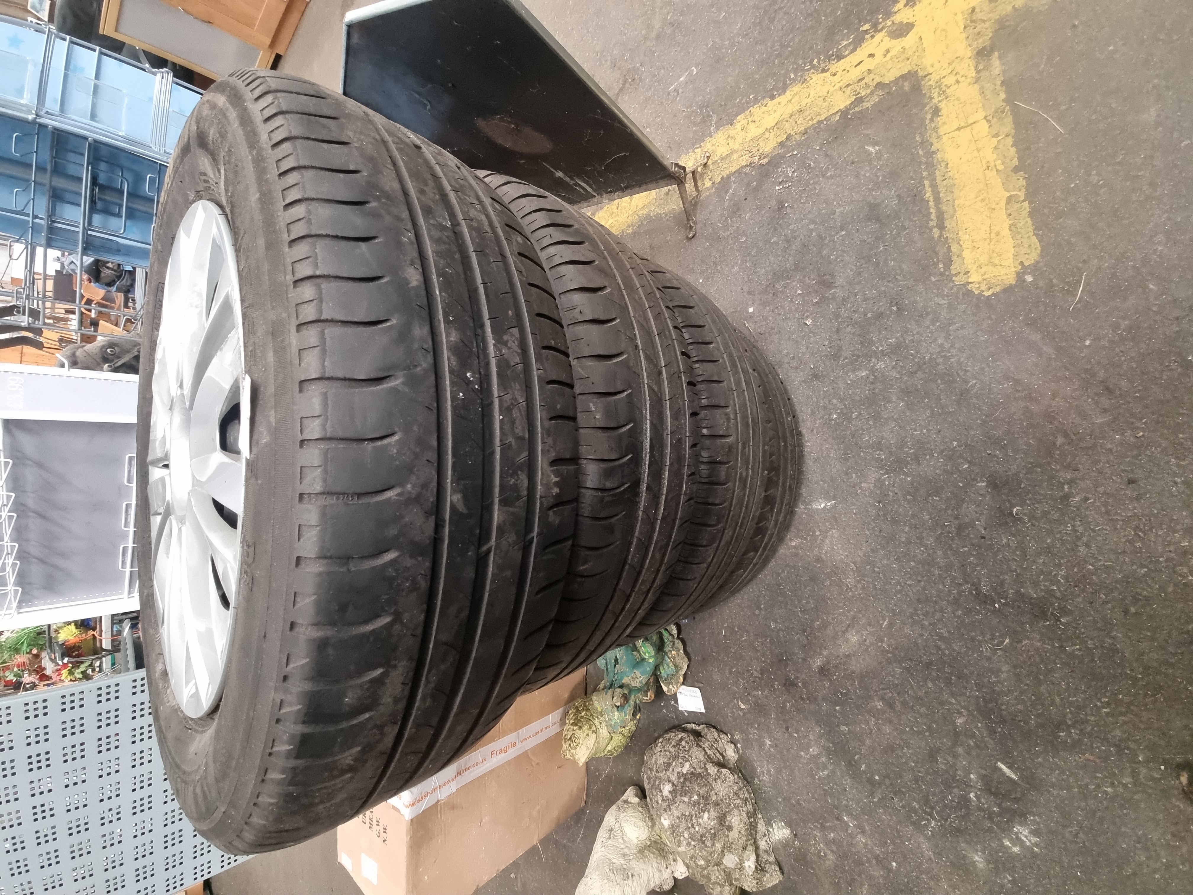Used. The plastic wheel trims show visible signs of use, including surface scratching and kerb rash scuffing to the outer edges. The tyres are used with varying tread depths; a full inspection of the manufacture date codes and tread wear is recommended.