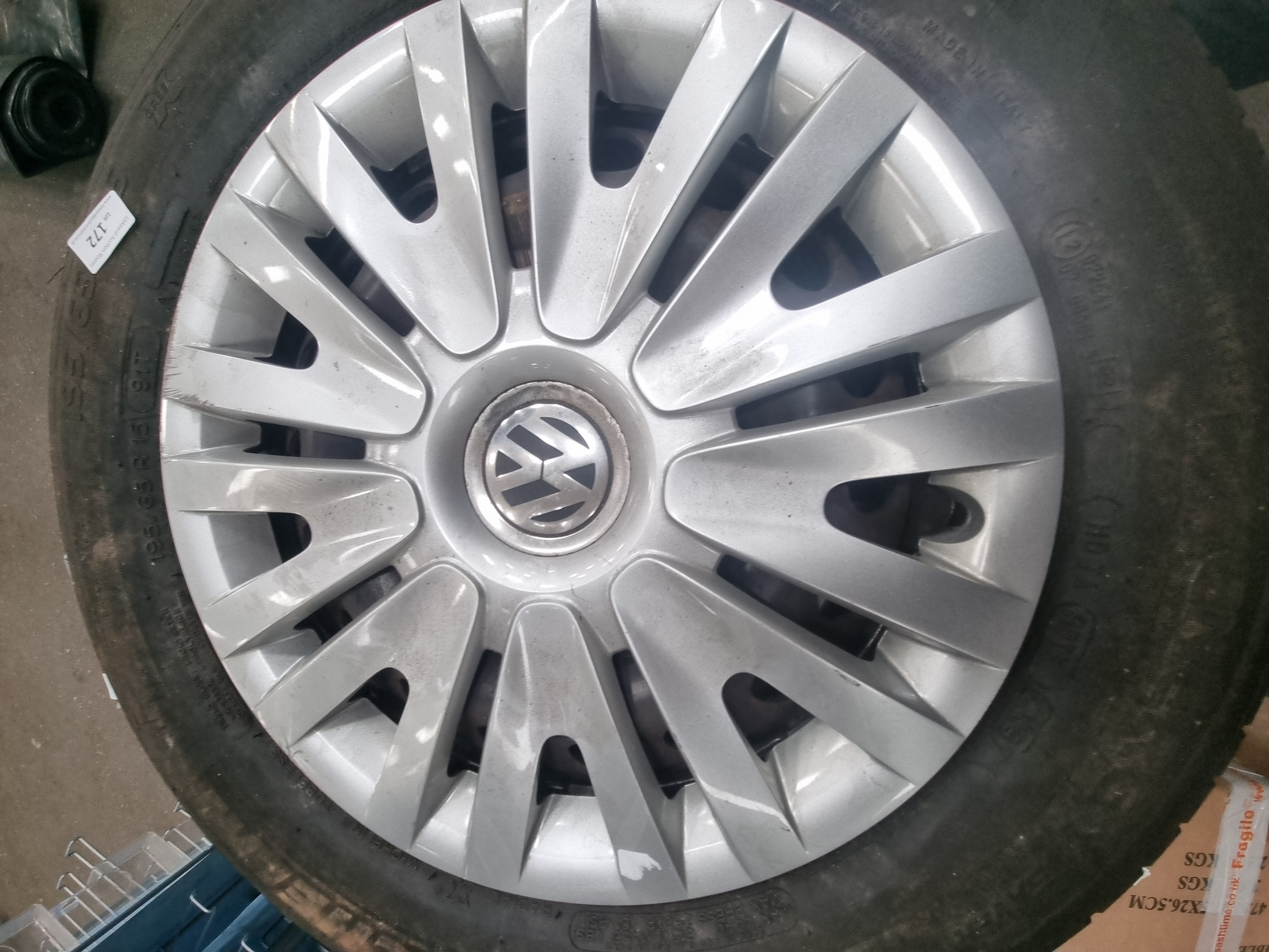 A set of 4 vehicle wheels comprising five-lug steel rims fitted with pneumatic tyres and plastic multi-spoke wheel trims. Each wheel trim features the central embossed logo for Volkswagen. The tyres are marked with the size 195/65 R 15 and a load/speed rating of 91T. One tyre sidewall is embossed with the text Made in Italy. This wheel and tyre configuration is standard for various Volkswagen Group vehicles, including the Golf, Jetta, and Caddy models. Prospective bidders should verify the bolt pattern (PCD) and offset for their specific vehicle requirements. The lot is accompanied by a temporary auction tag marked Lot 172.