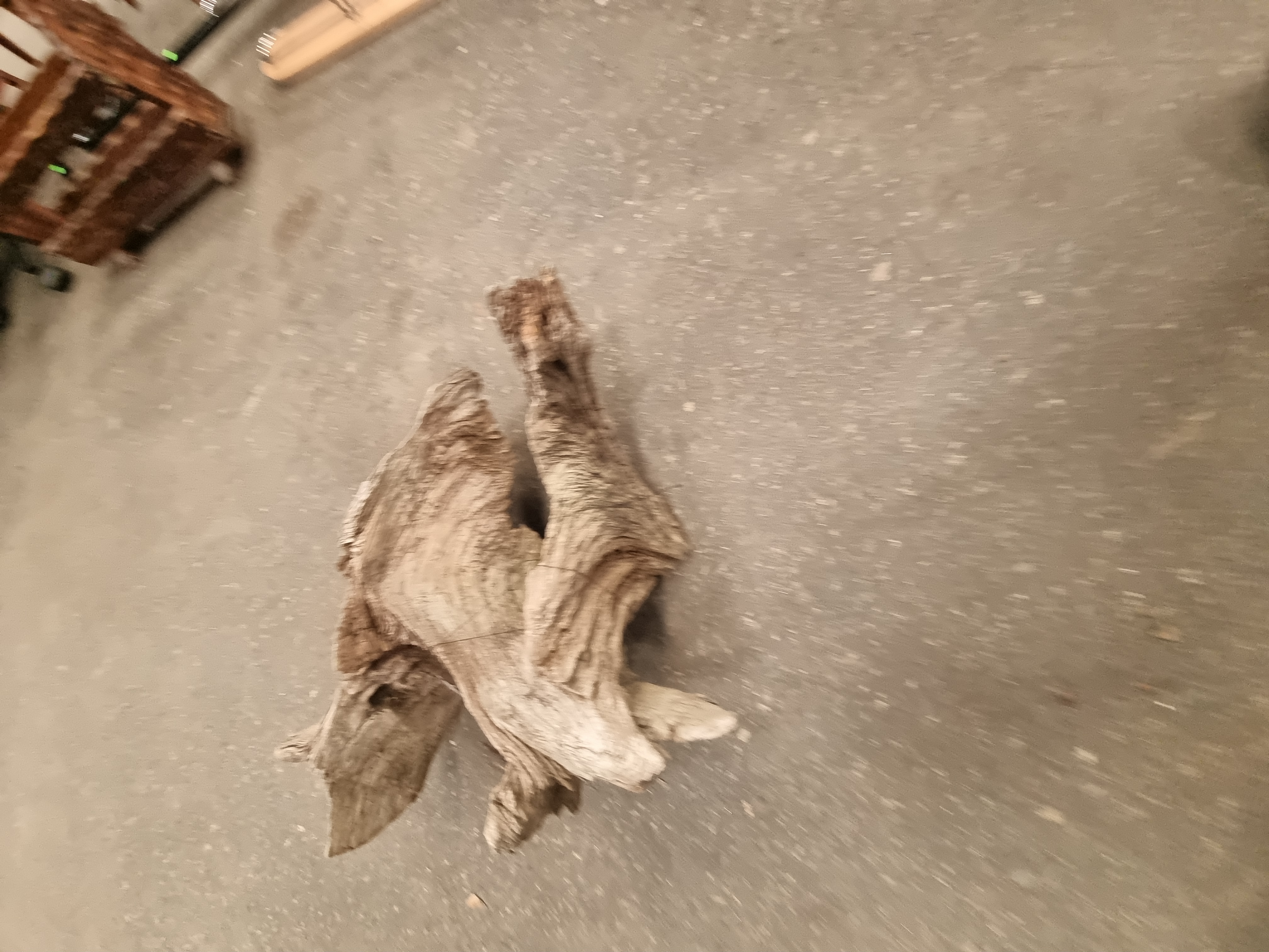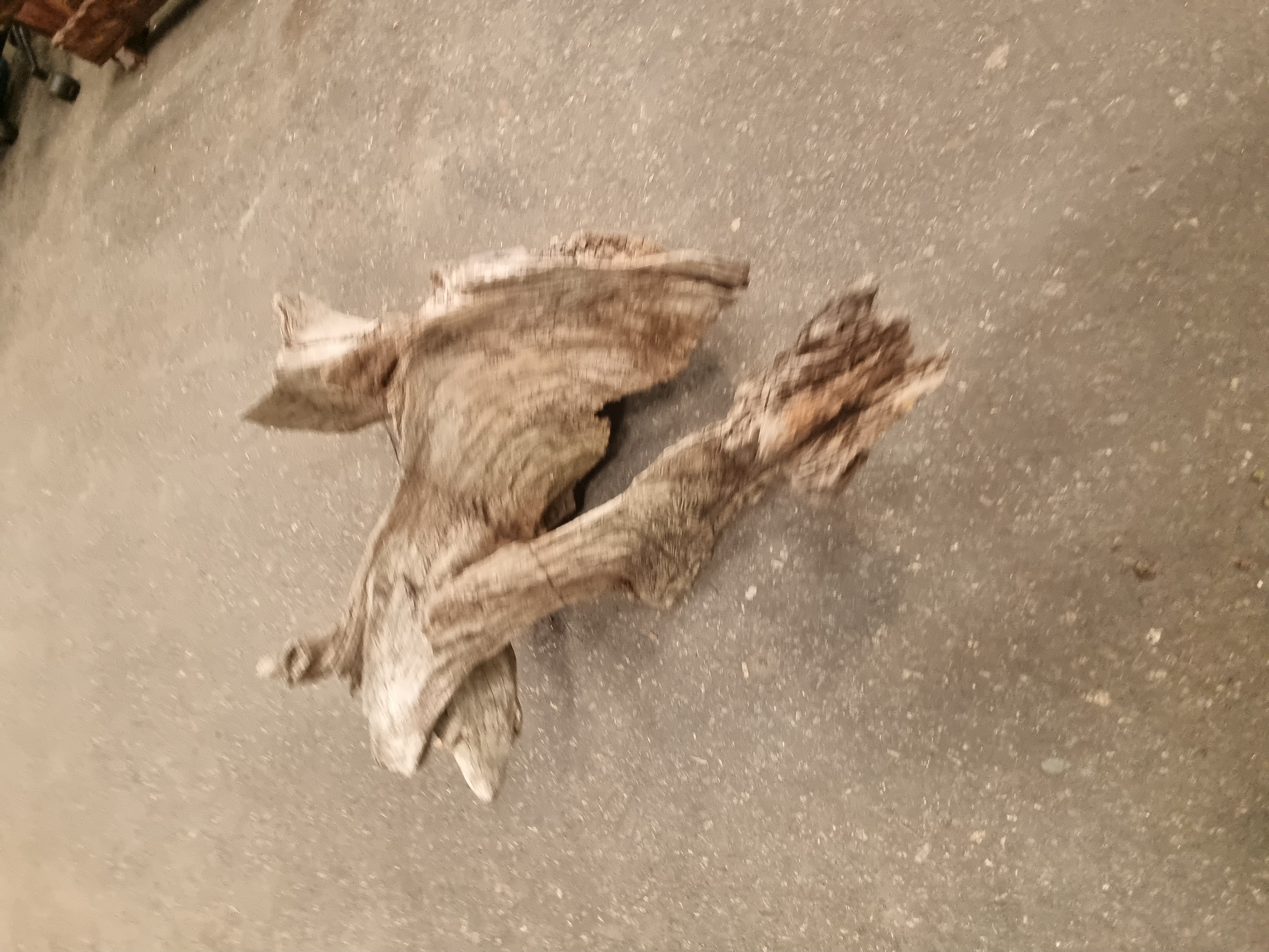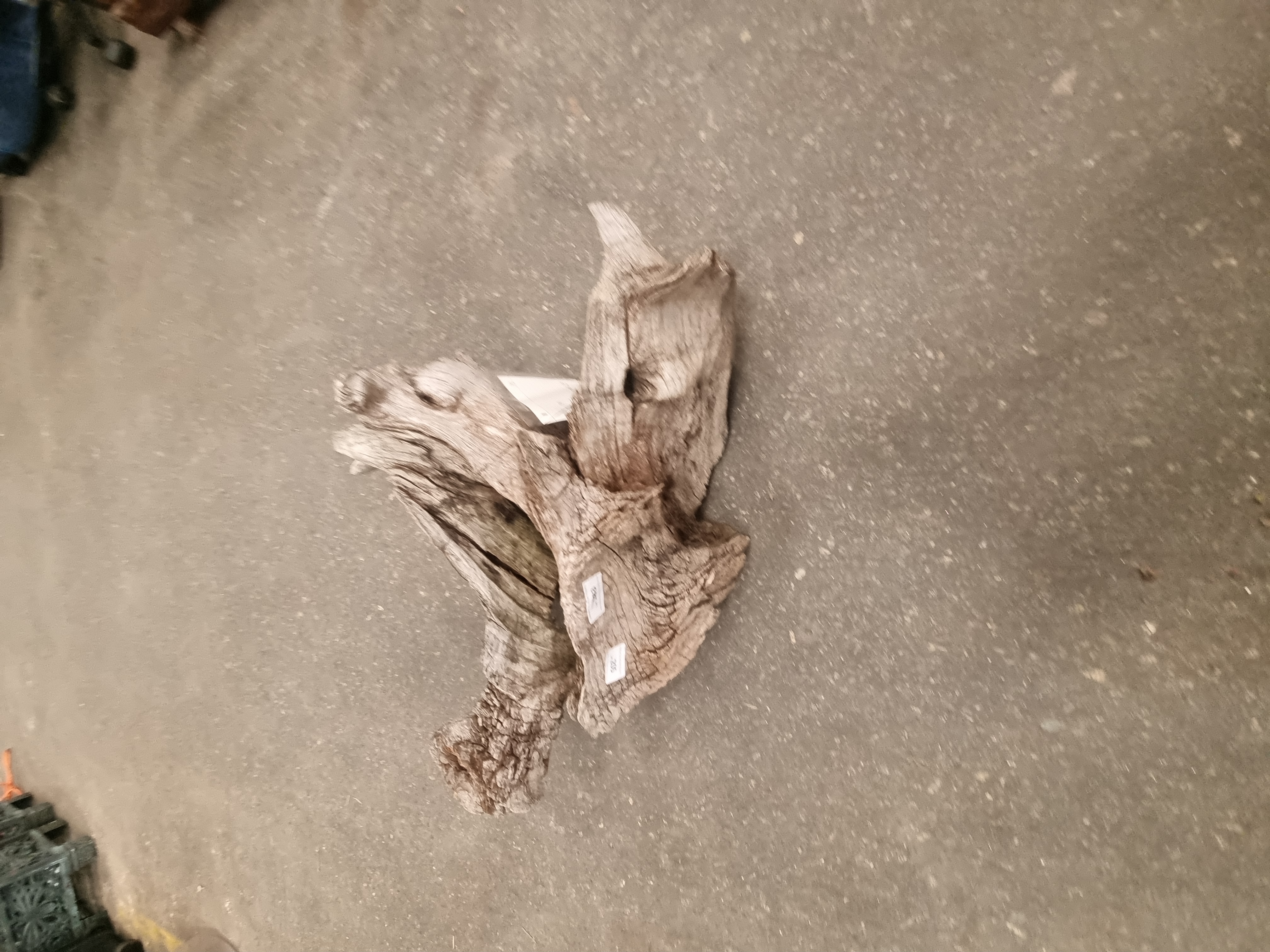 A large piece of naturally formed bog oak pieces featuring gnarled and organic shapes. The timber displays characteristic weathering and erosion with textured surfaces in varying shades of grey and brown. The pieces remain in an unworked state, showing the natural grain and structural complexity of the wood. One element bears two small adhesive labels, one of which is printed with the number 205, while the second remains illegible.