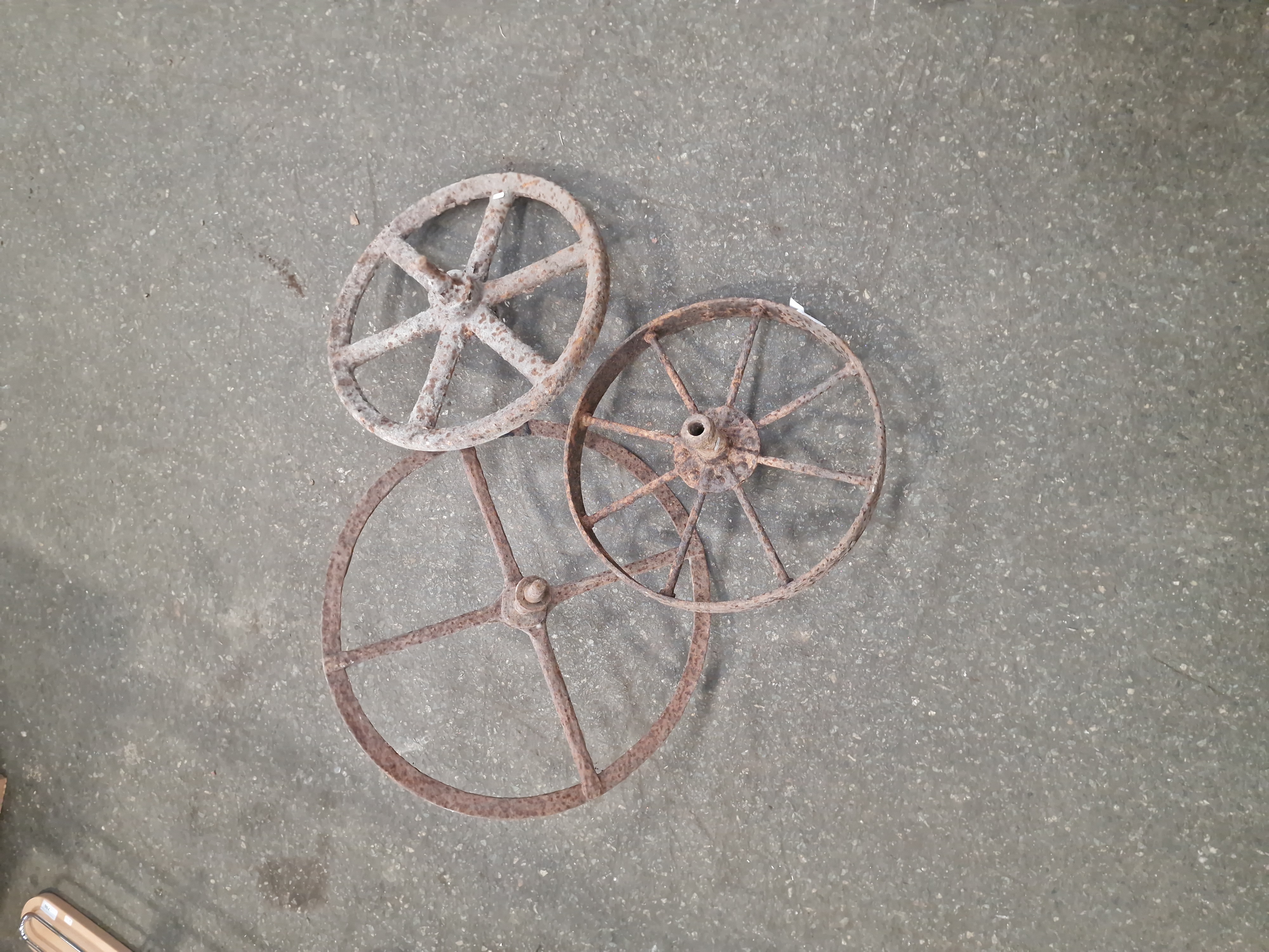A collection of three vintage metal wheels of varying designs, likely intended for use on agricultural machinery or industrial carts. The assortment includes one wheel featuring a wide, flat rim with ten thin spokes radiating from a central hub. A second wheel is of heavier cast construction with a thick rim and six wide spokes. The third wheel features a narrow rim with a four-spoke design and a protruding central hub. All pieces are manufactured from iron. No manufacturer marks, brand names, or model numbers are visible on any of the items.
