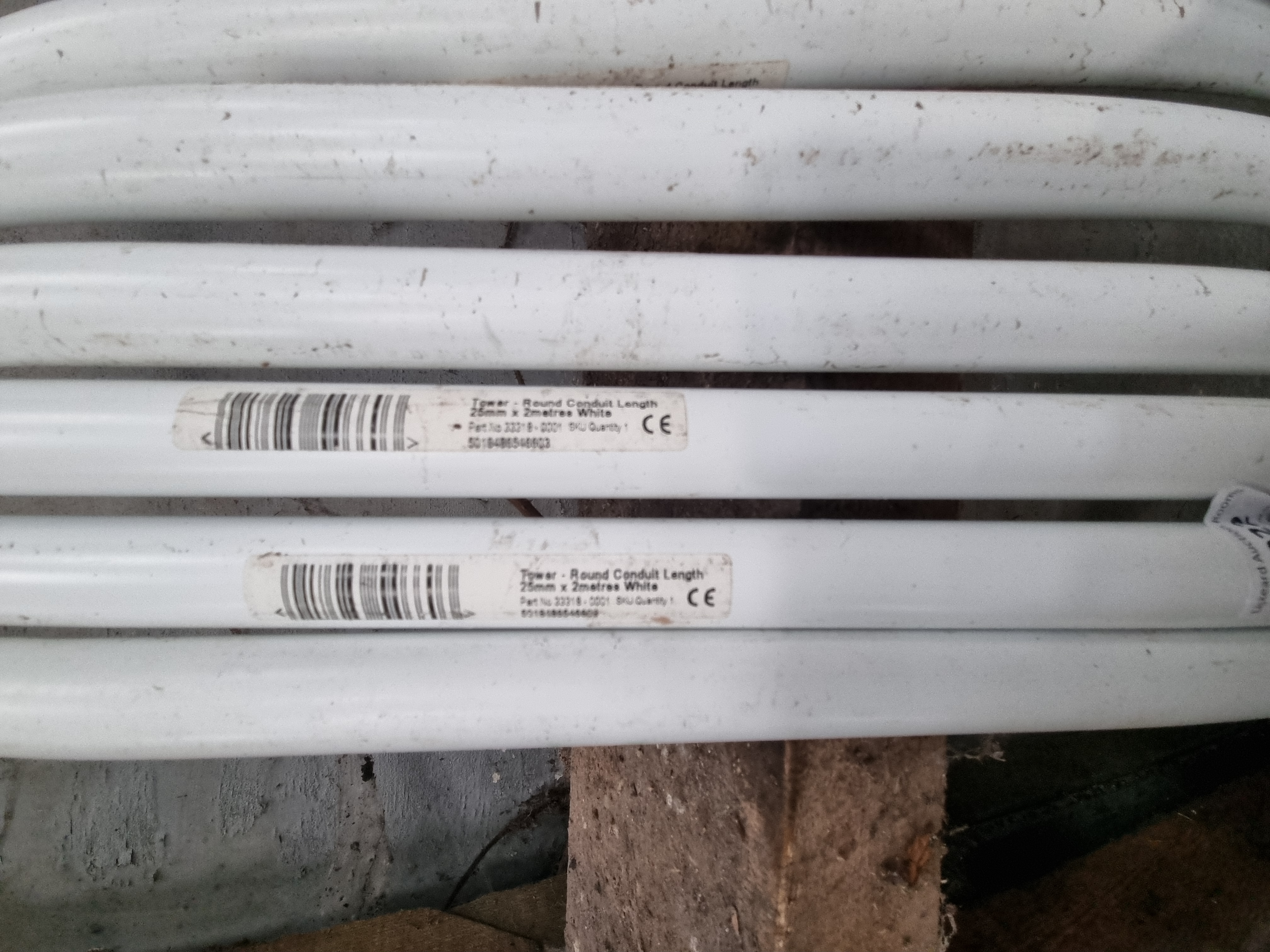 A collection of 11 white plastic round conduit lengths manufactured by Tower. Each length is constructed from white PVC and features a circular profile. The items bear manufacturer labels identifying them as Tower Round Conduit Length and include the CE mark. The labels also specify the dimensions and include barcodes. These items are designed for the containment and protection of electrical cables in various installations.