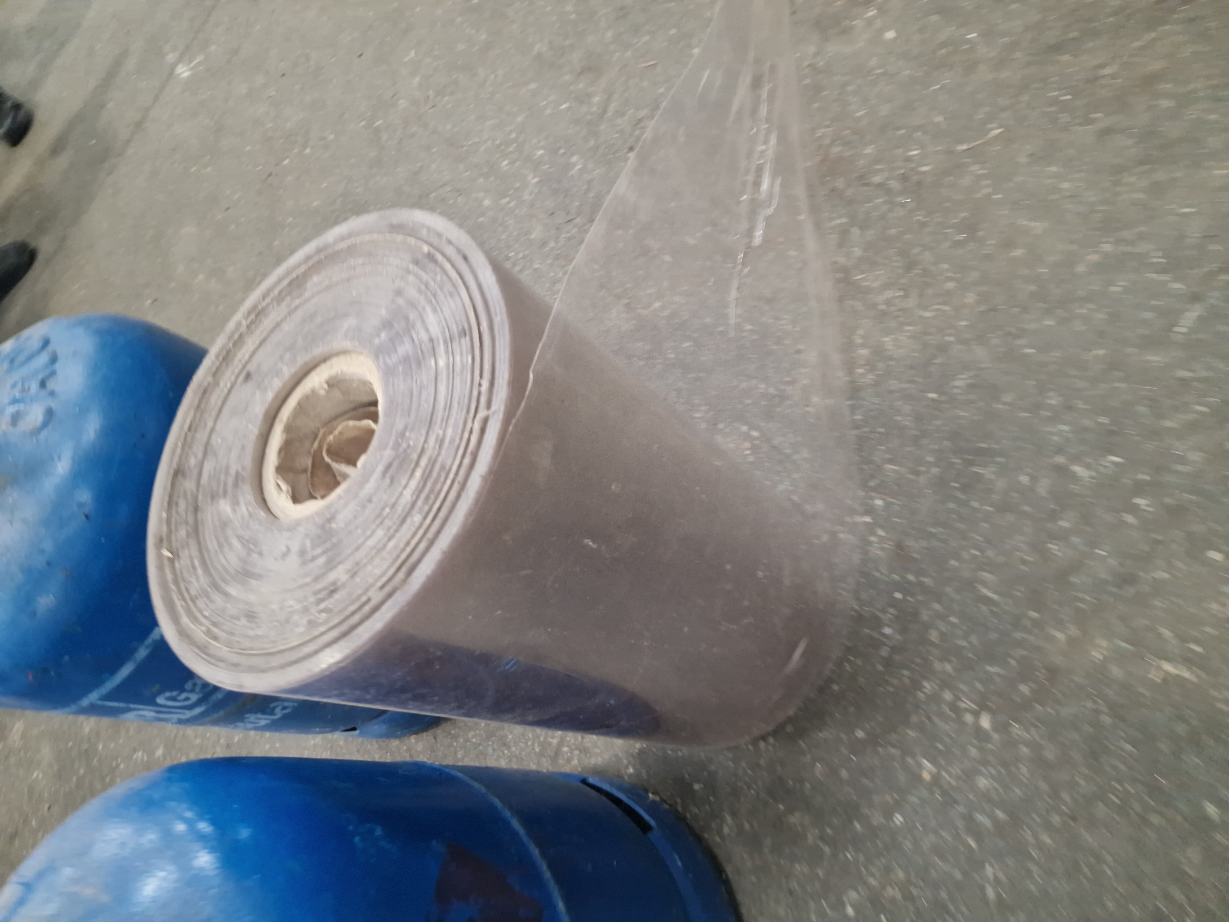 The gas cylinders are in used condition, showing visible scuffing and scratches to the blue paintwork. There are signs of minor surface oxidation and general industrial soiling across the bodies. The roll of plastic sheeting is used and exhibits surface dust and marks consistent with storage in a warehouse or industrial environment.