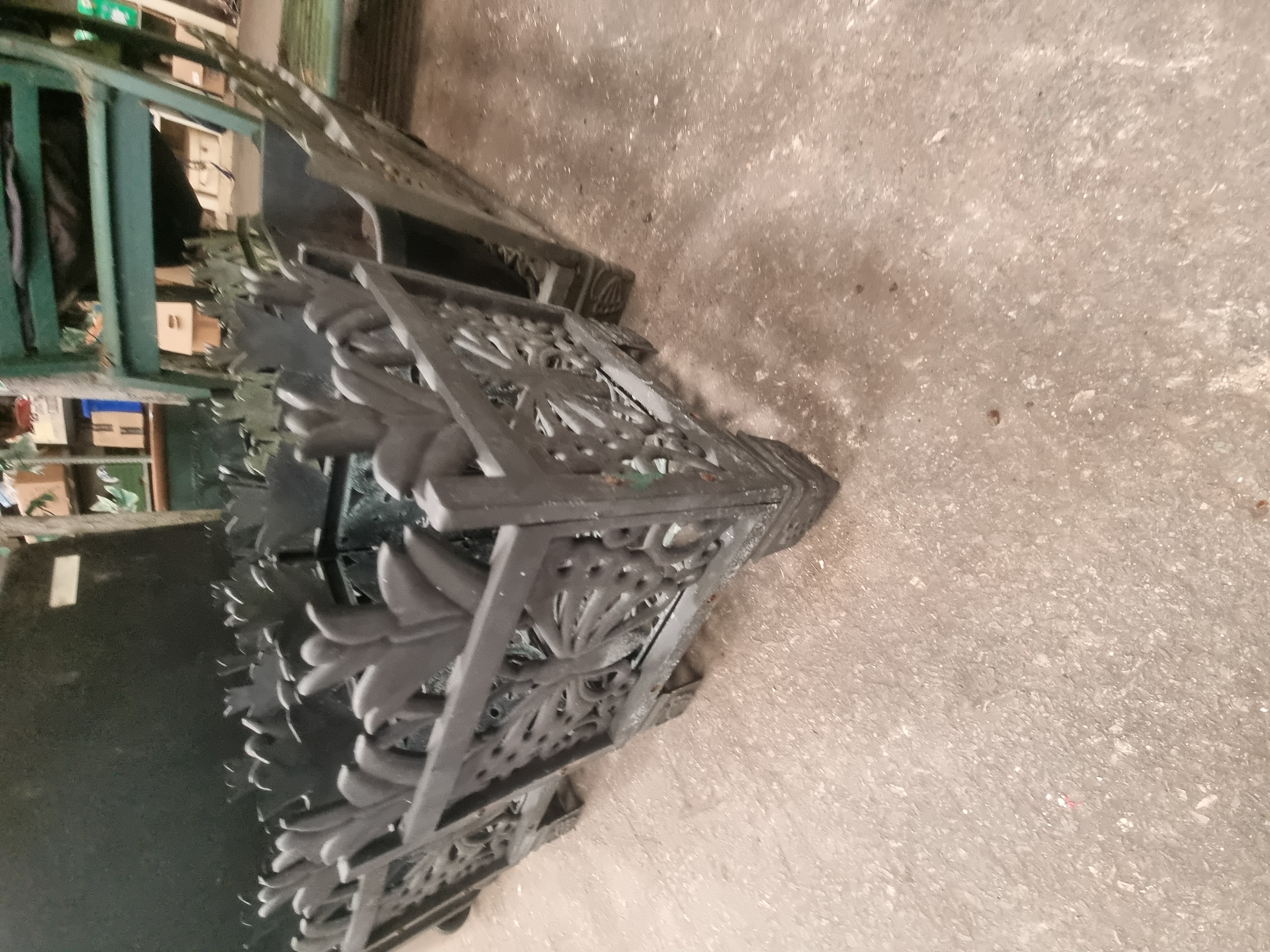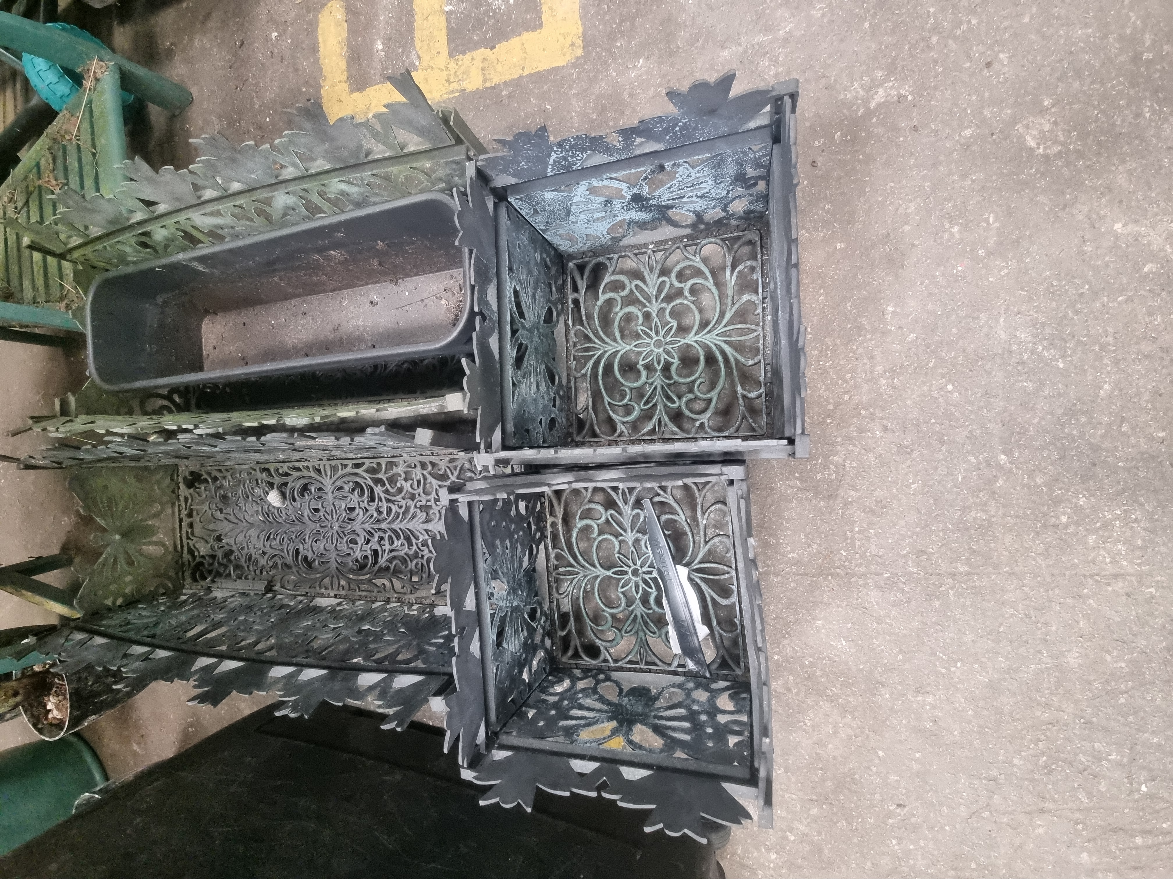 A set of four garden planters comprising two square-form planters and two rectangular trough planters. Each piece is constructed from cast iron effect plastic and features ornate pierced side panels with scrolling foliate and fleur-de-lis motifs. The upper rims are finished with a continuous decorative cresting of alternating leaves and fleurs-de-lis. The square planters feature matching decorative lattice-work bases. One rectangular trough is fitted with a removable black plastic liner. No maker’s marks or foundry stamps are visible.